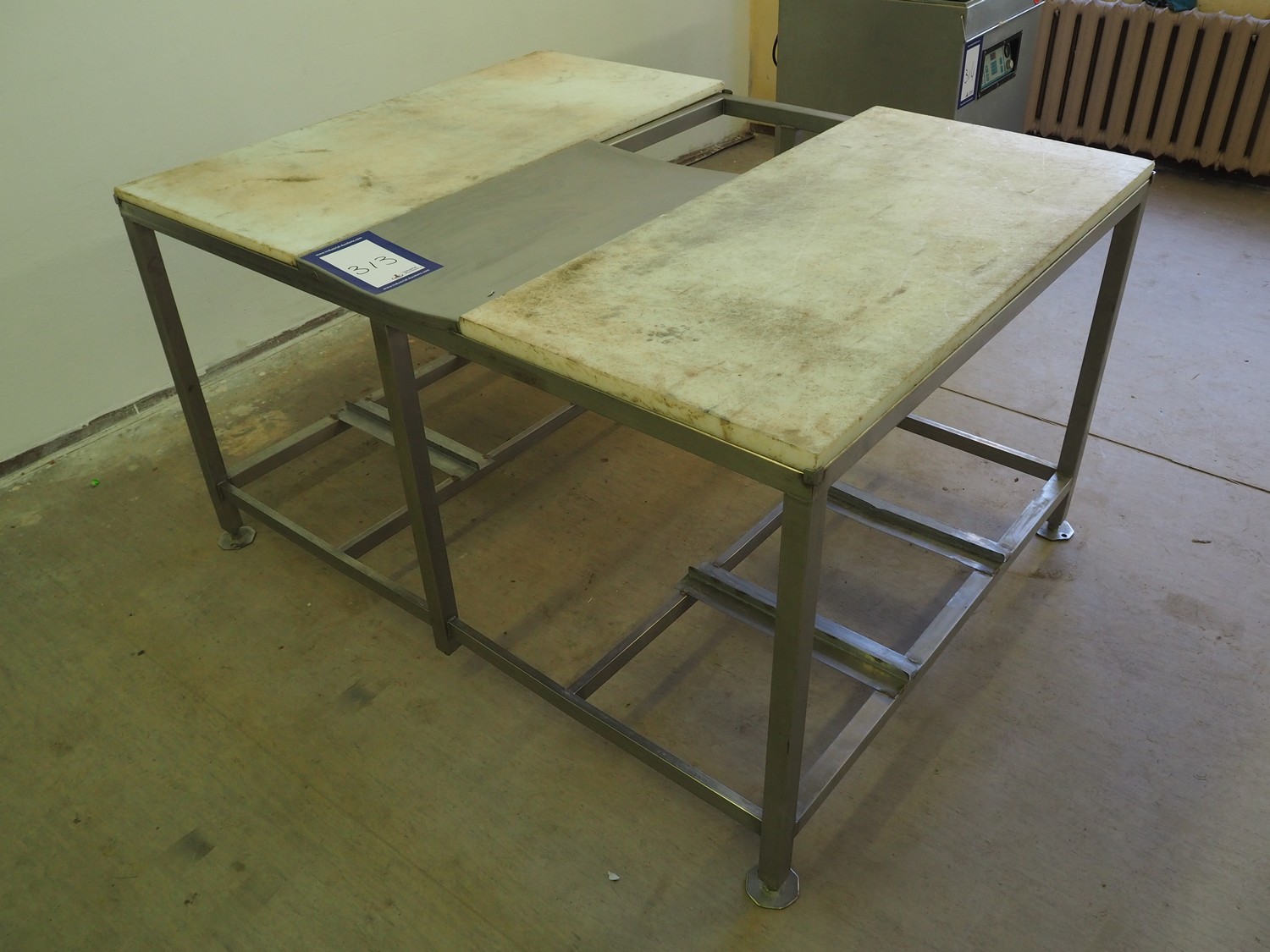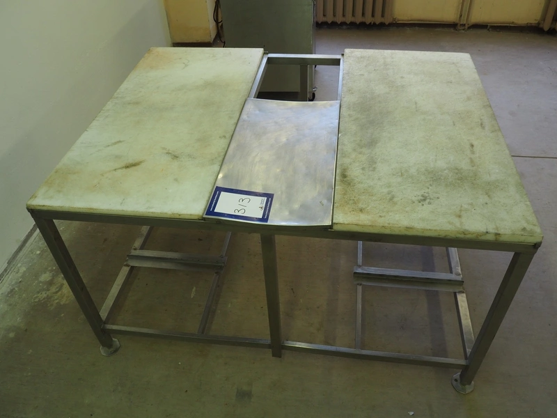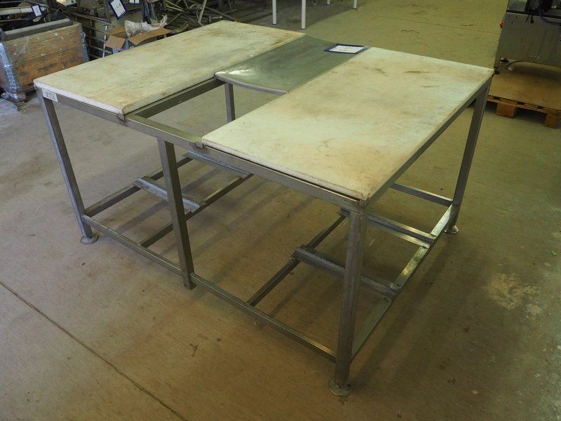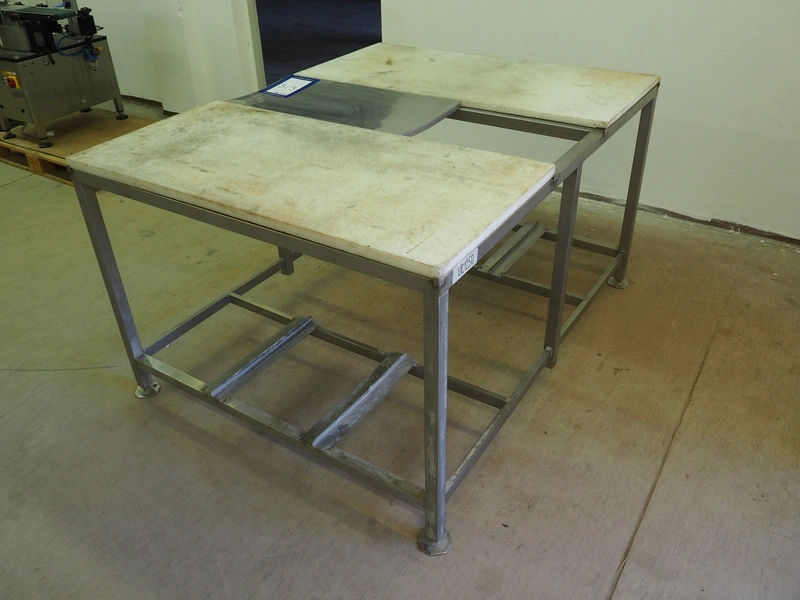 S/s table with 2 plastic work tops, dimensions: 1600 mm x 1250 mm x 890 mm.