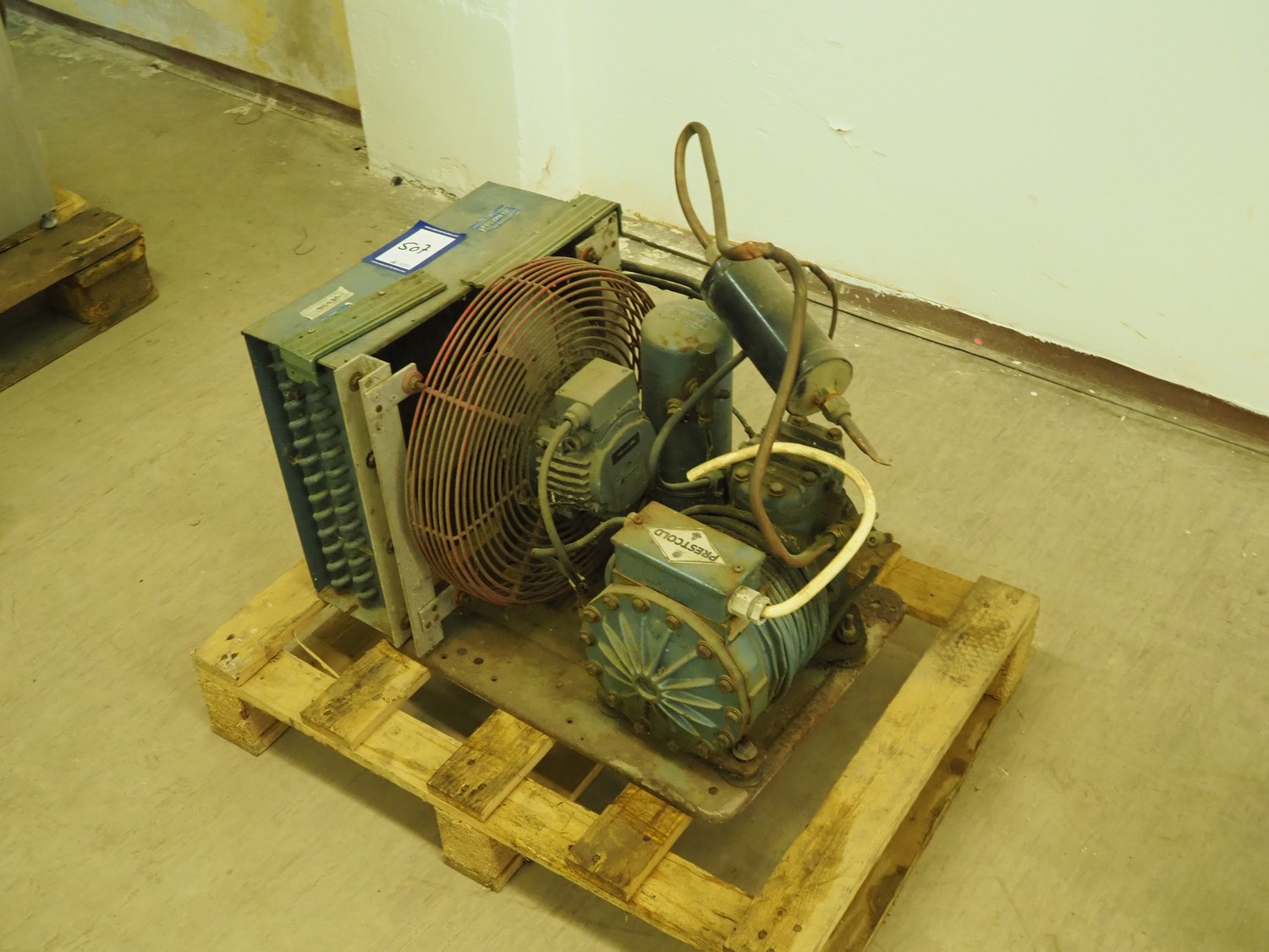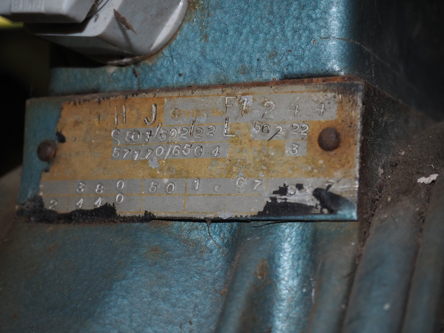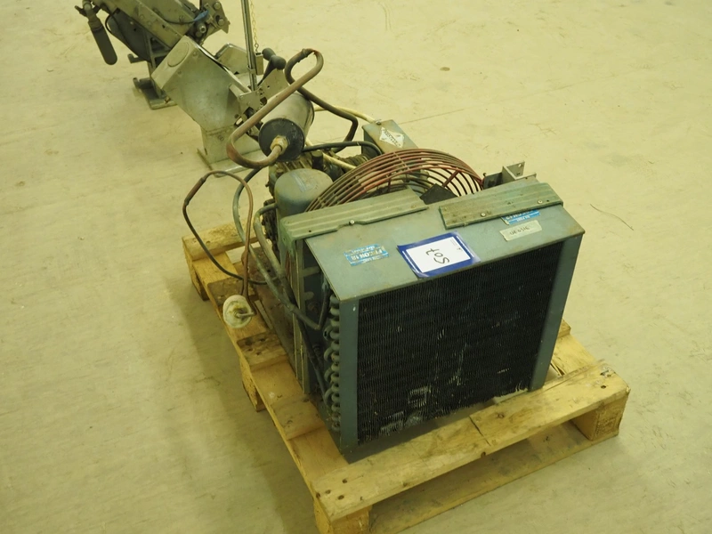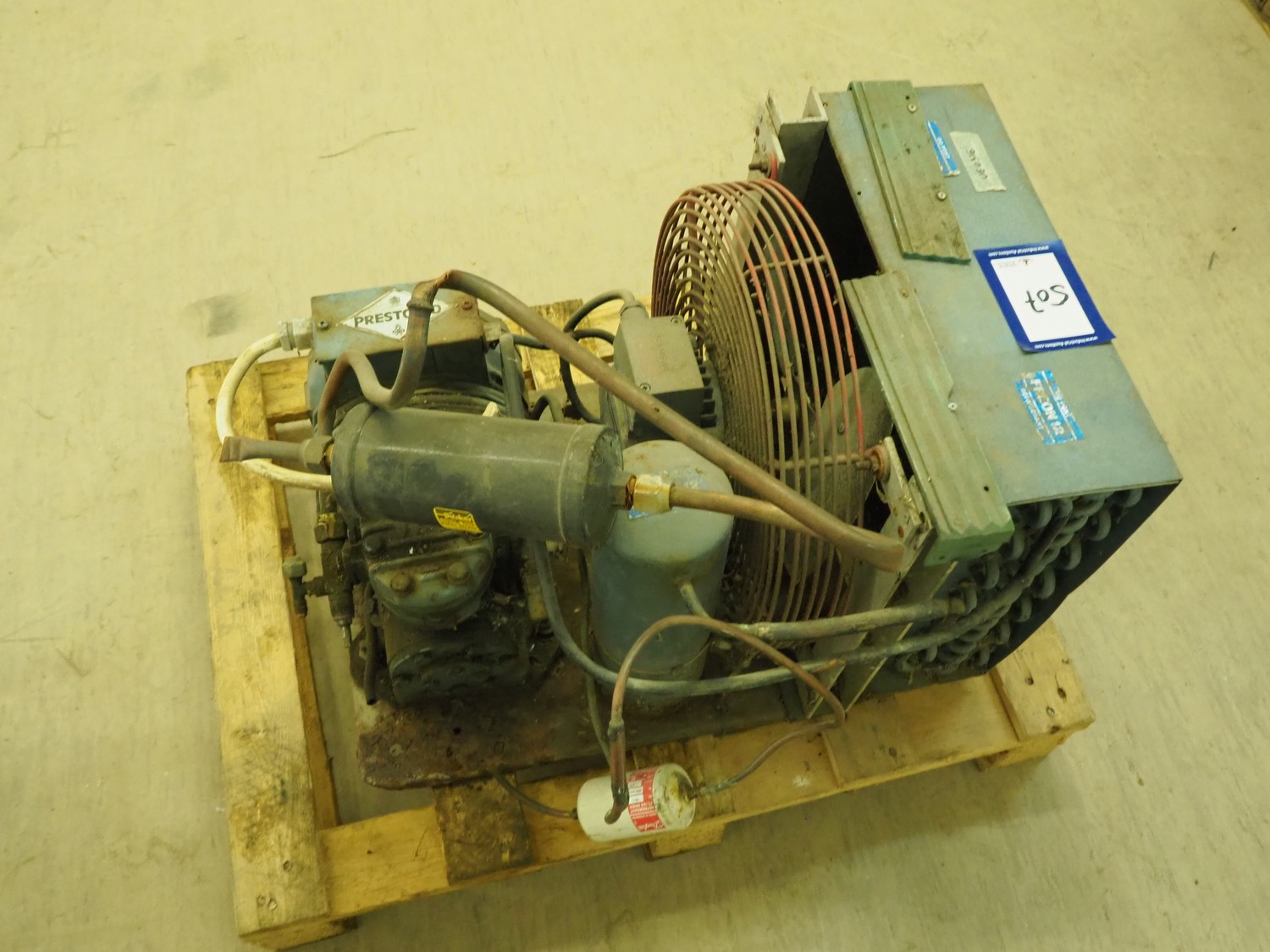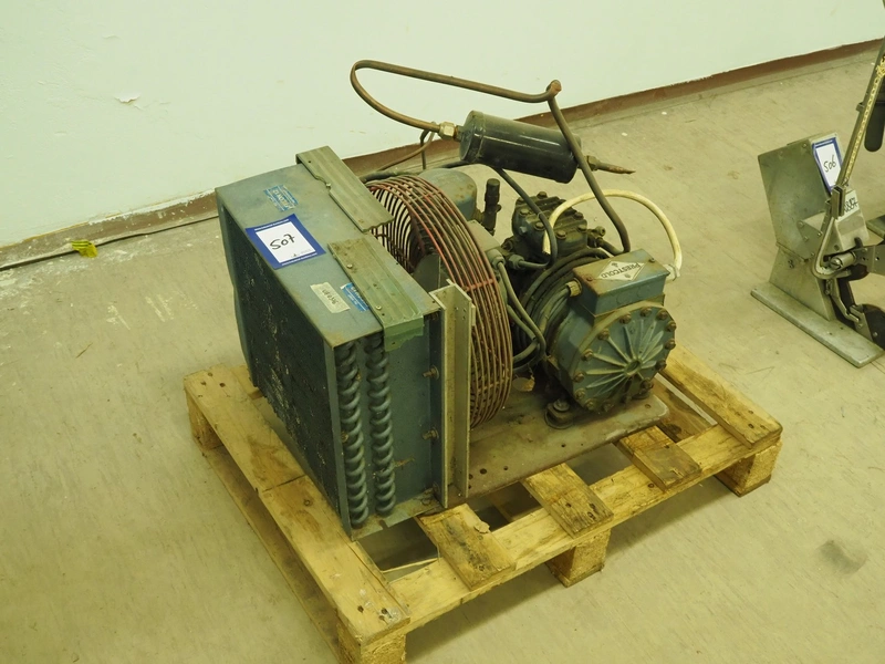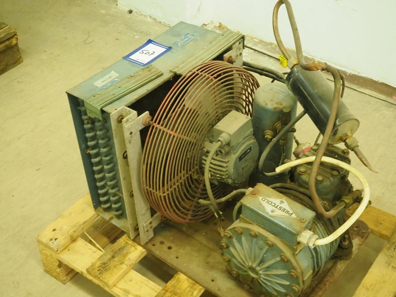 Prestcold cooling compressor, type: HJ, serial number: F1244, 380/440 V, 3 Ph, 50 Hz, dimensions: 630 mm x 430 mm x 370 mm.