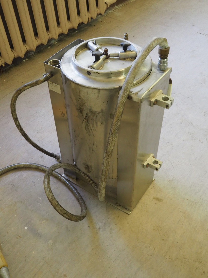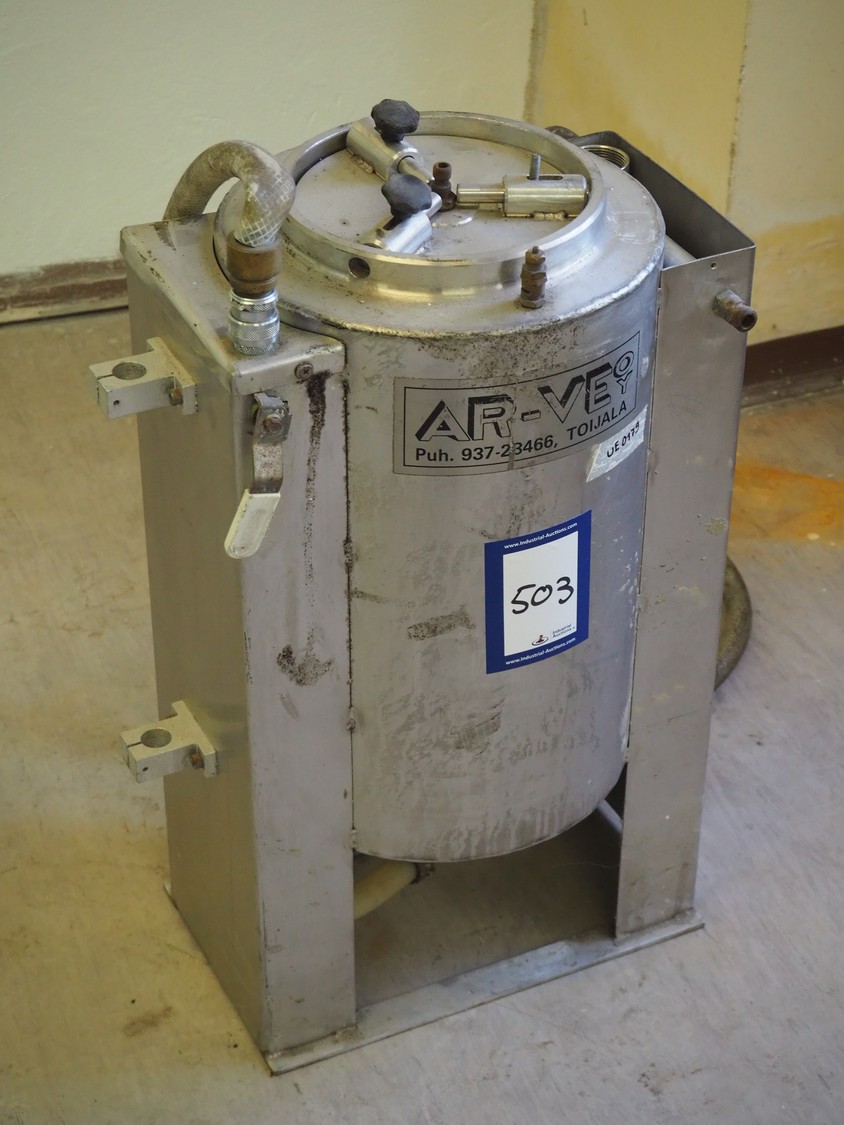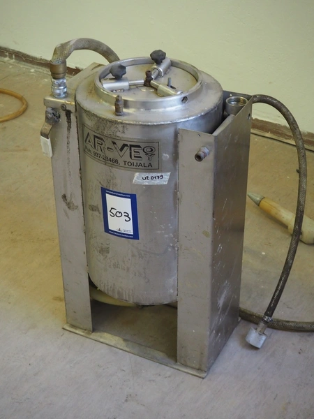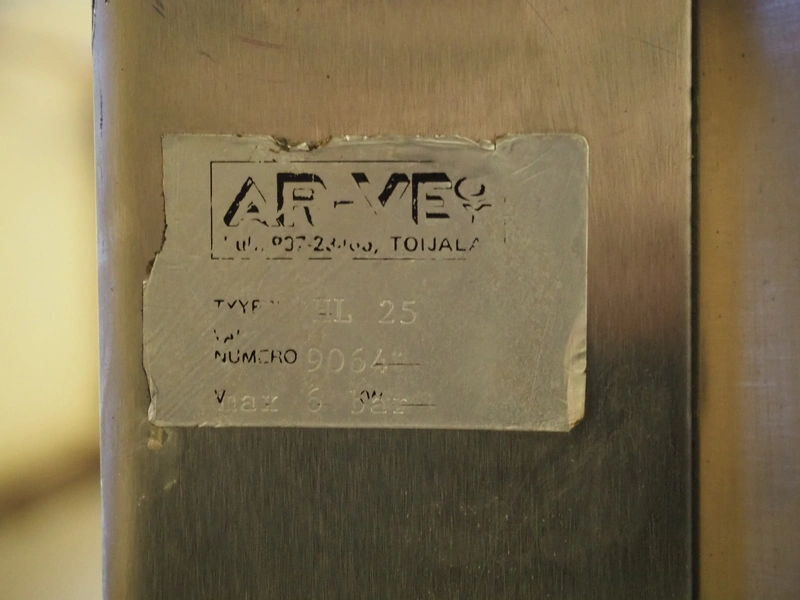 AR-VE Oy pressure vessel, type: HL 25, number: 9064, maximum pressure: 6 bar, inside dimensions: Ø 250 mm x 400 mm, total dimensions: 400 mm x 280 mm x 610 mm.