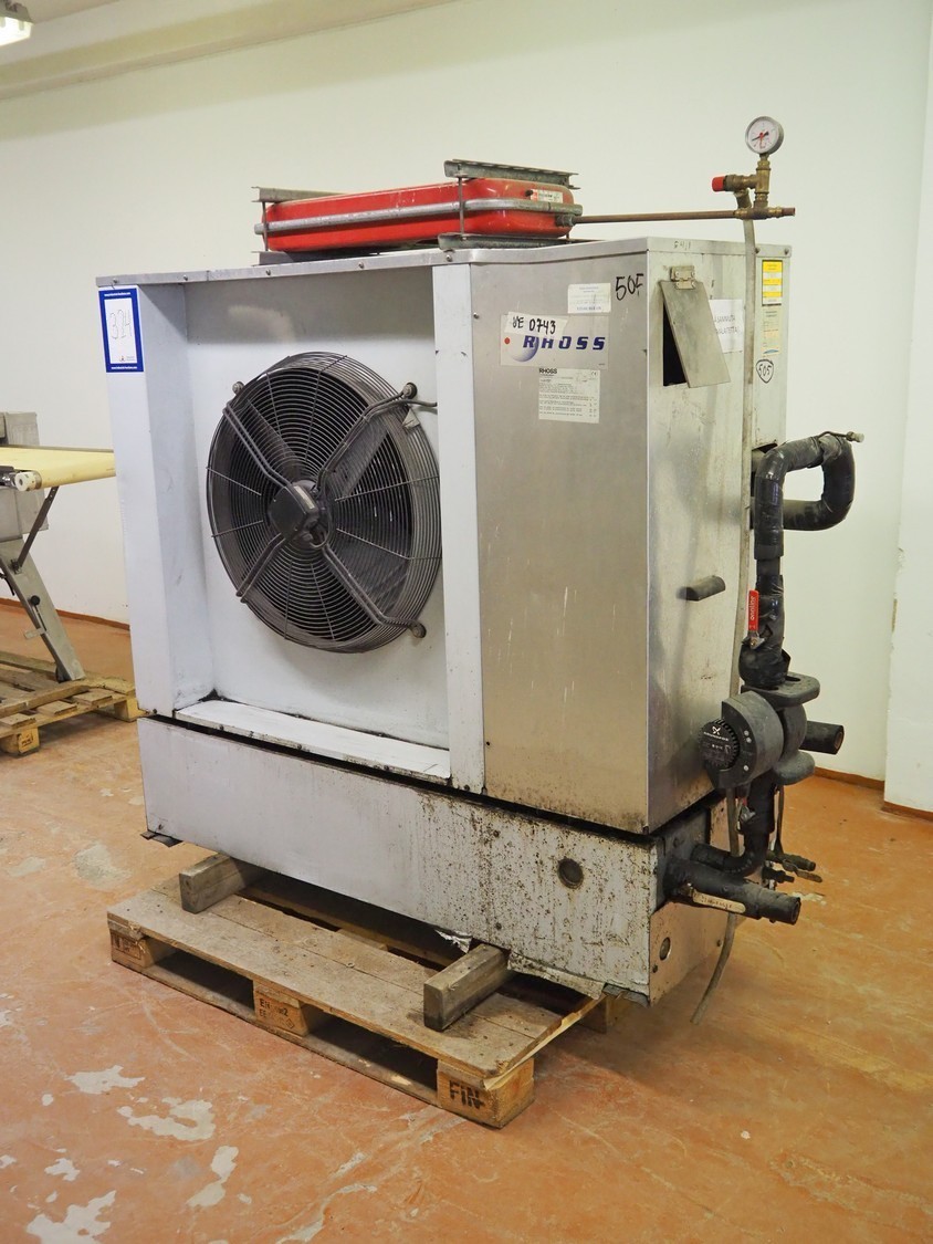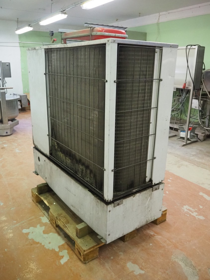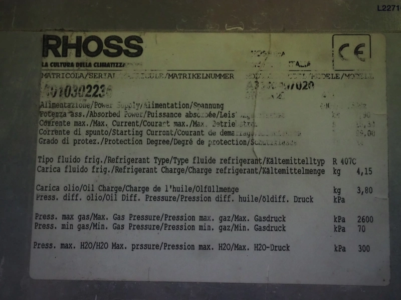 Rhoss chiller, model: A3300407020, serial number: 4010302236, 400 V, 50 Hz, 11.9 kW, refrigerant: R 407C, dimensions: 1800 mm x 700 mm x 1700 mm.