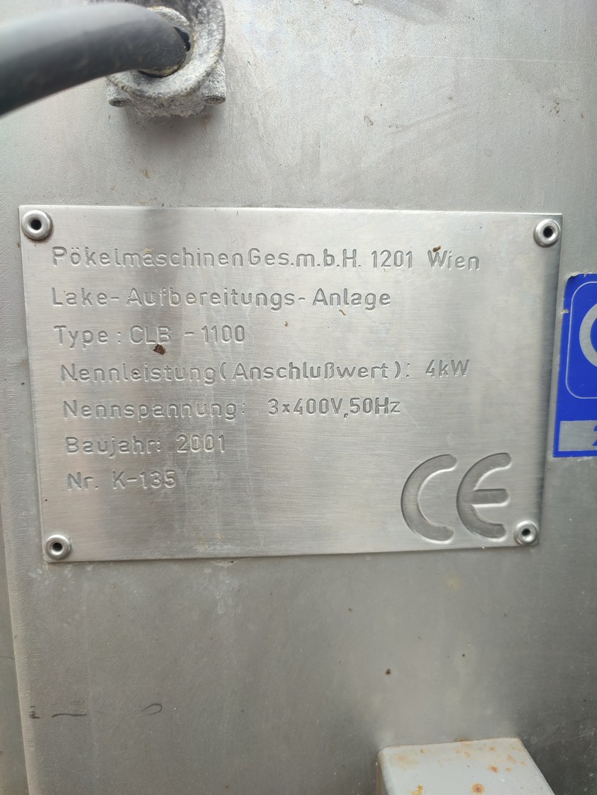 Inject Star brine preparation unit, type: CLB-1100, number: K-135, year of construction: 2001, 400 V, 3 Ph, 50 Hz, 4 kW, capacity: 1100 liter, dimensions: 2020 mm x 1520 mm x 1660 mm.