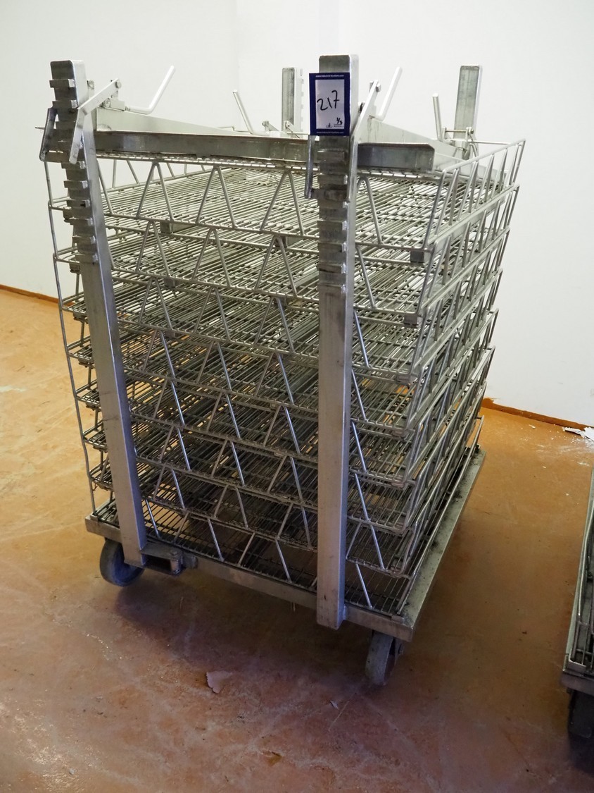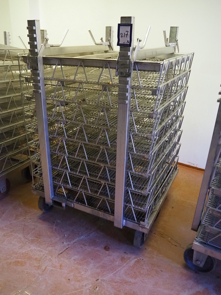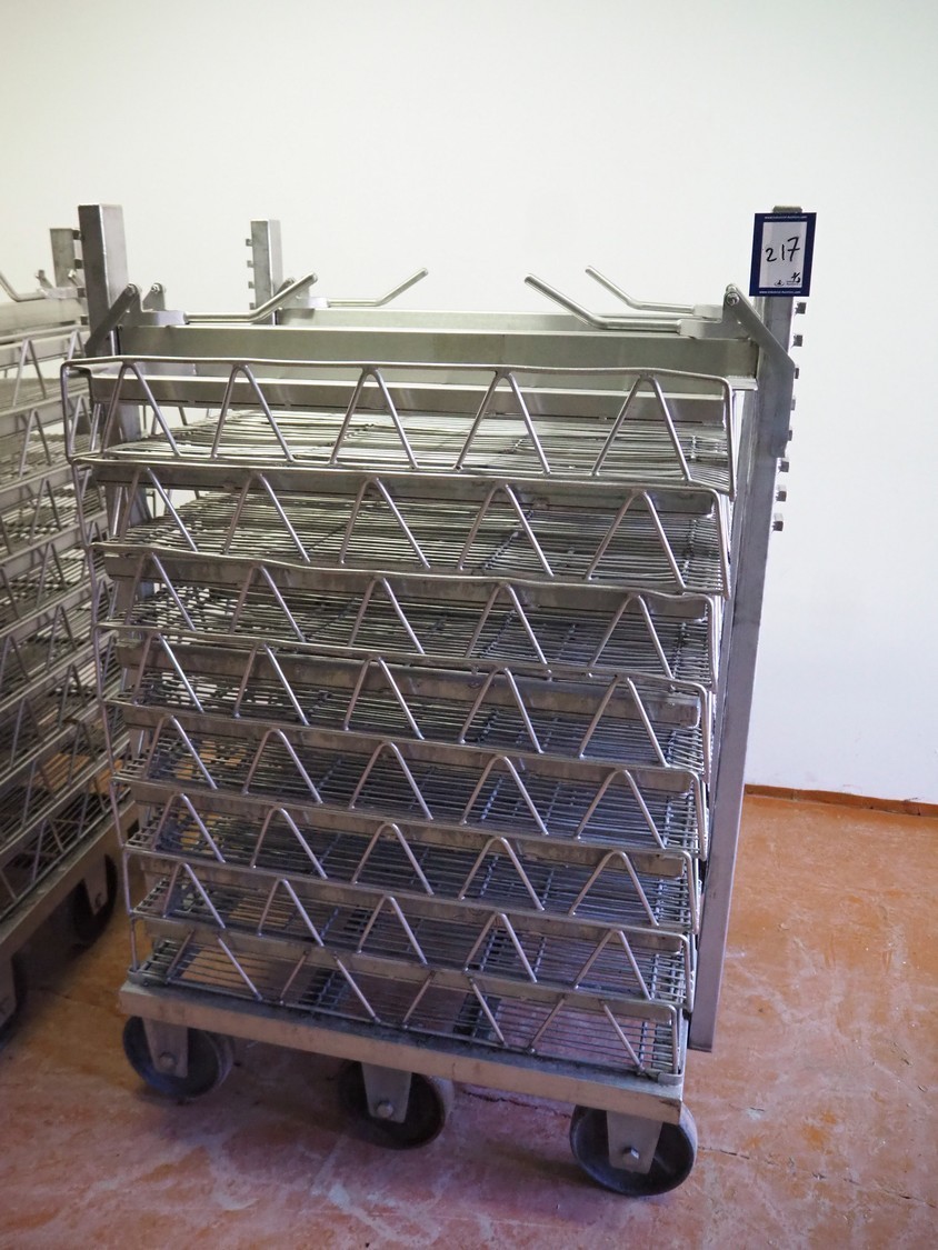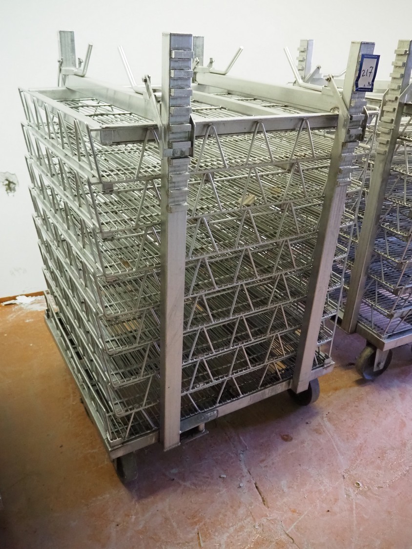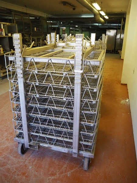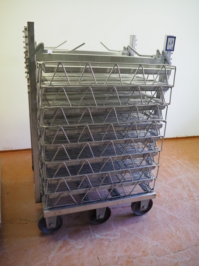 3 s/s autoclave trolleys with 24 baskets, dimensions baskets: 870 mm x 970 mm x 200 mm, dimensions trolleys: (3x) 900 mm x 1000 mm x 1500 mm.