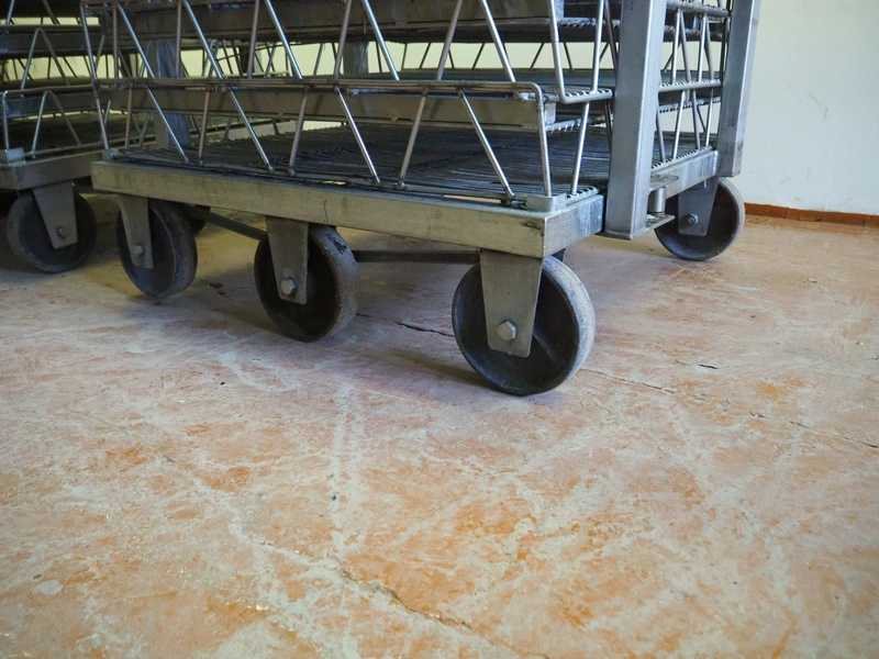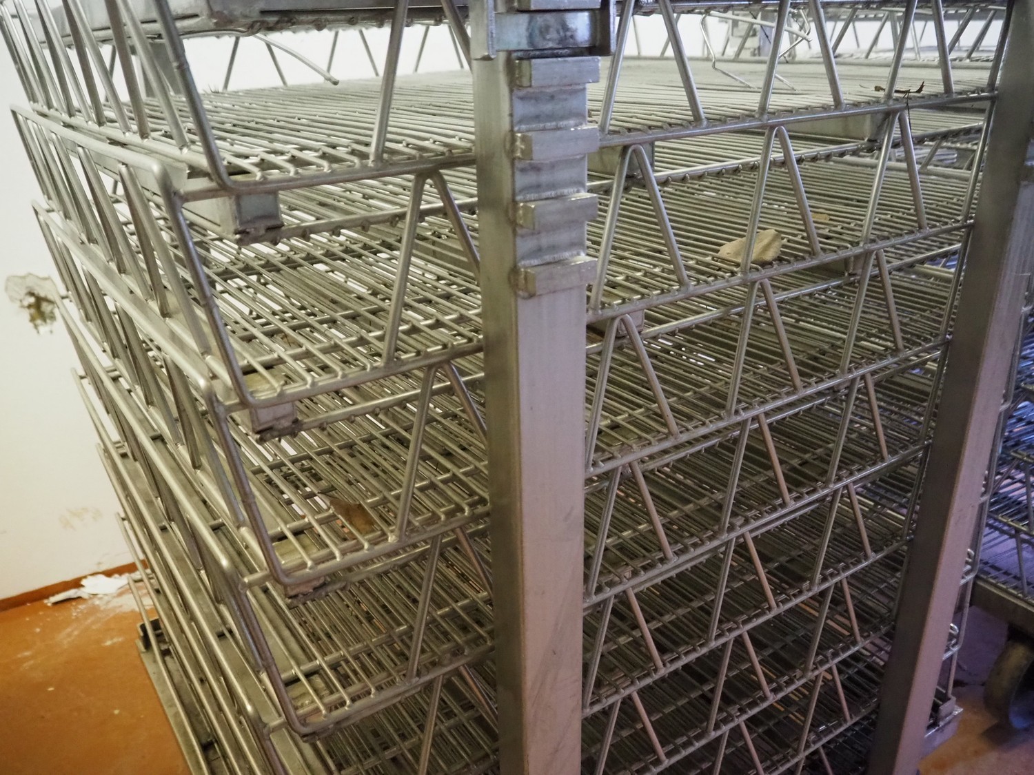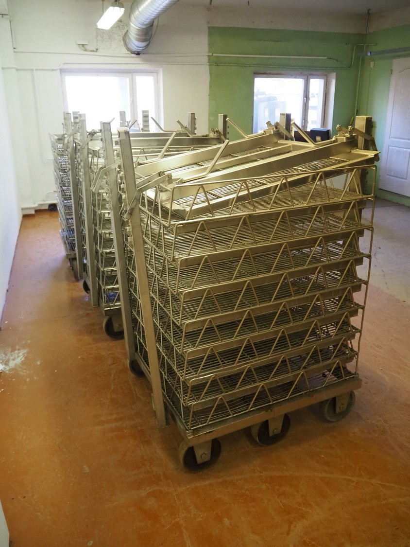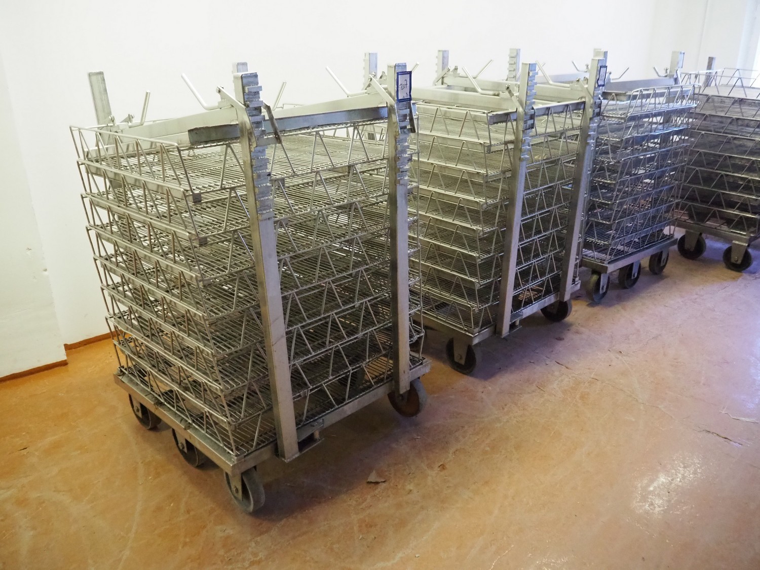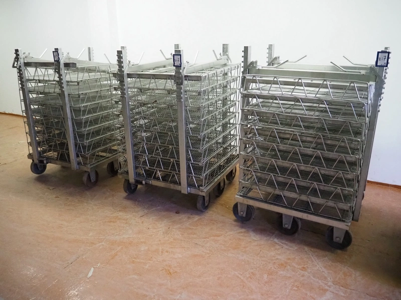 3 s/s autoclave trolleys with 24 baskets, dimensions baskets: 870 mm x 970 mm x 200 mm, dimensions trolleys: (3x) 900 mm x 1000 mm x 1500 mm.
