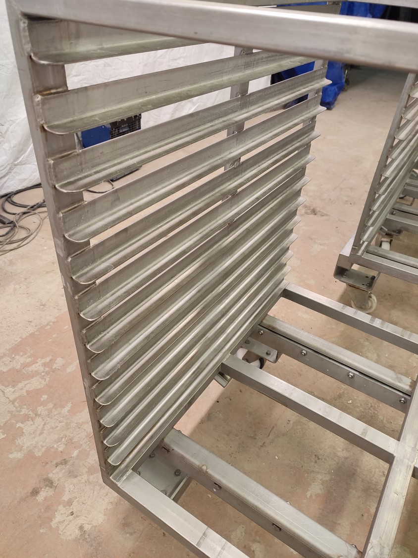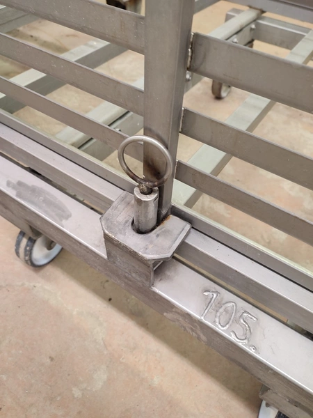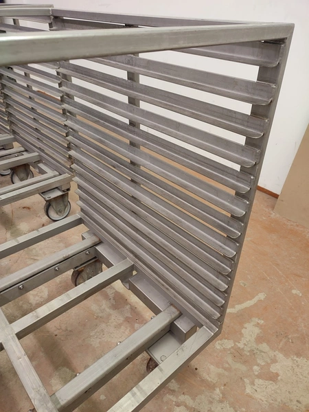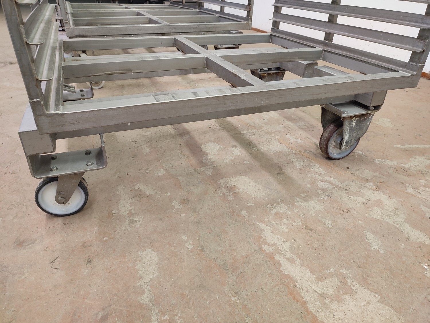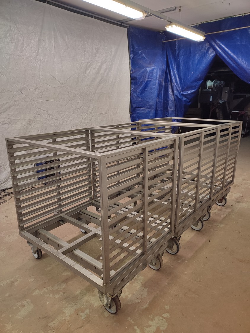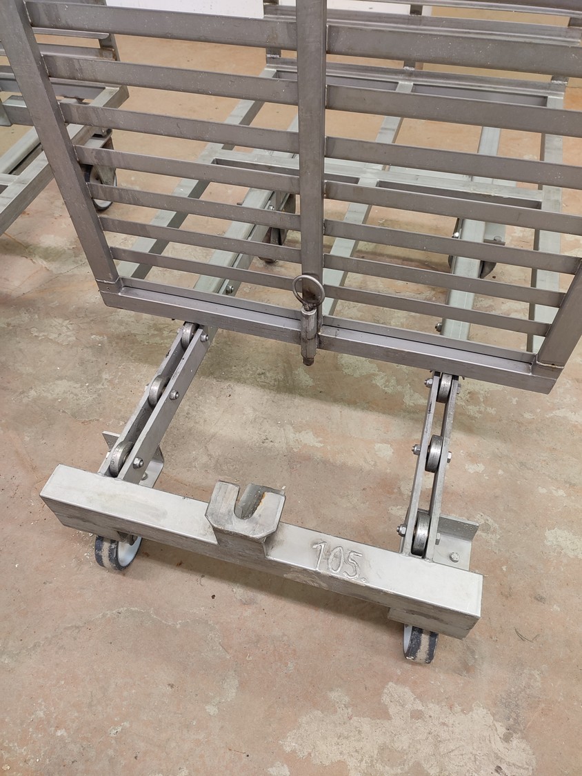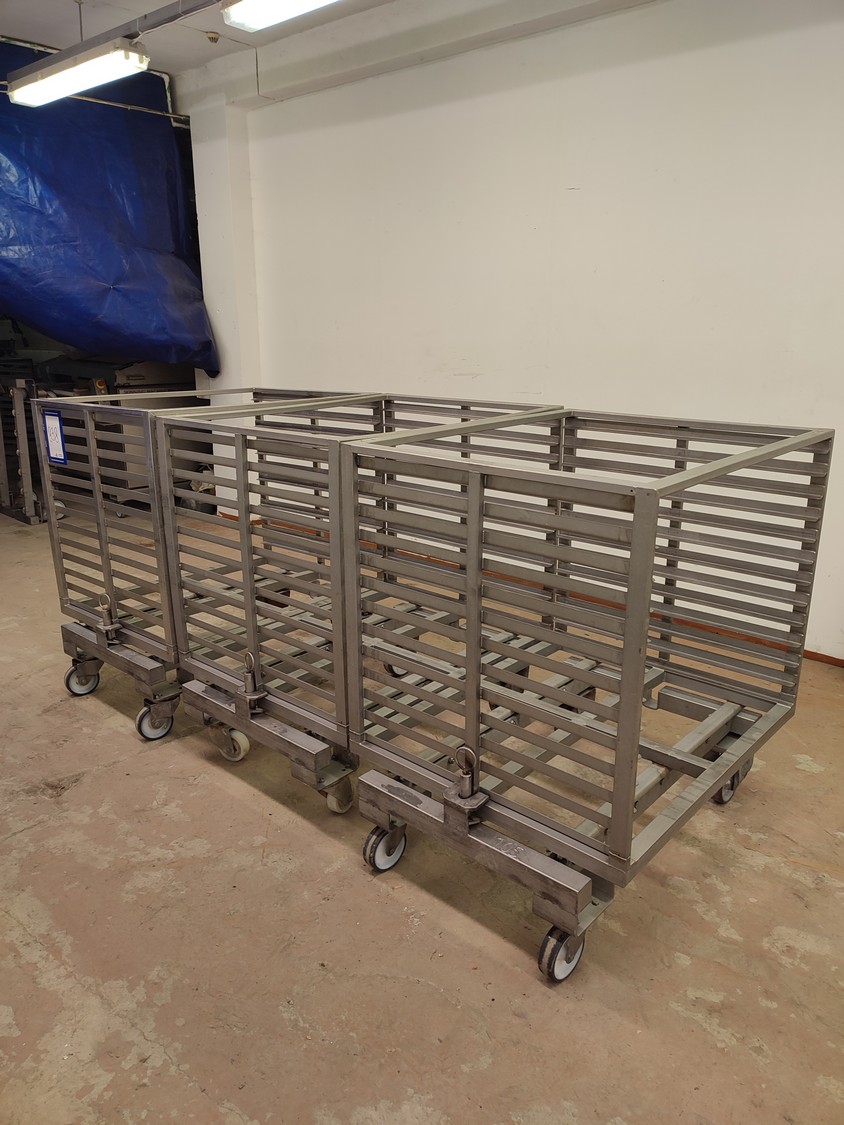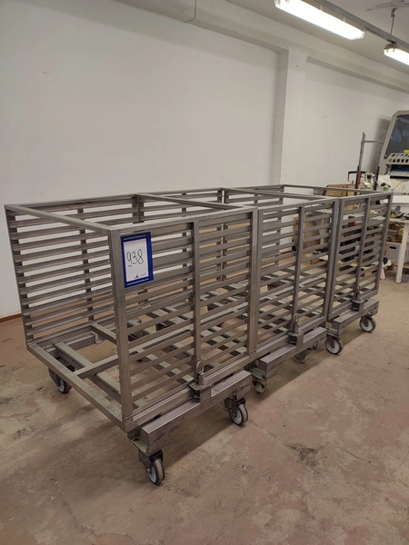 3 s/s autoclave trolleys, 13 floors each, dimensions each floor: 970 mm x 810 mm, distance between floors: 55 mm, total dimensions: (3x) 815 mm x 1045 mm x 1130 mm.