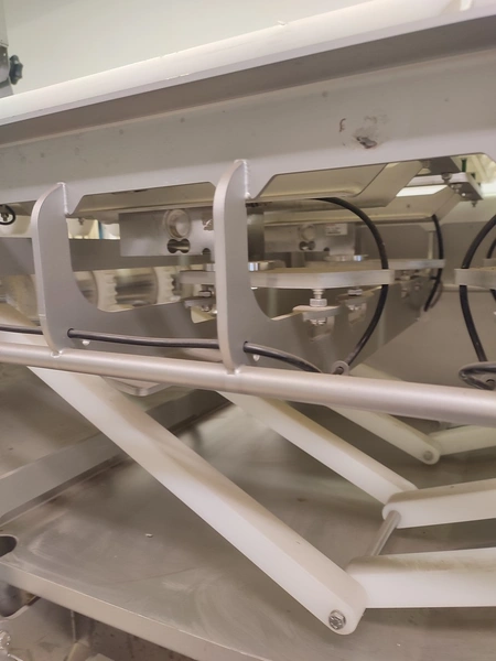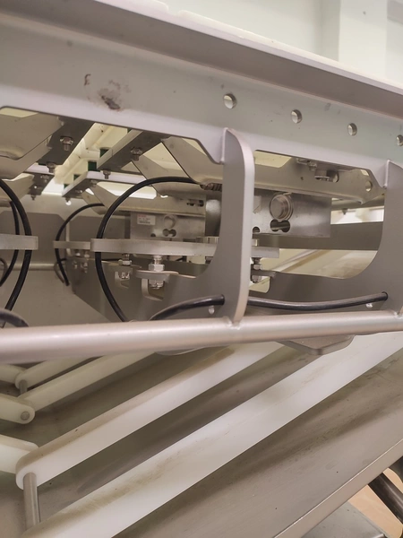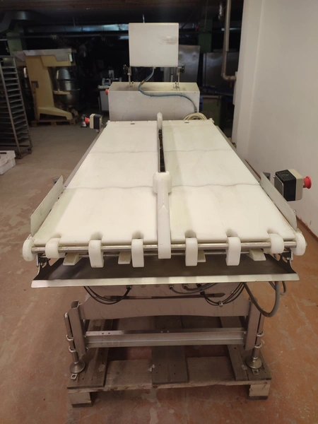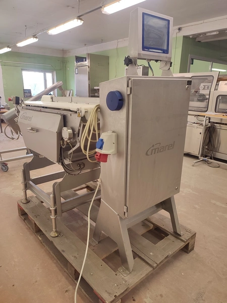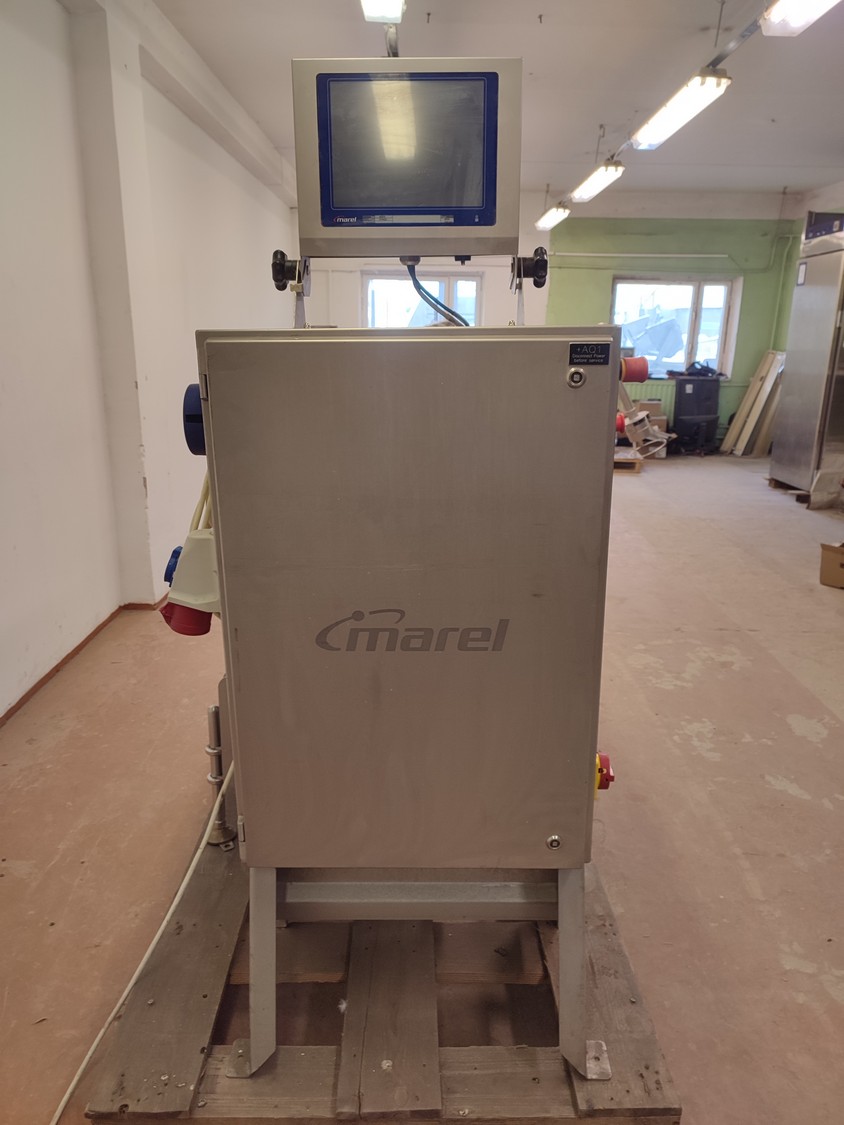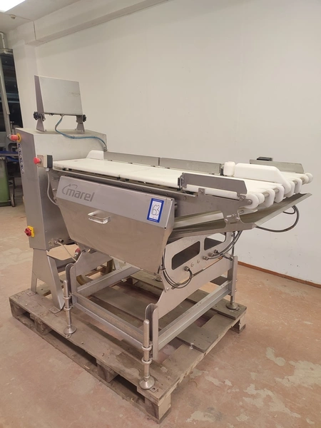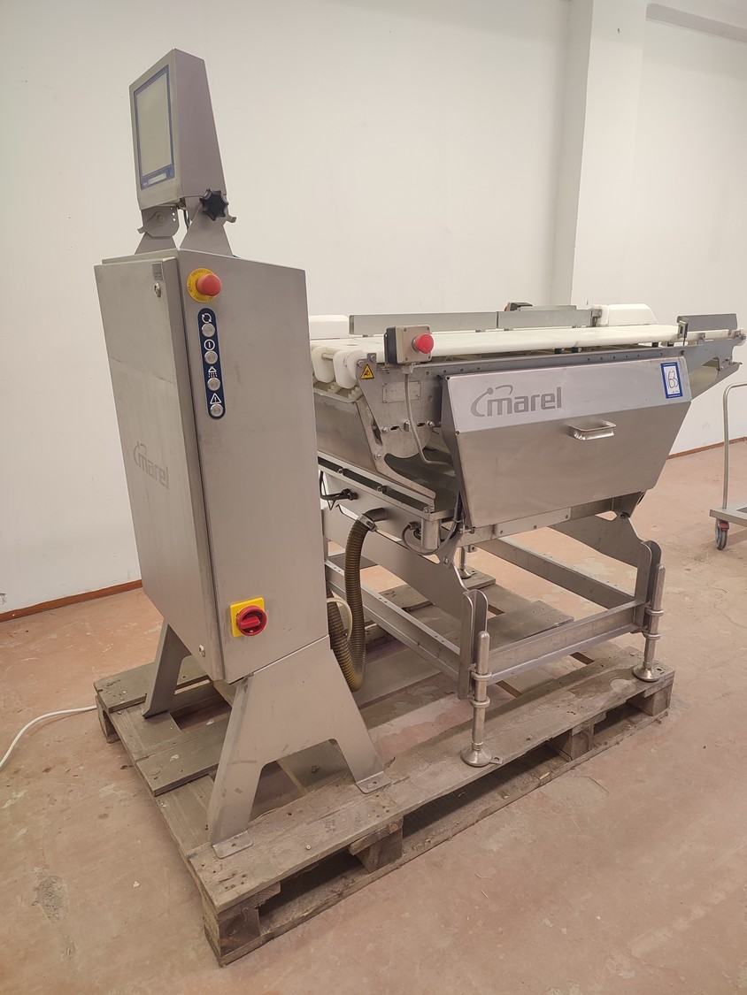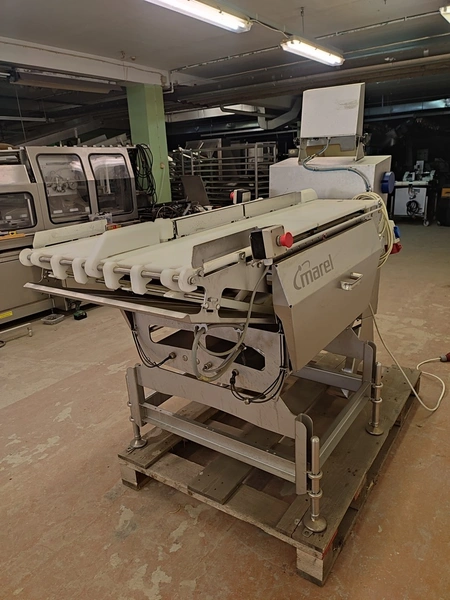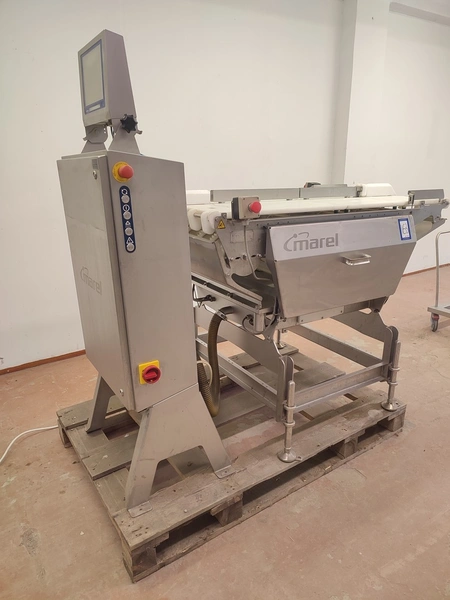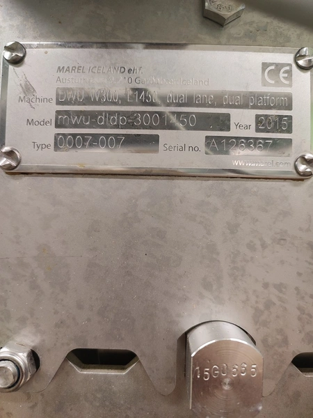 Marel checkweigher, model: mwu-dldp-3001450, type: 0007-007, serial number: A126367, year of construction: 2015, dual lane, dual platform, total dimensions: 1850 mm x 1000 mm x 1630 mm. Incomplete, missing belts.