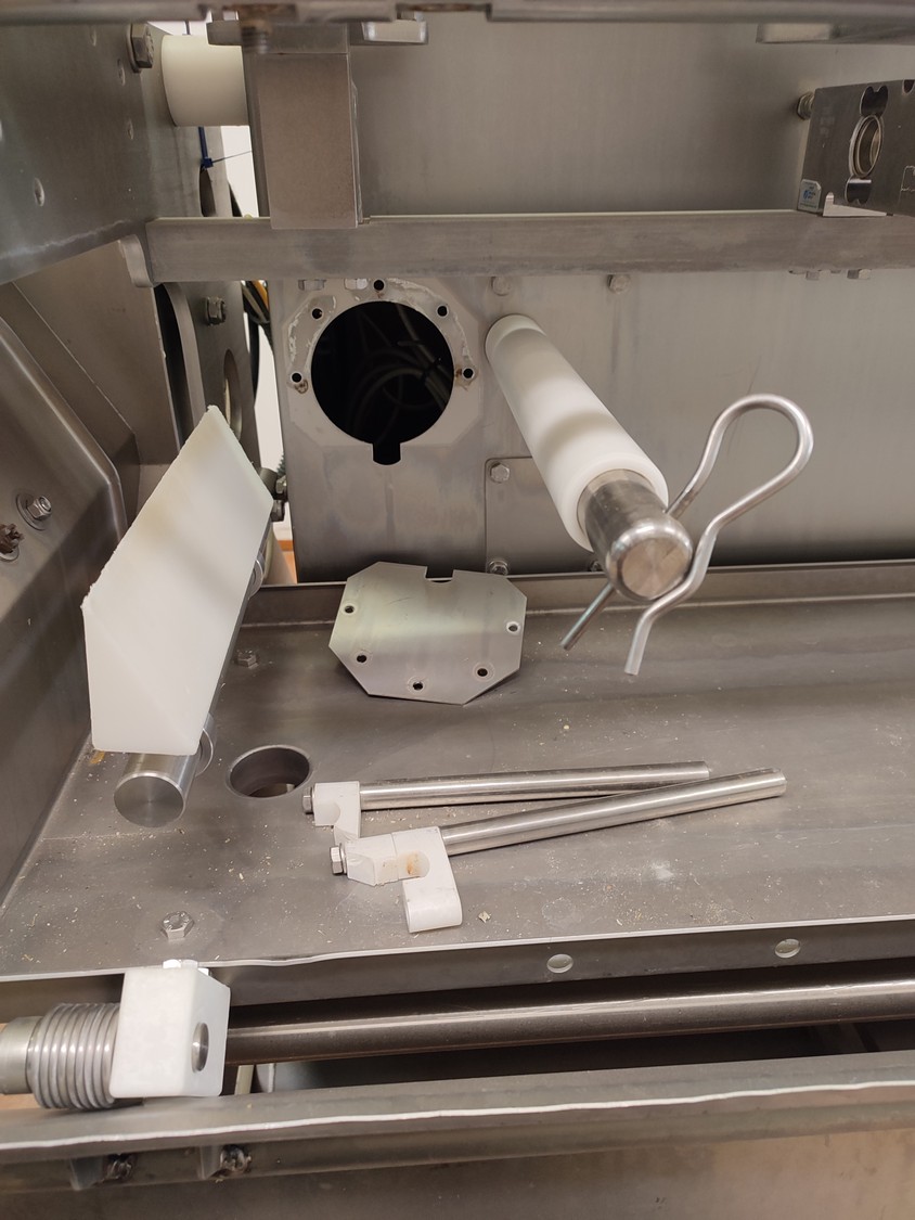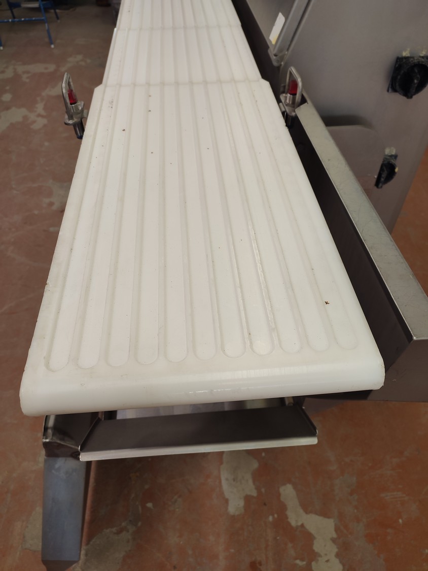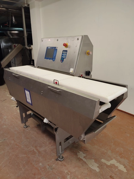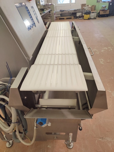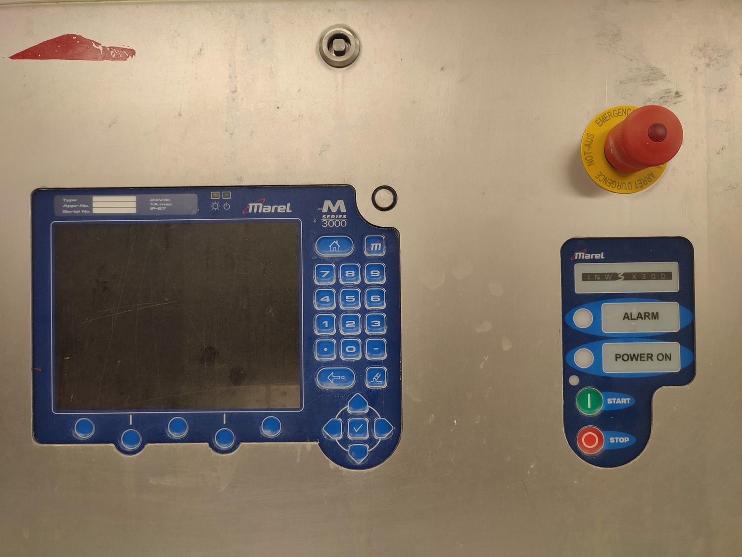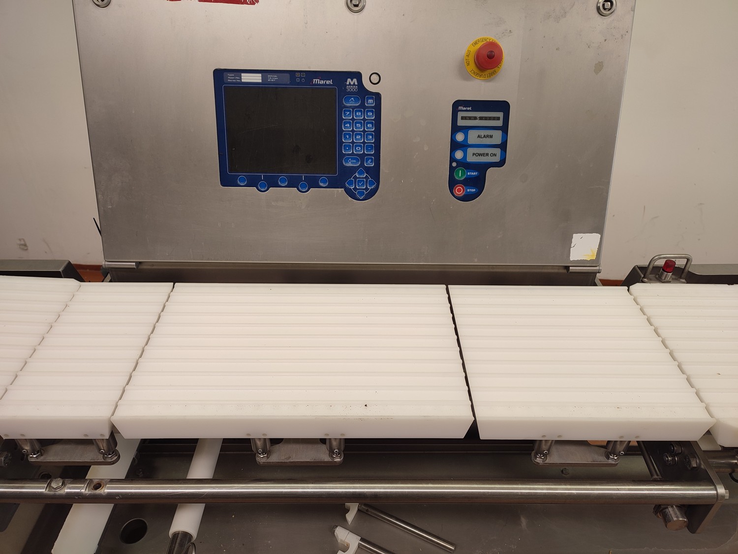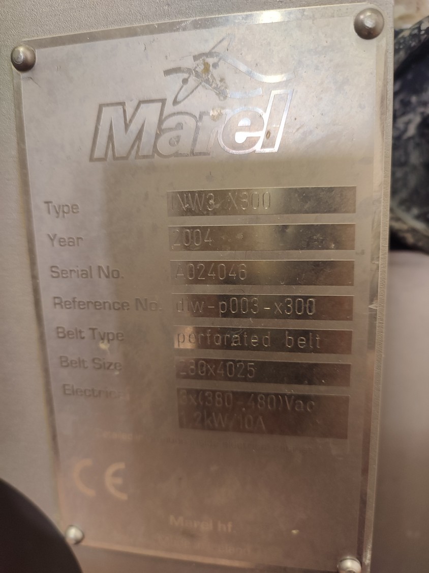 Marel checkweigher, type: INW3 X300, serial number: A024046, year of construction: 2004, 380/480 V, 3 Ph, 10 A, 1.2 kW, plastic belt, belt width: 280 mm, total dimensions: 1740 mm x 840 mm x 1500 mm. Incomplete, for spare parts.