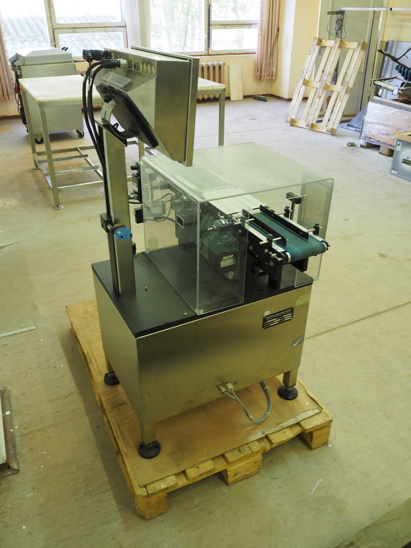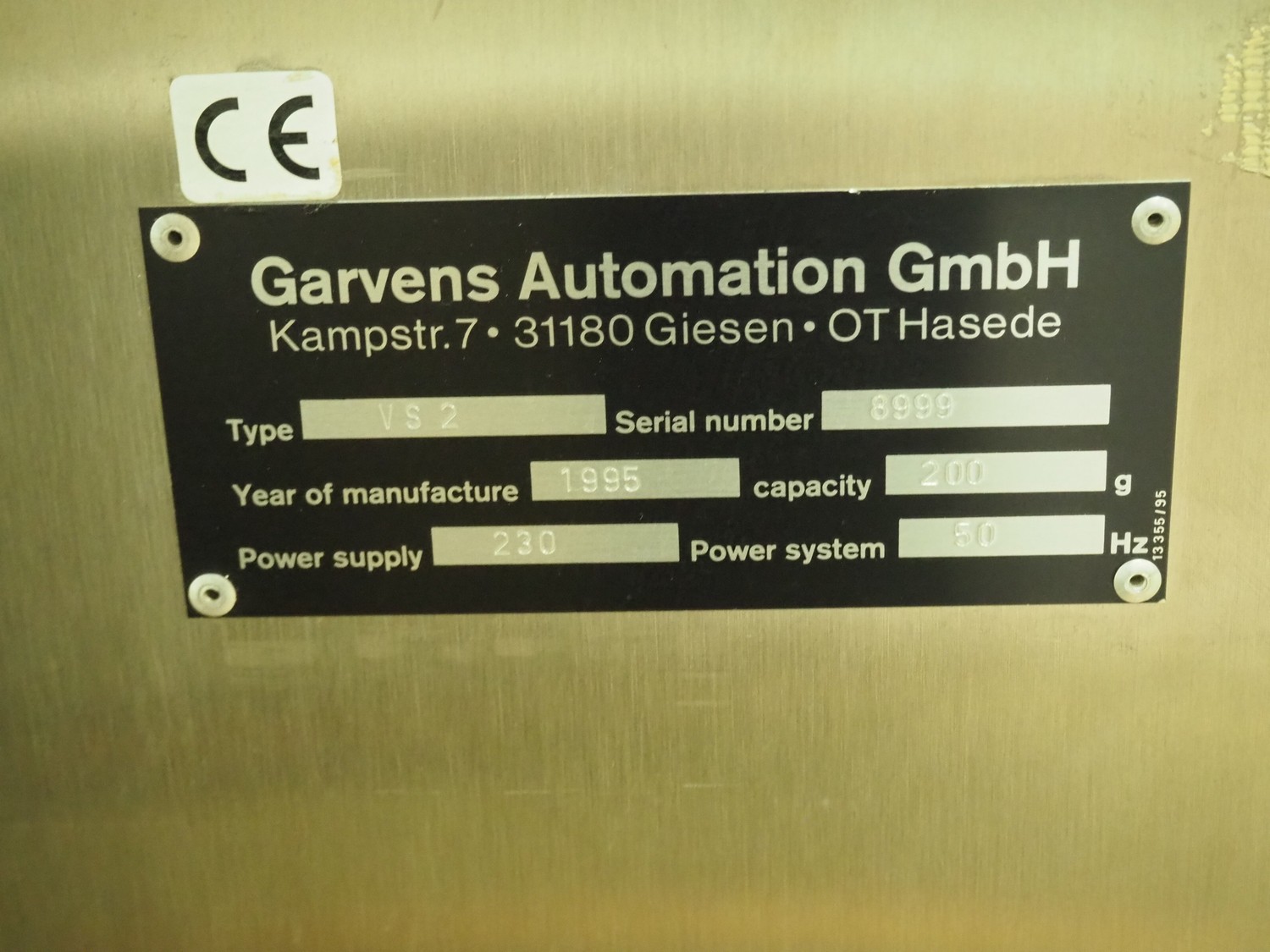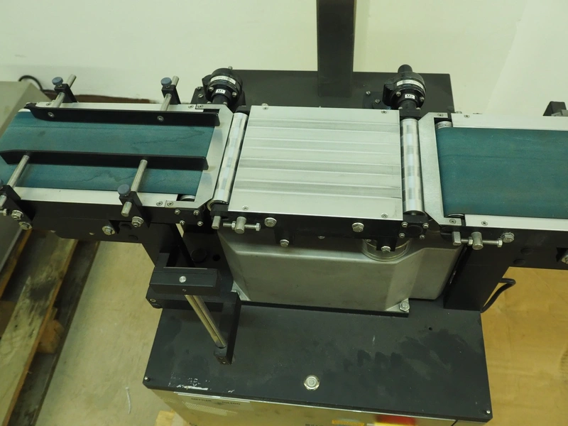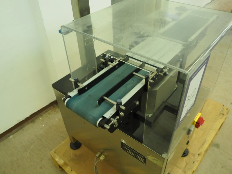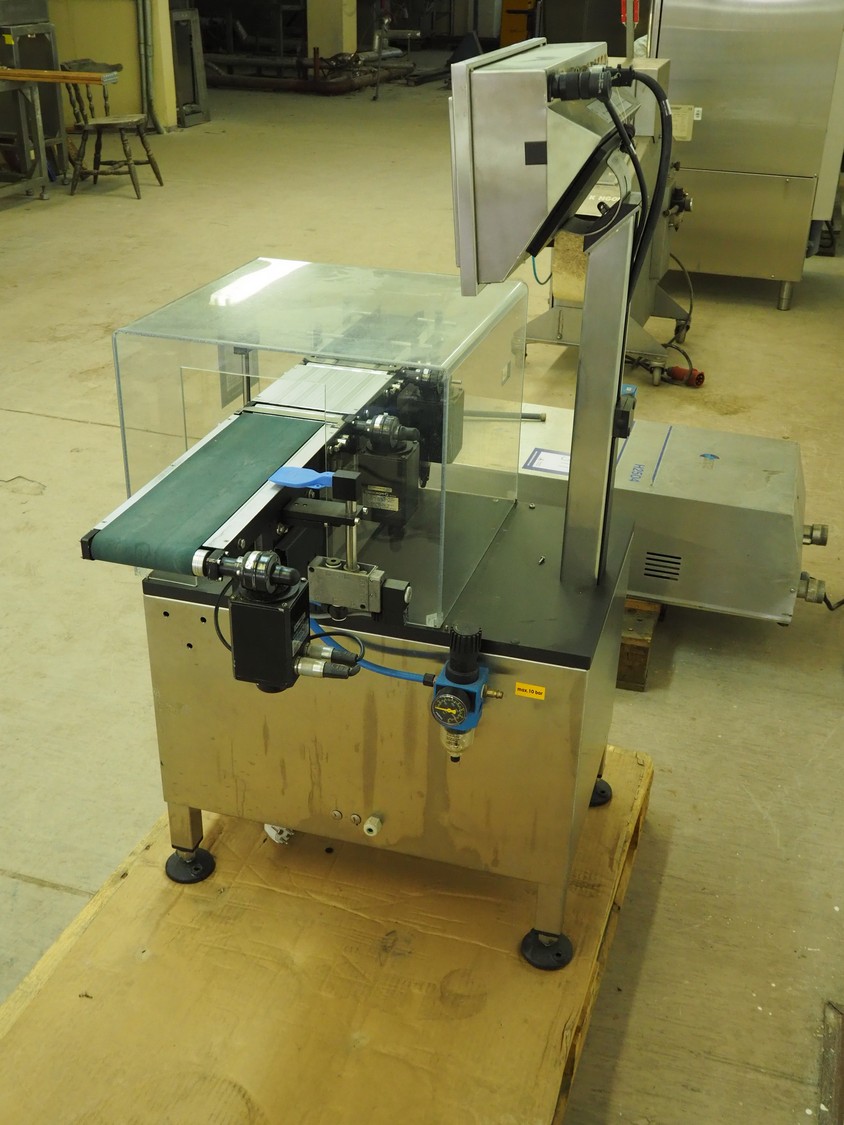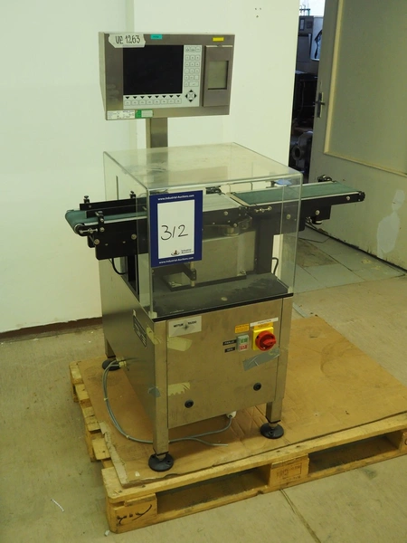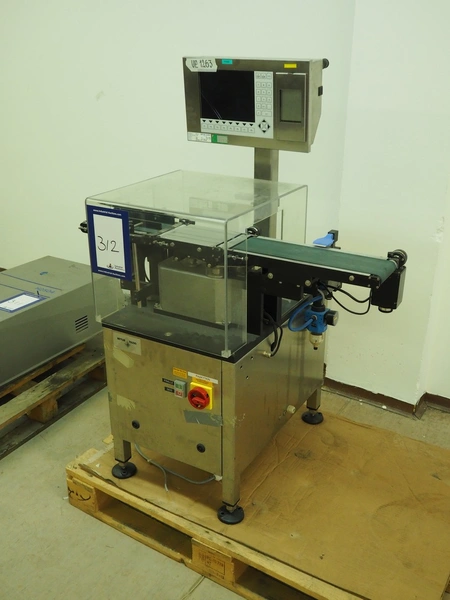 Garvens Automation GmbH checkweigher, type: VS 2, serial number: 8999, year of construction: 1995, 230 V, 50 Hz, capacity: 200 gram, plastic belt, belt width: (2x) 120 mm, total dimensions: 930 mm x 700 mm x 1250 mm. Incomplete, 1 missing belt.