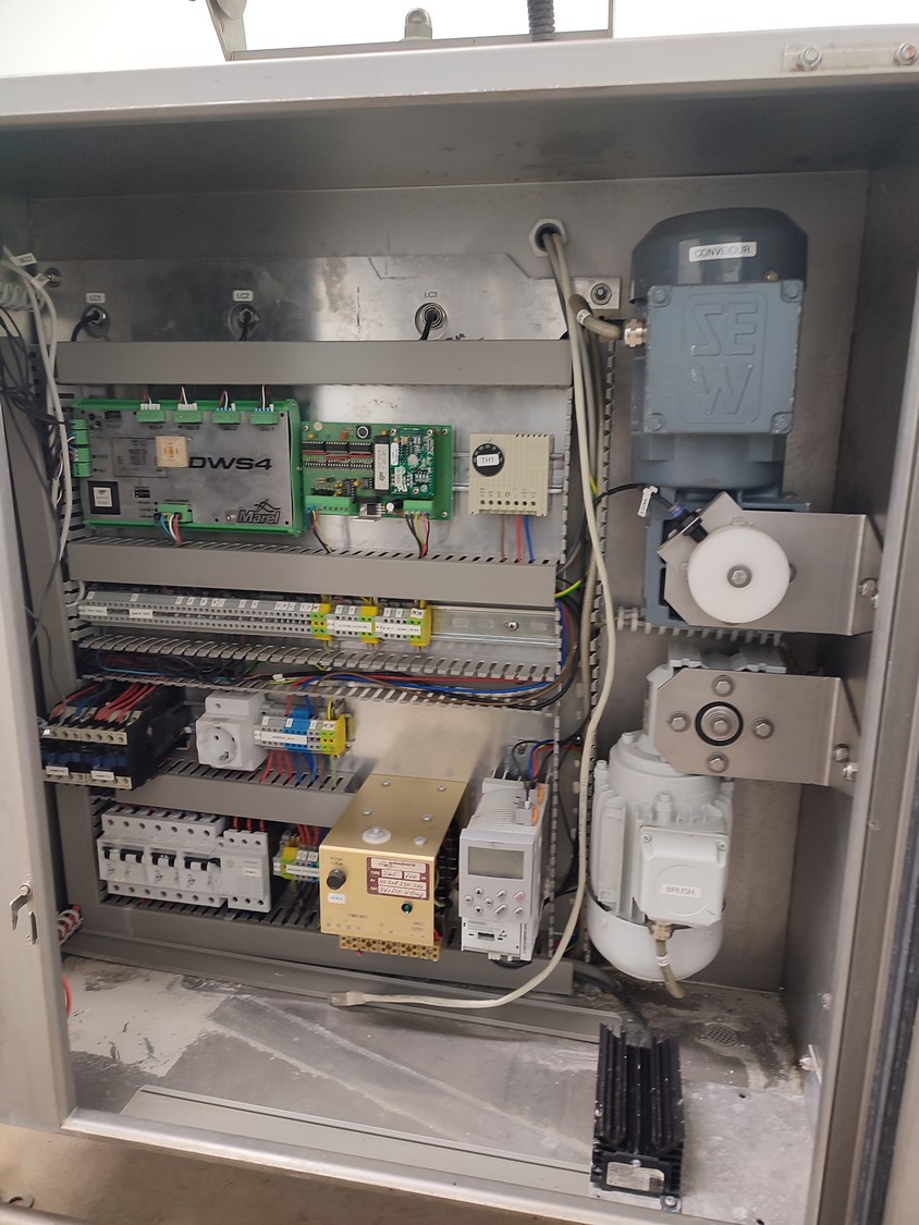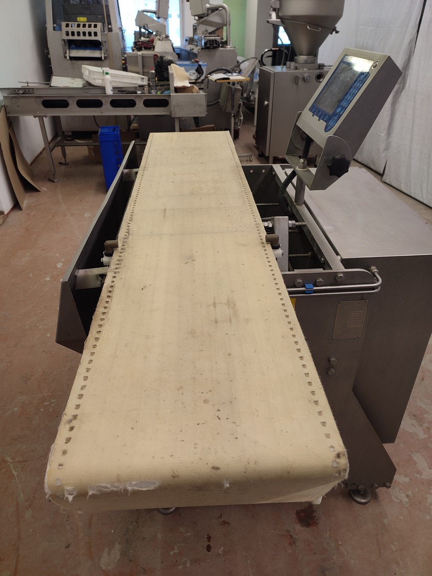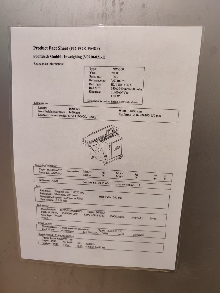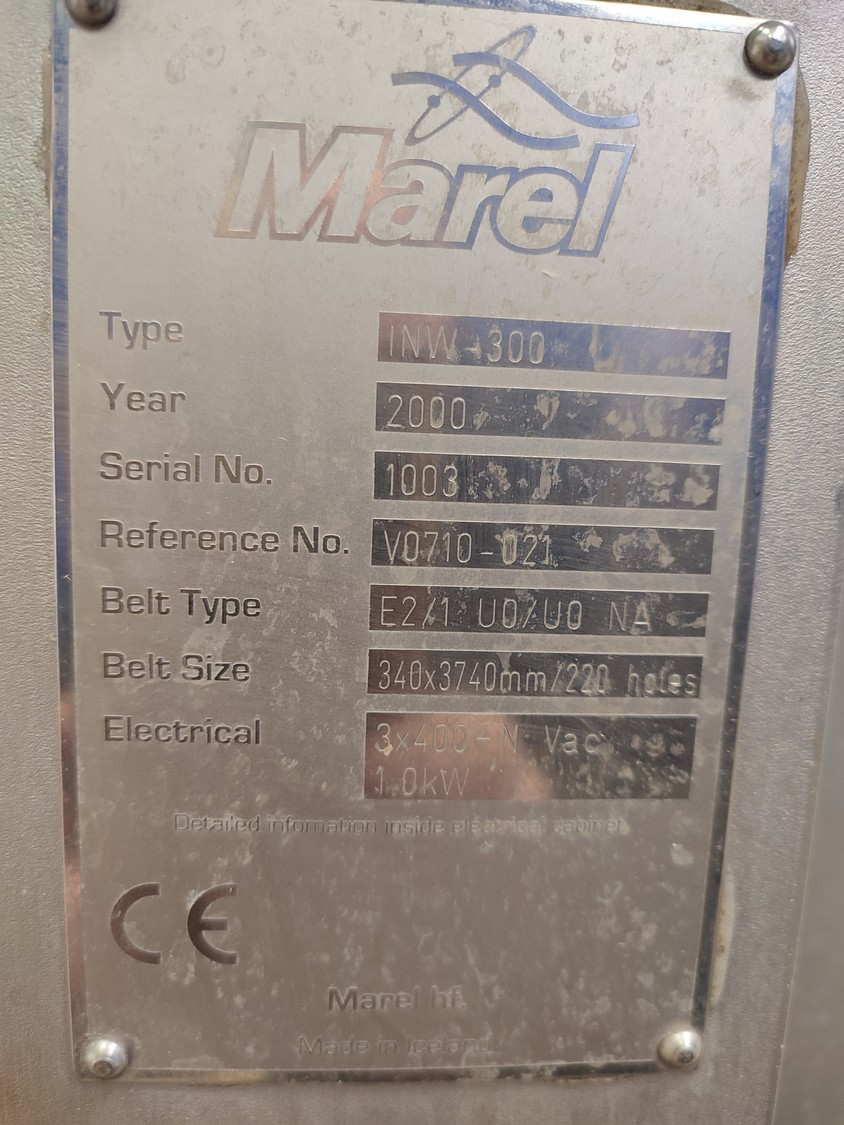 Marel checkweigher, type: INW-300, serial number: 1003, year of construction: 2000, 400 V, 3 Ph, 1.0 kW, plastic belt, belt width: 340 mm, total dimensions: 1650 mm x 1000 mm x 1450 mm.