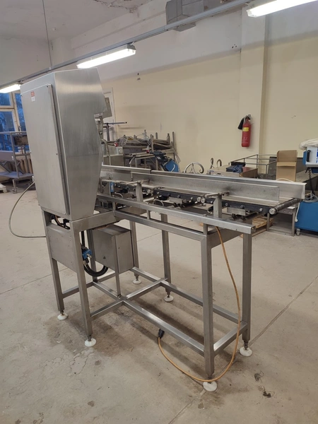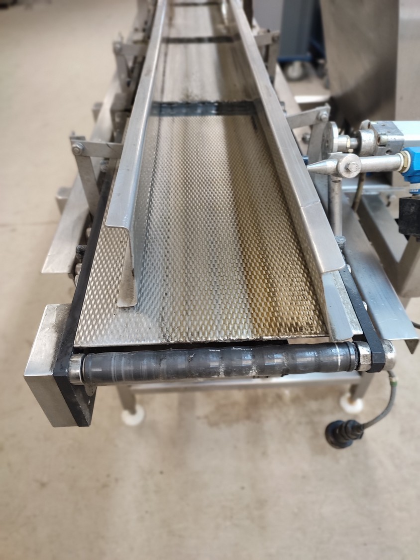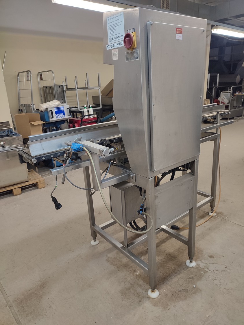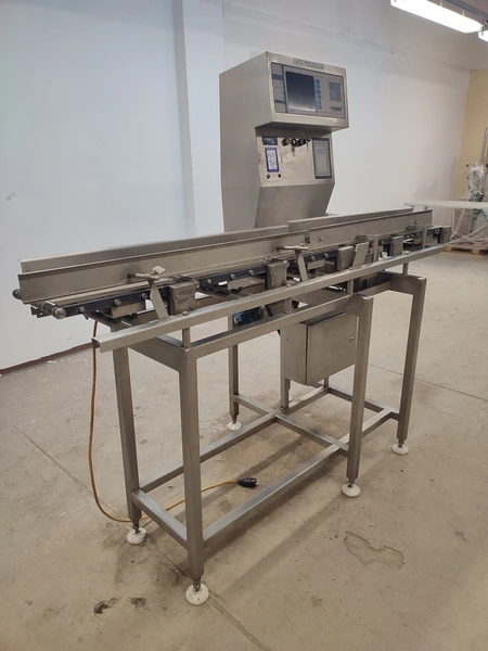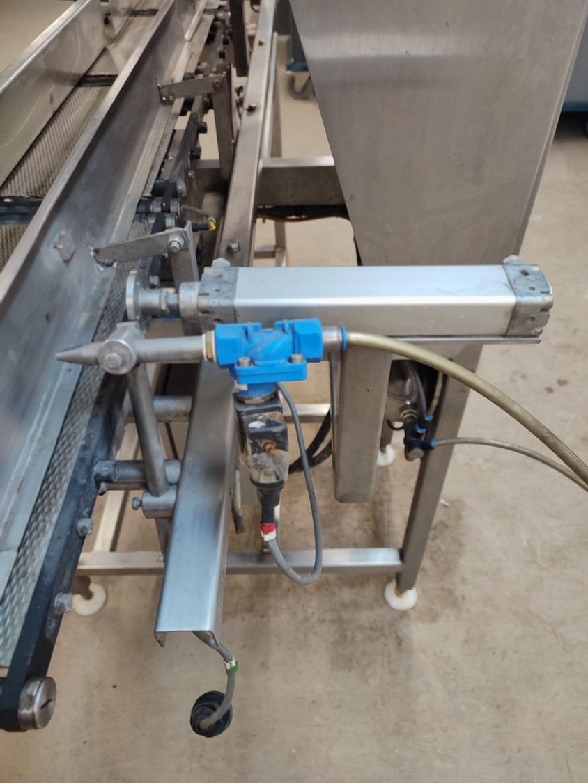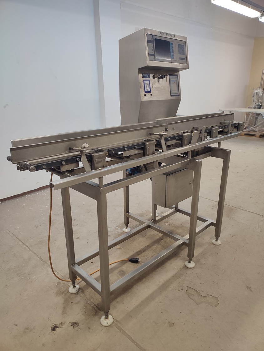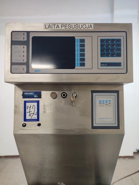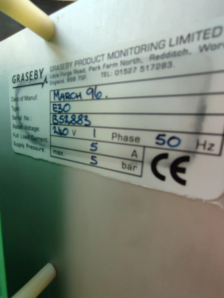 Graseby checkweigher, type: E30, serial number: B52883, year of construction: 03.1996, 240 V, 1 Ph, 50 Hz, 5 A, pressure: 5 bar, belt width: 200 mm, total dimensions: 2140 mm x 800 mm x 1770 mm. Missing belts.