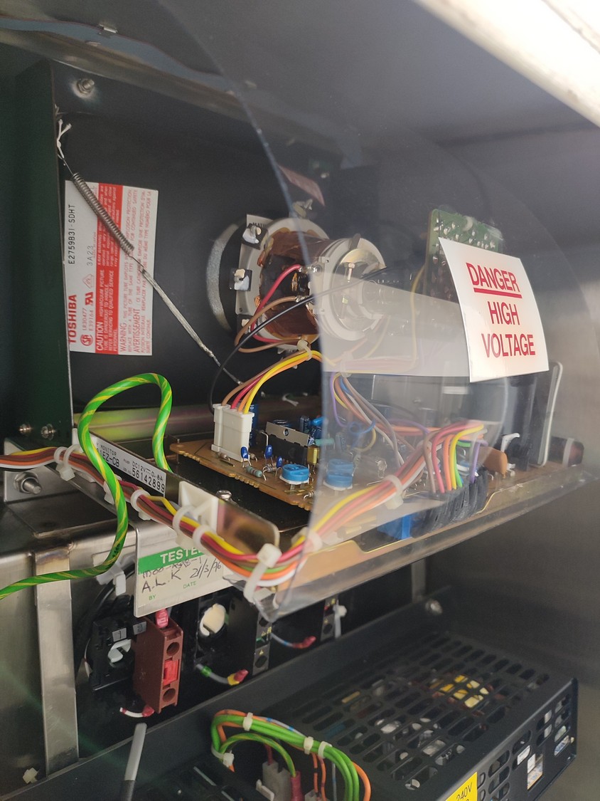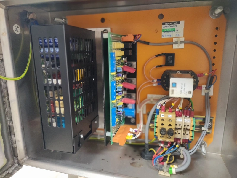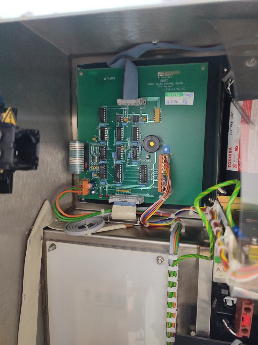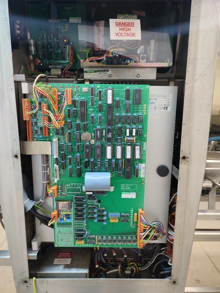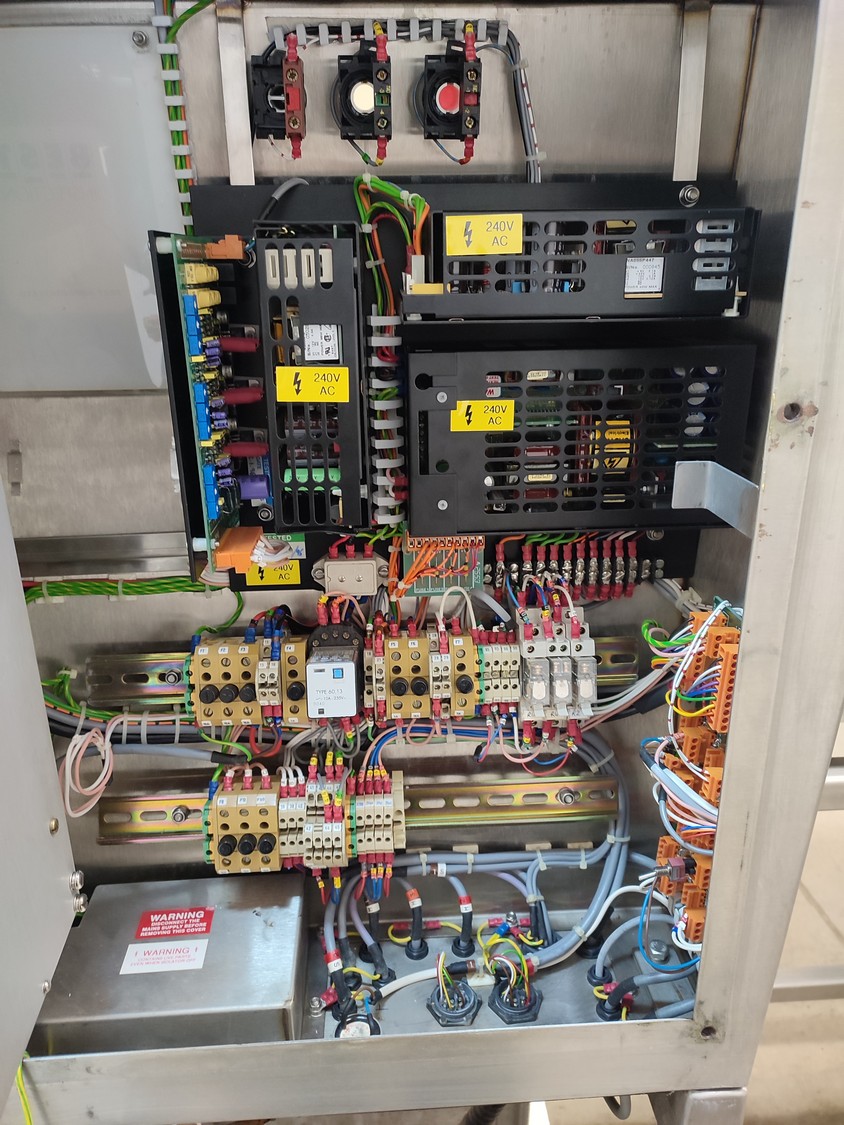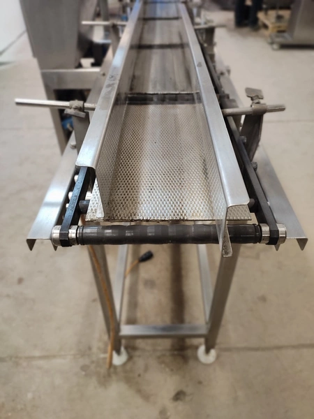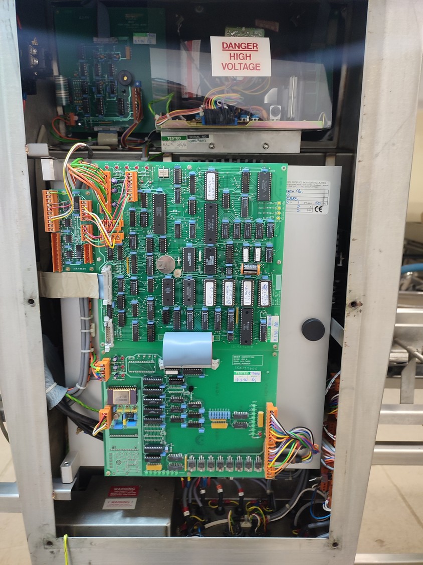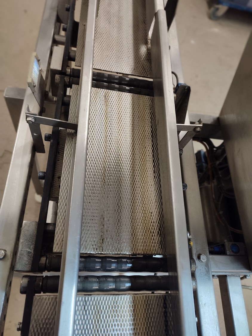 Graseby checkweigher, type: E30, serial number: B52883, year of construction: 03.1996, 240 V, 1 Ph, 50 Hz, 5 A, pressure: 5 bar, belt width: 200 mm, total dimensions: 2140 mm x 800 mm x 1770 mm. Missing belts.