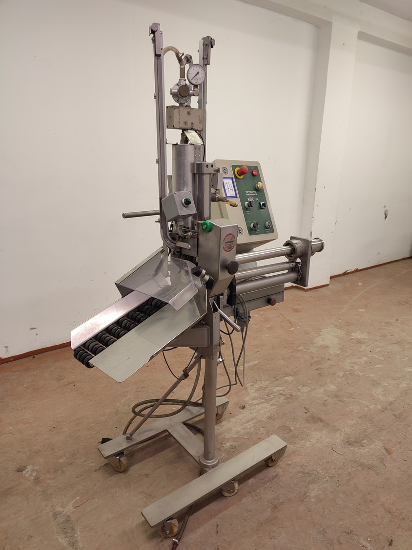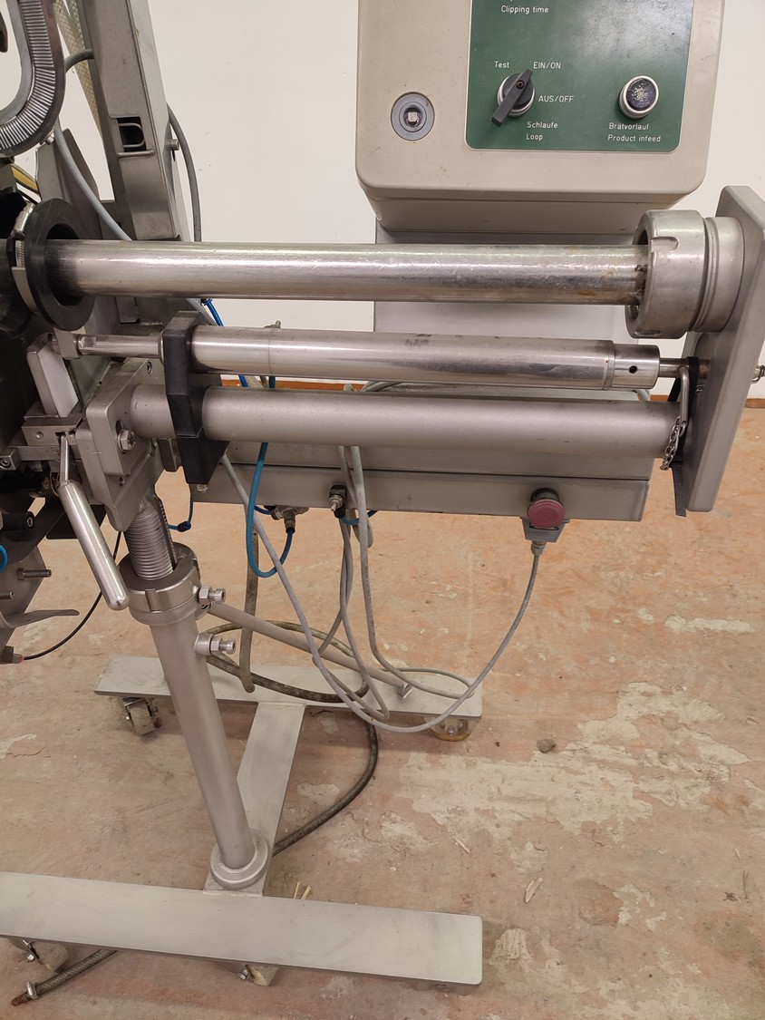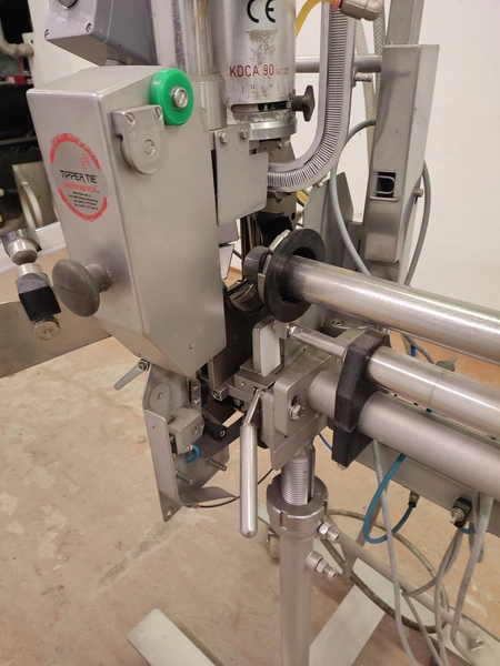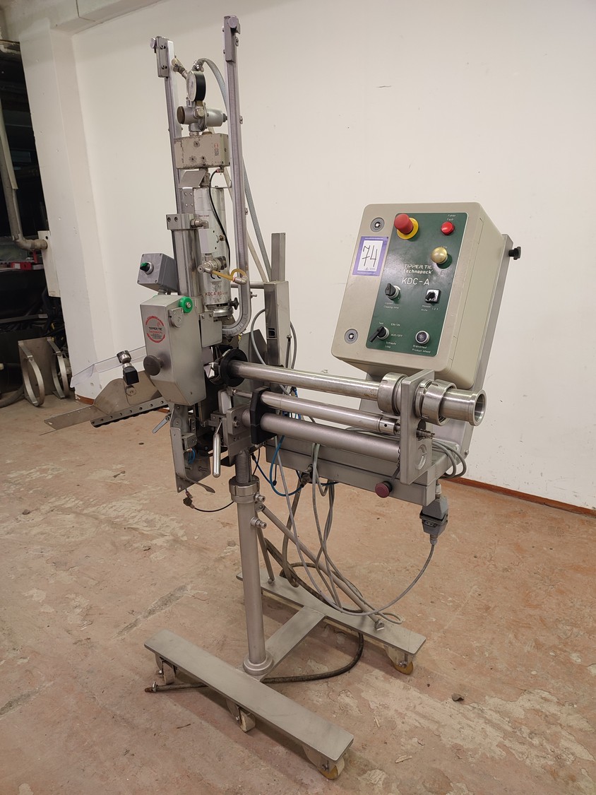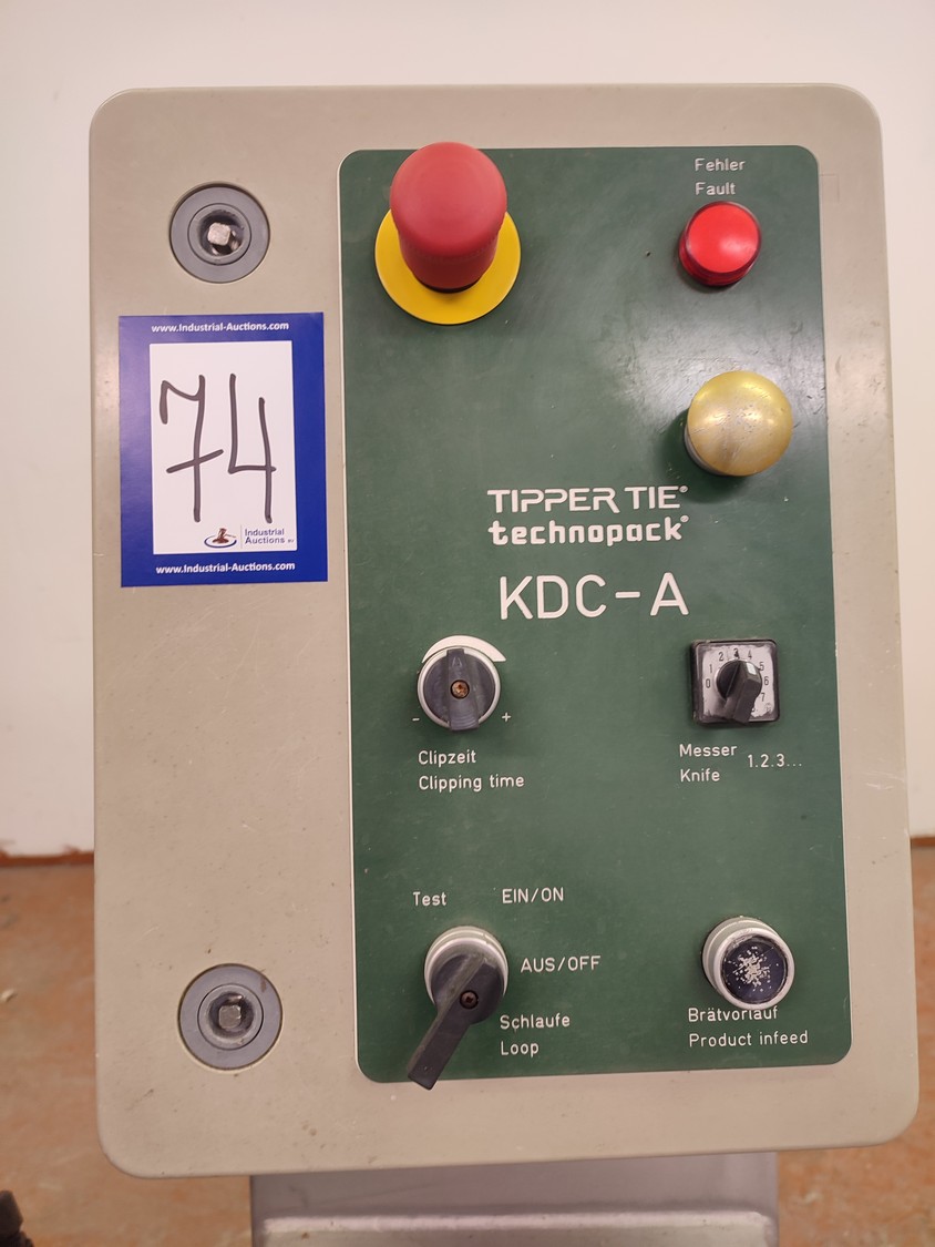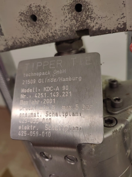 Tipper Tie technopack GmbH mobile automatic double clipper, model: KDC-A 90, number: 4251.143.221, year of construction: 2001, minimum 5 bar, maximum 6 bar, dimensions: 1300 mm x 900 mm x 1860 mm.