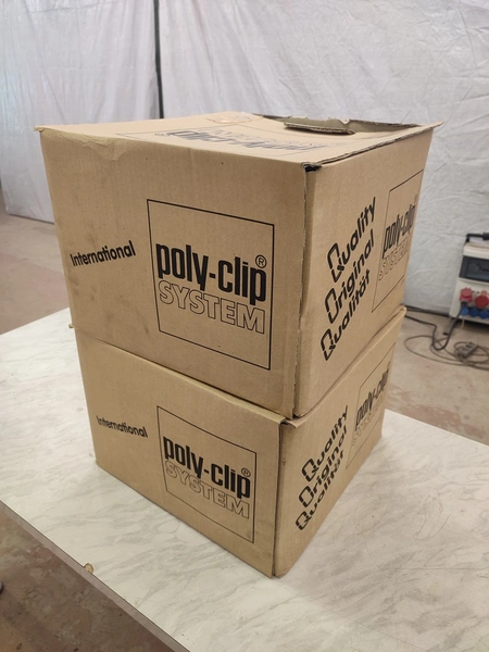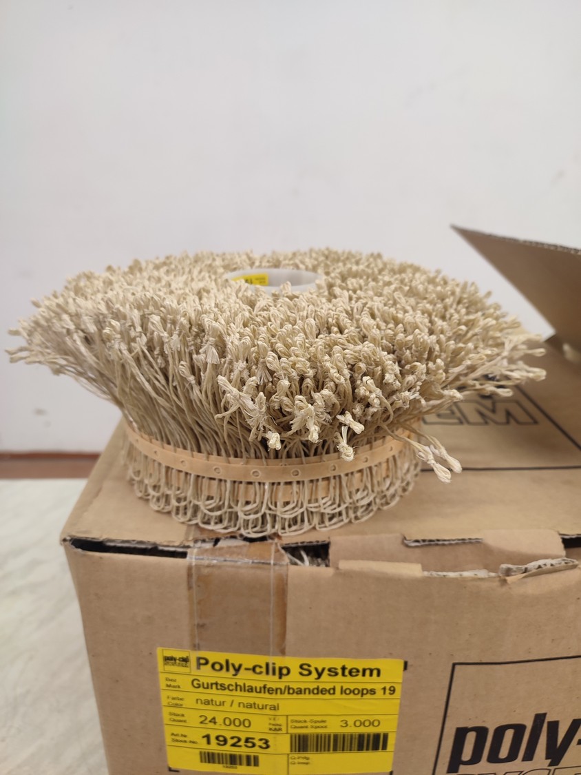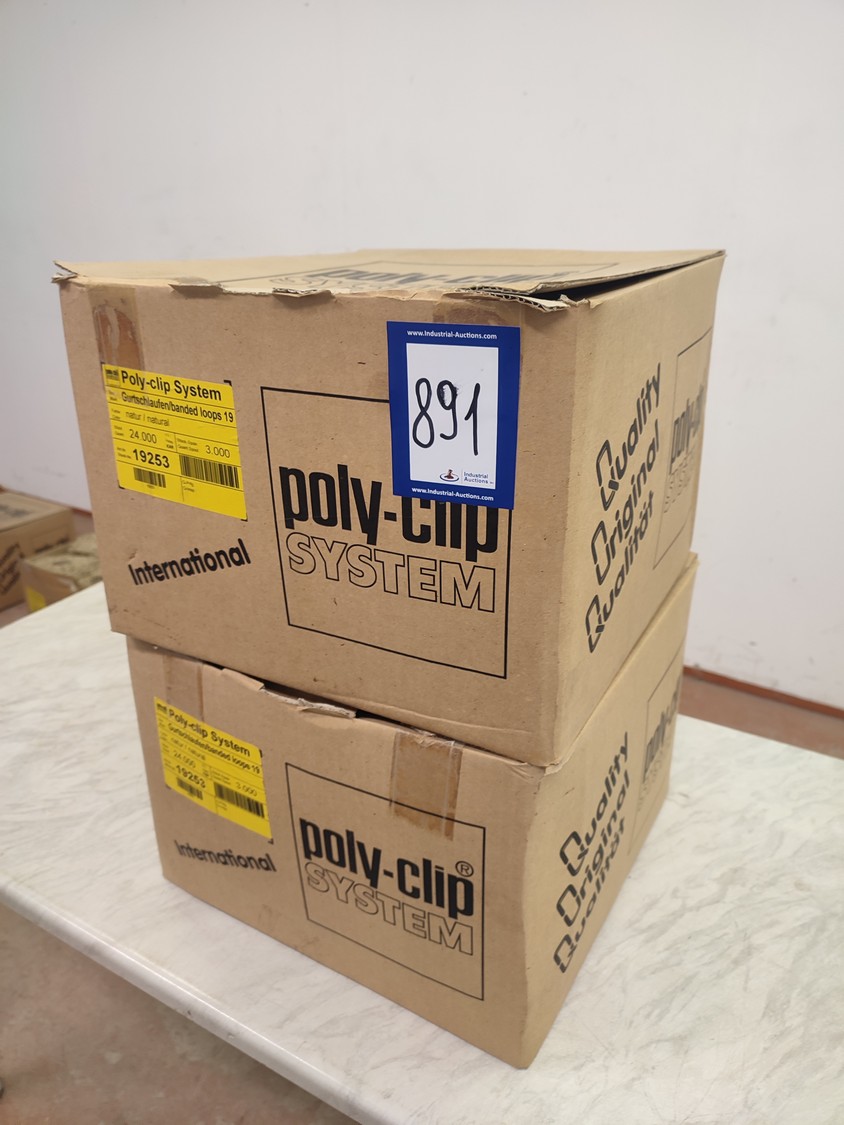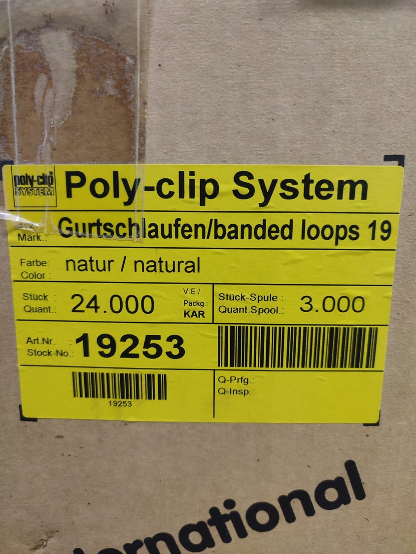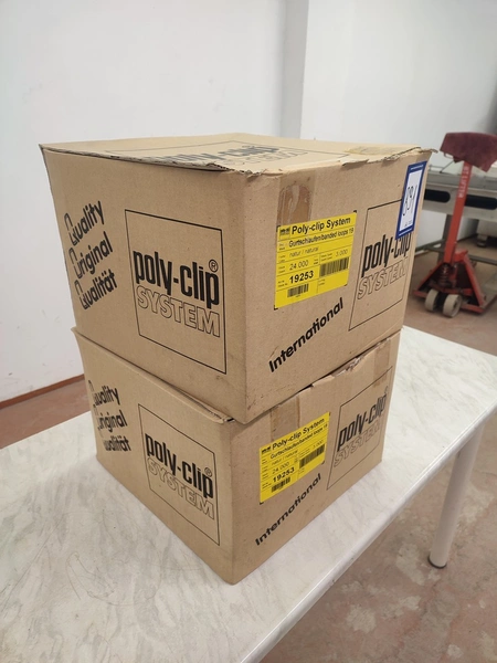 2 boxes of Poly-clip System loops, type: Gurtschlaufen/banded loops 19, number: 19253, 14 rolls of loops, 3000 units per roll, dimensions: 400 mm x 400 mm x 570 mm.