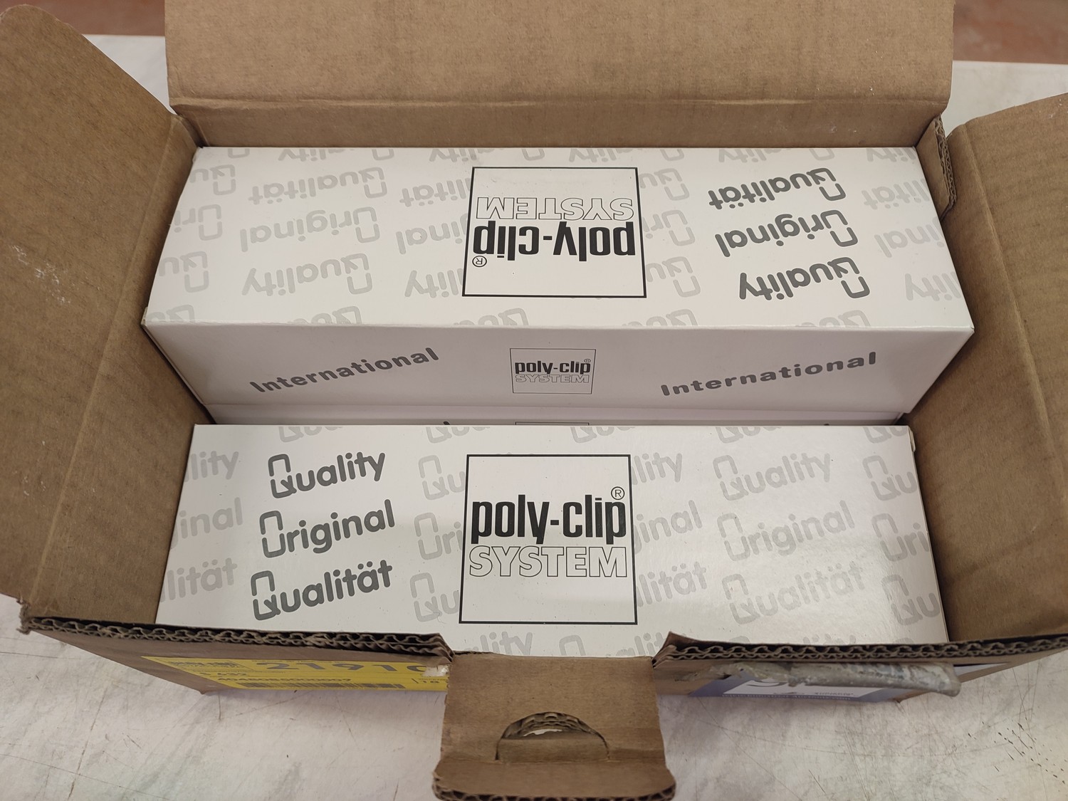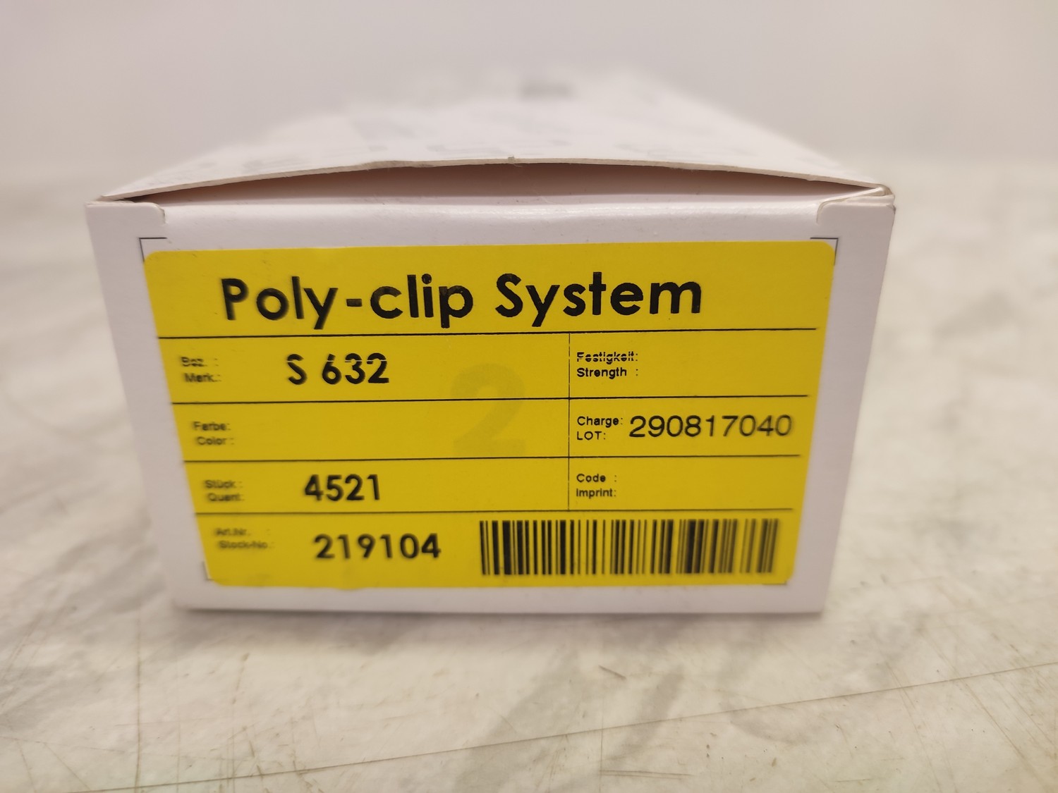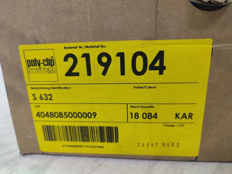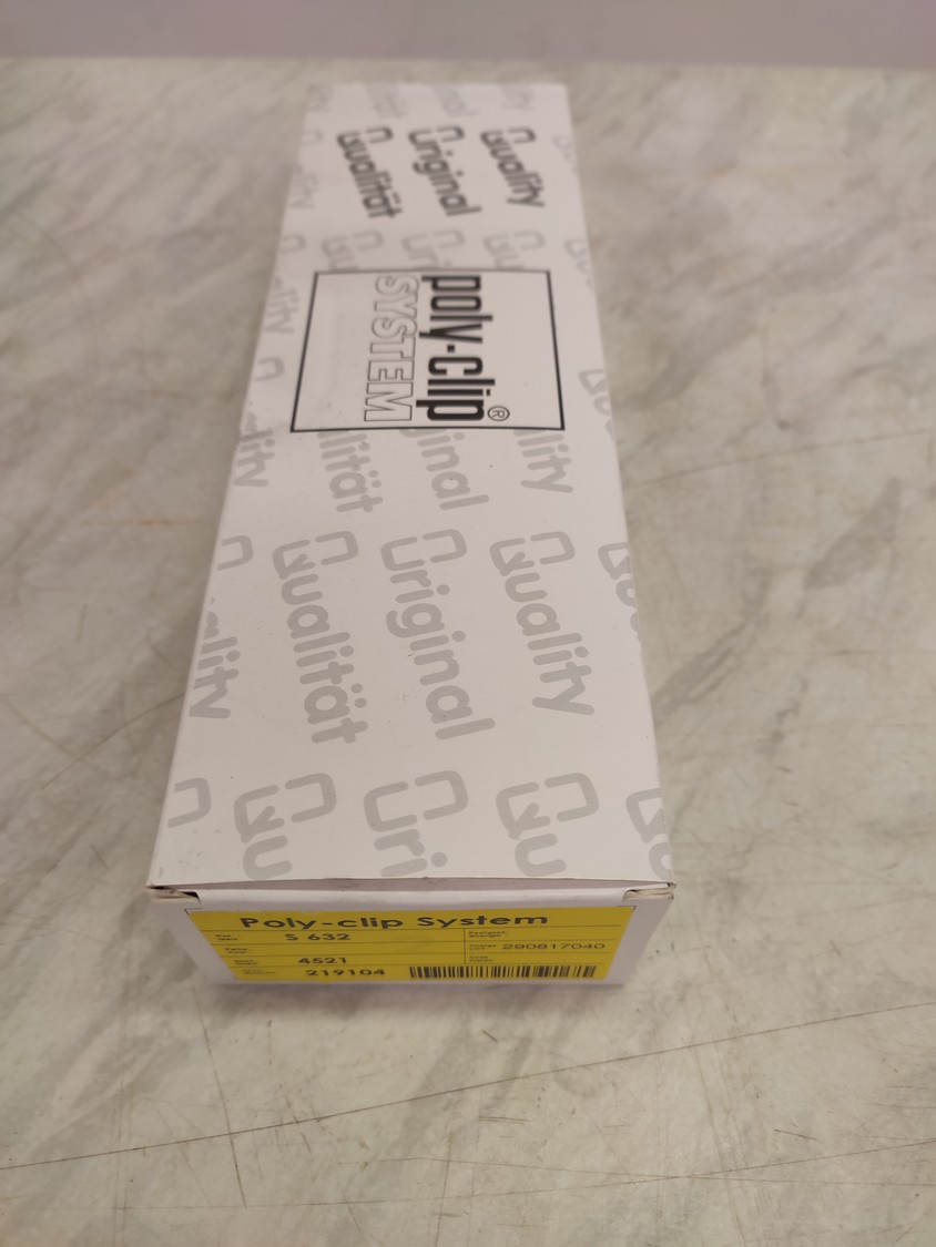 Poly-clip System clips, type: S 632, number: 219104, approximately 13563 clips, dimensions box: 290 mm x 195 mm x 130 mm.