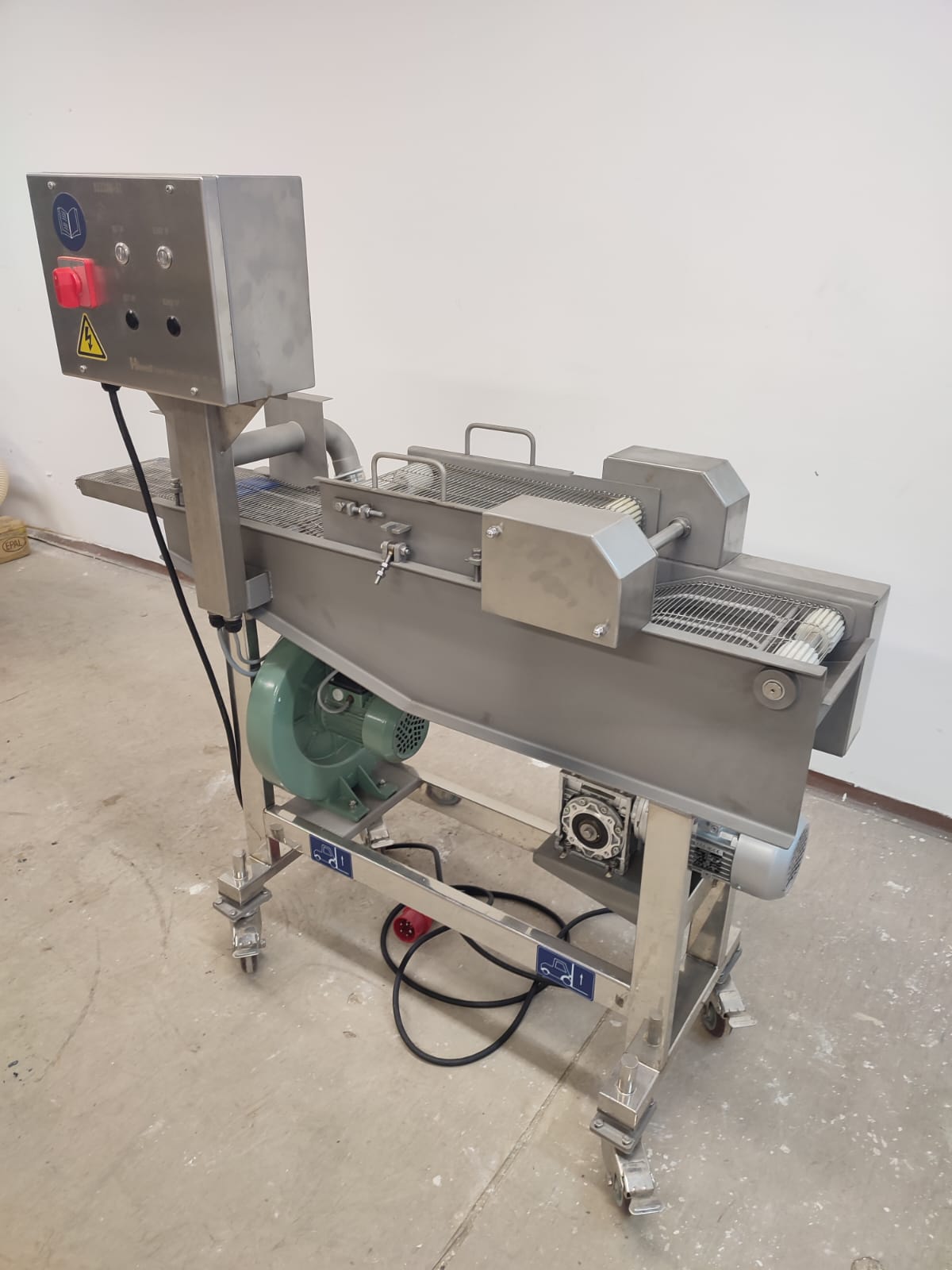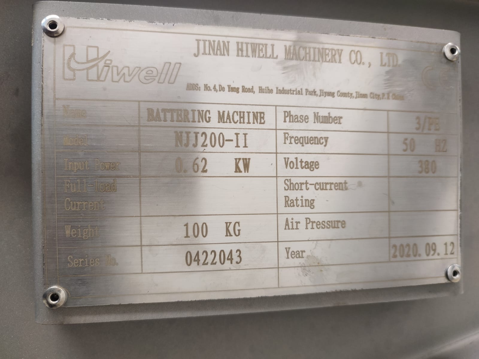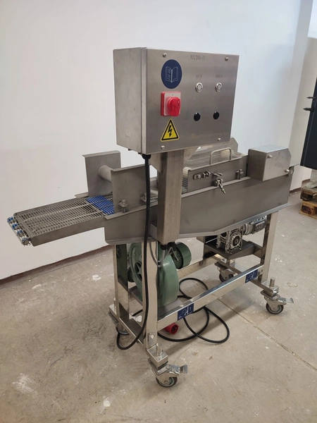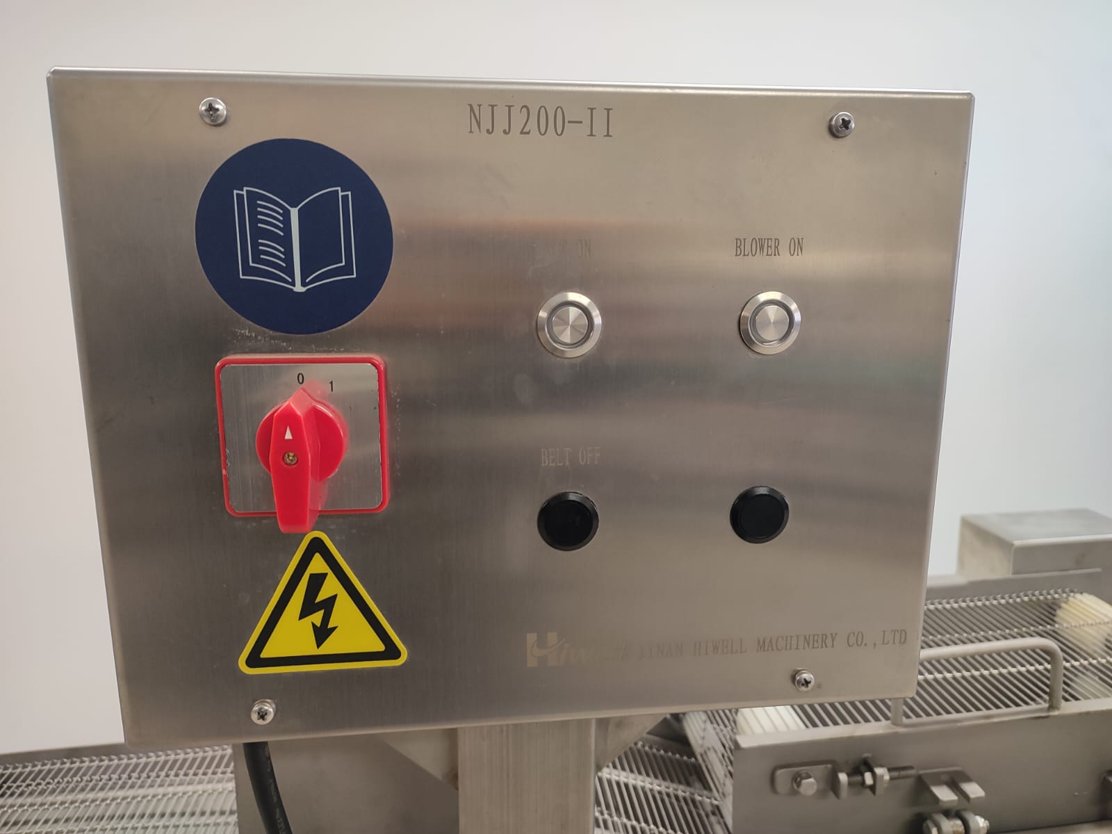Jinan Hiwell Machinery Co., Ltd mobile battering machine, model: NJJ200-II, serial number: 0422043, year of construction: 09-2020, 380 V, 3 Ph, 50 Hz, 0.62 kW, s/s mesh belt, belt width: 200 mm, total dimensions: 1400 mm x 550 mm x1250 mm.
