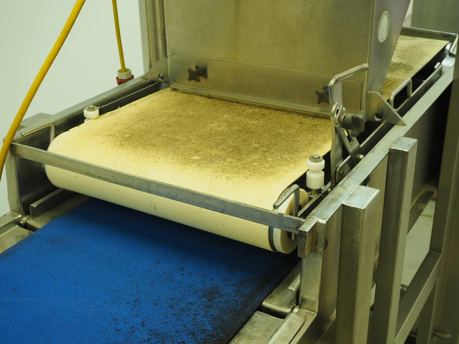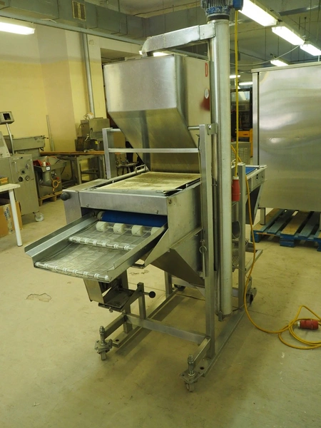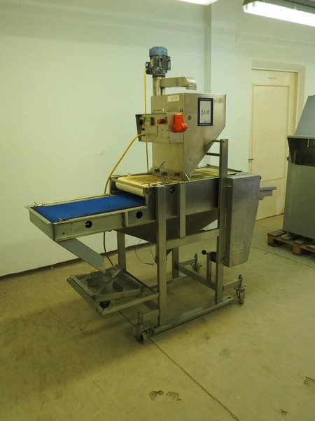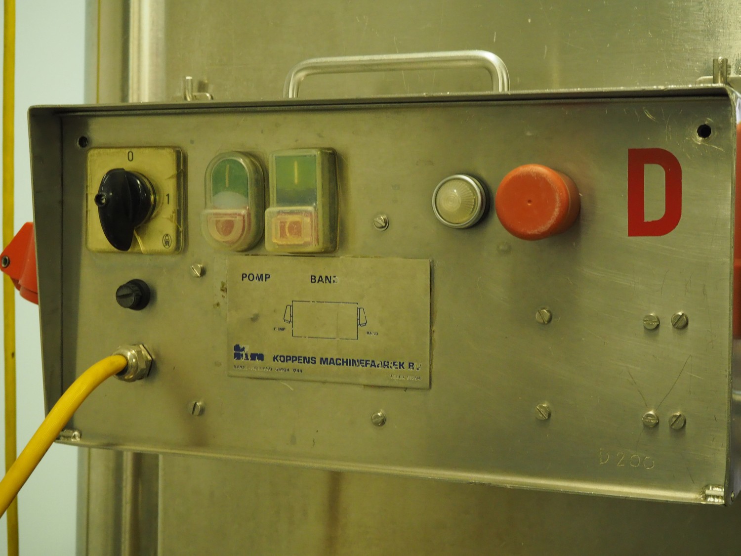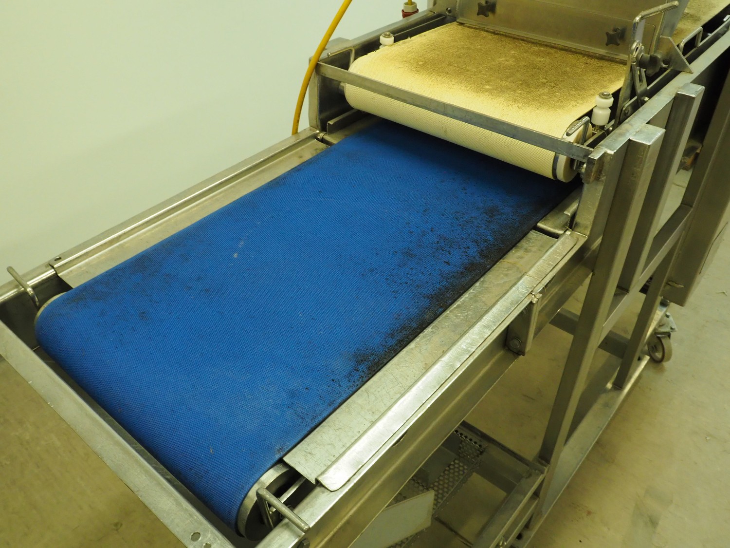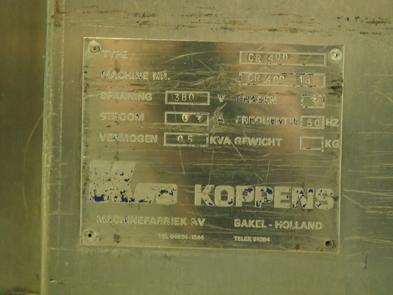 Koppens BV mobile breading machine, type: CR 400, machine number: CR 400-18, 380 V, 3 Ph, 50 Hz, 63 A, s/s mesh belt, belt width: 400 mm, plastic belts, belt width: (2x) 400 mm, total dimensions: 2020 mm x 730 mm x 2140 mm. Motor and gear missing.