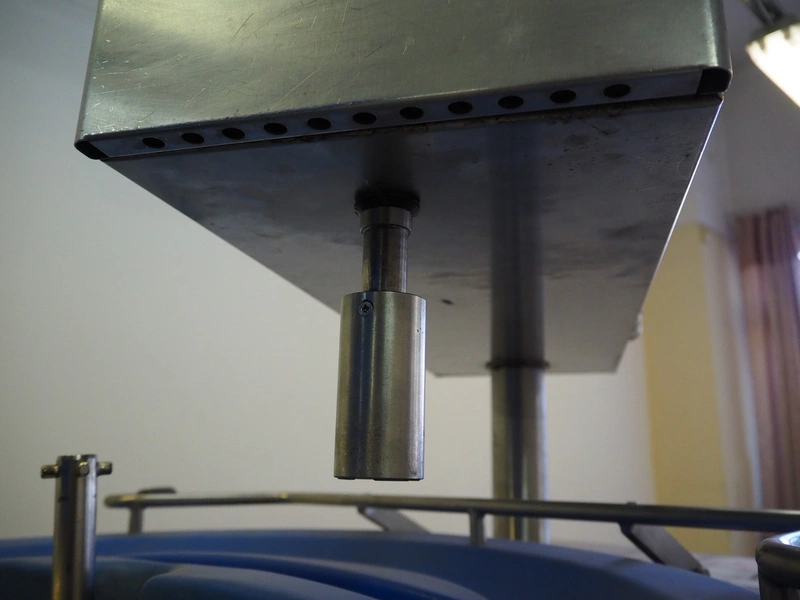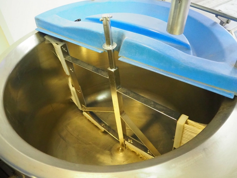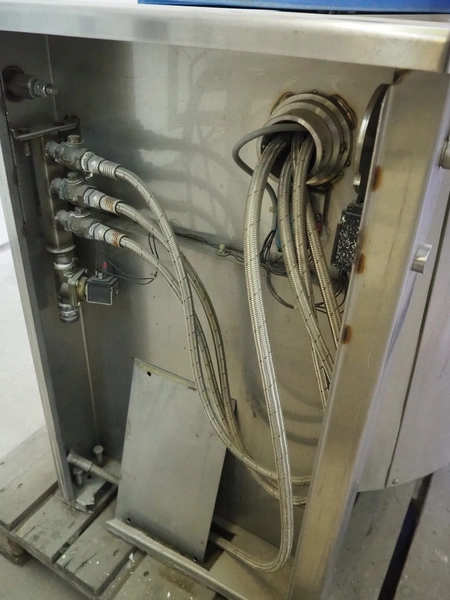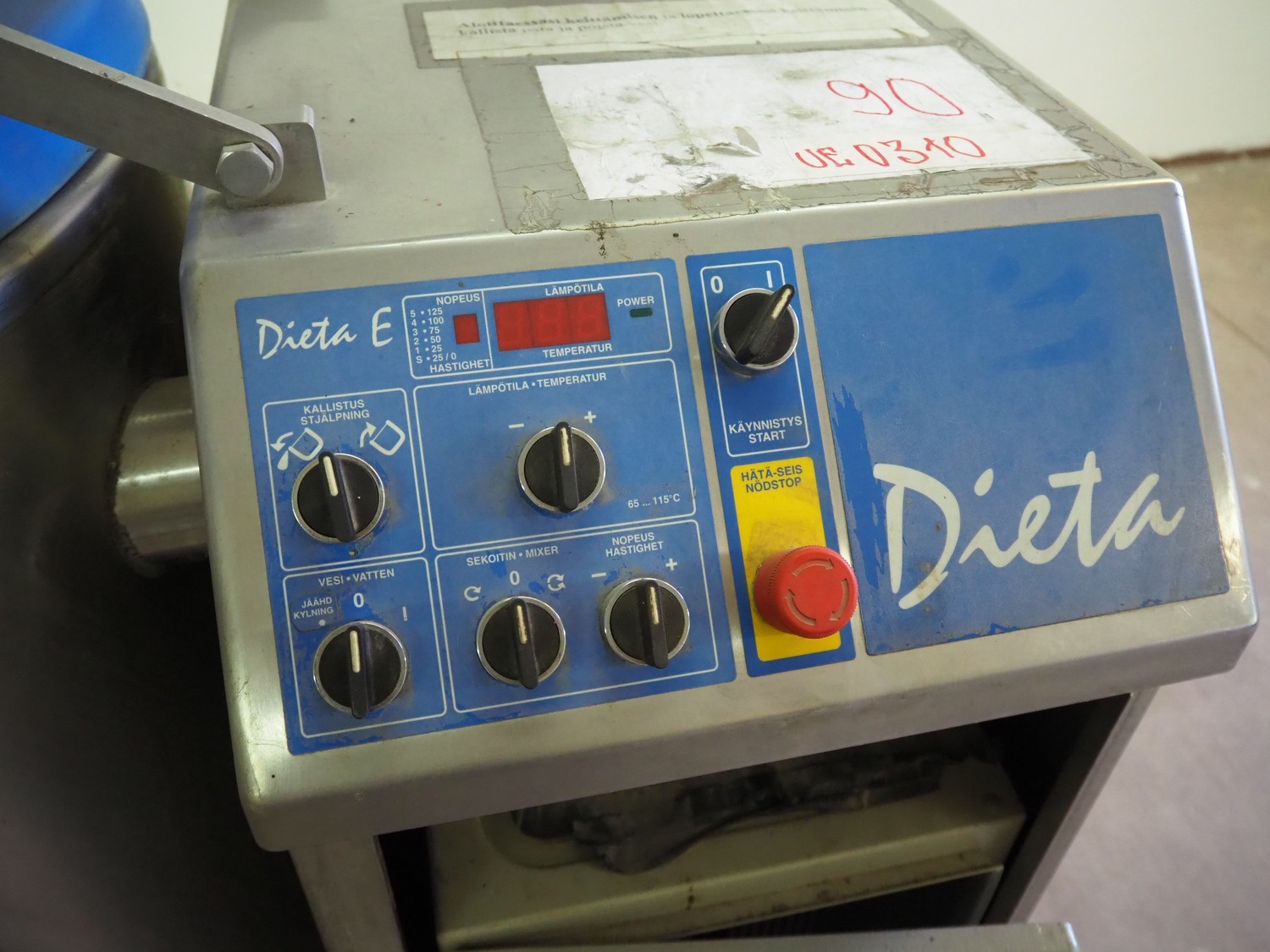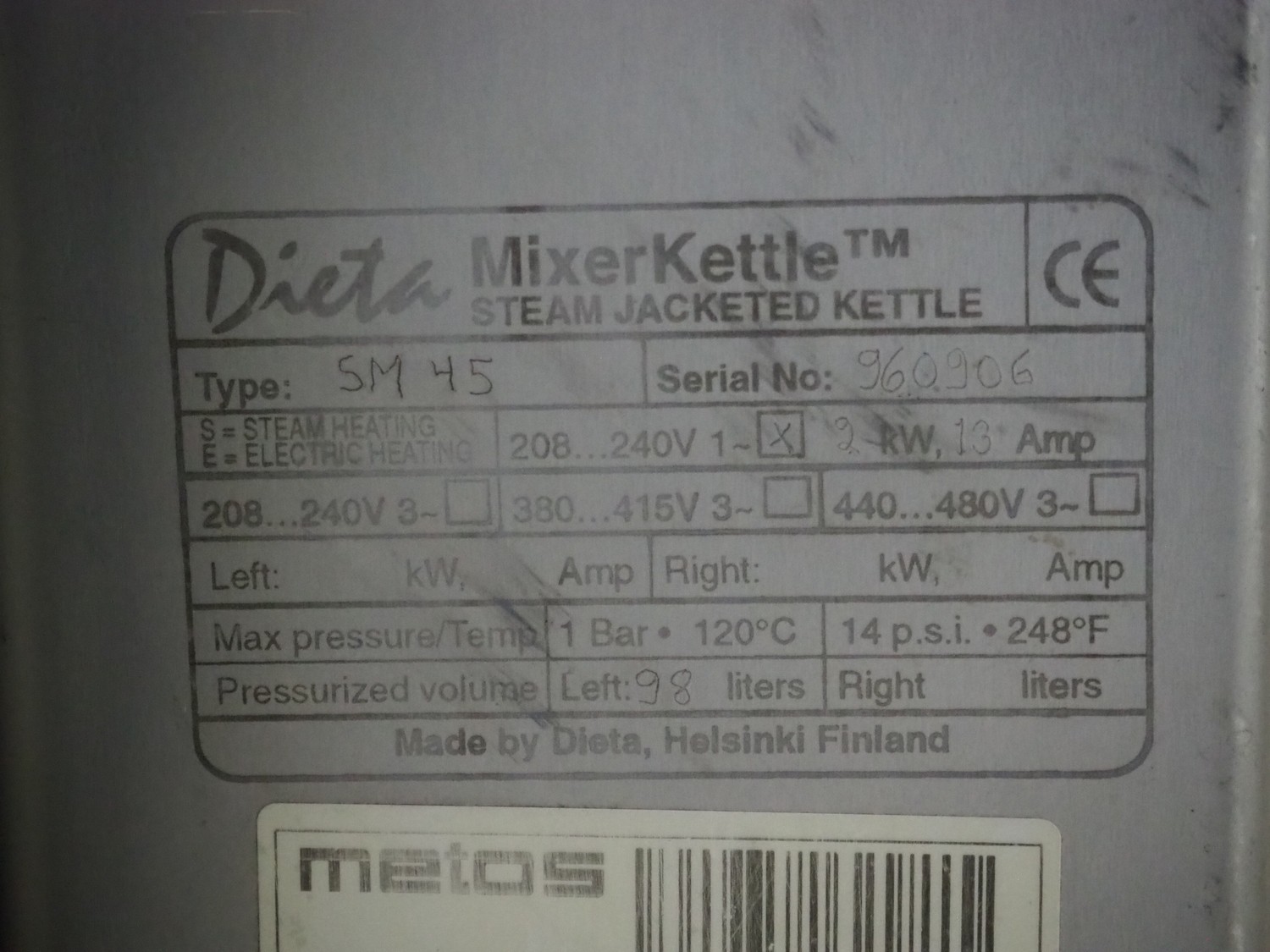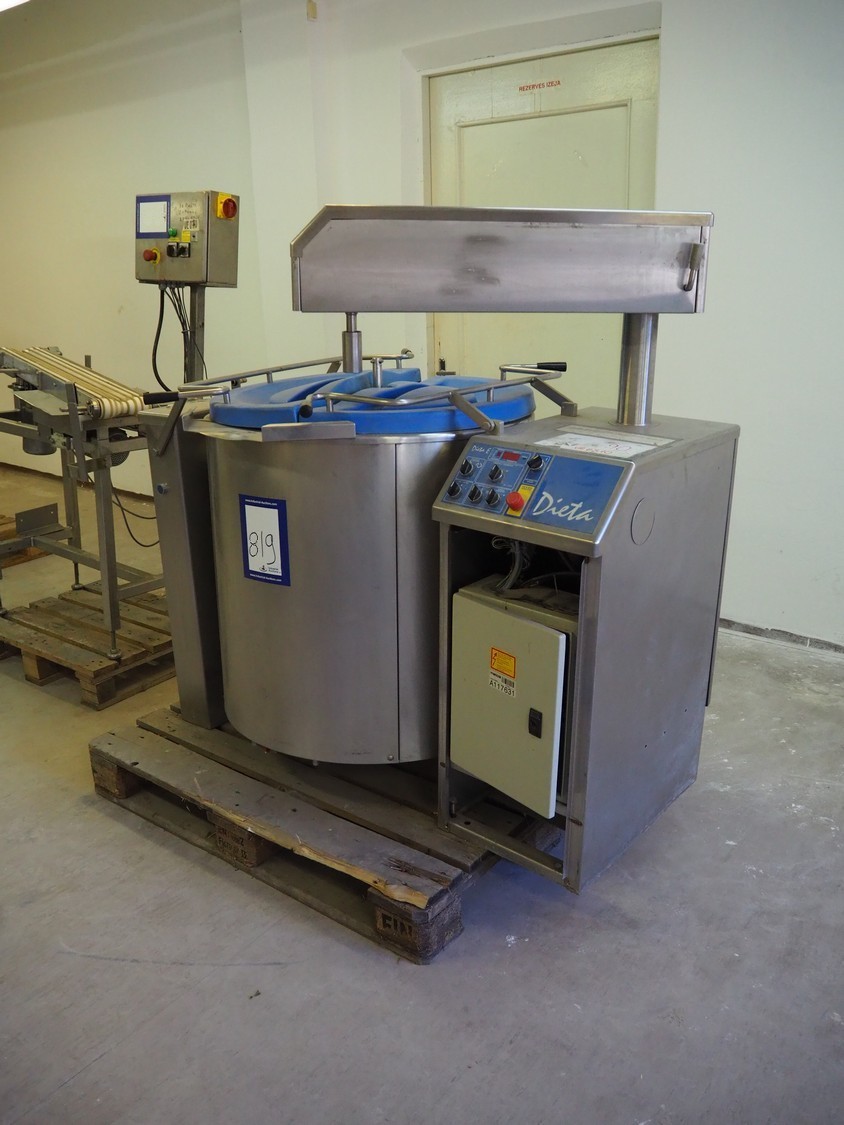 Dieta tiltable steam heated cooking vessel with agitator, type: SM 45, serial number: 960906, 208-240 V, 1 Ph, 2 kW, 13 A, maximum pressure: 1 bar, maximum temperature: 120 °C, volume: 98 liter, dimensions: 1400 mm x 900 mm x 1400 mm. Incomplete, technical condition unknown.