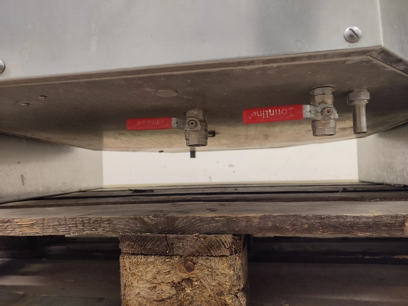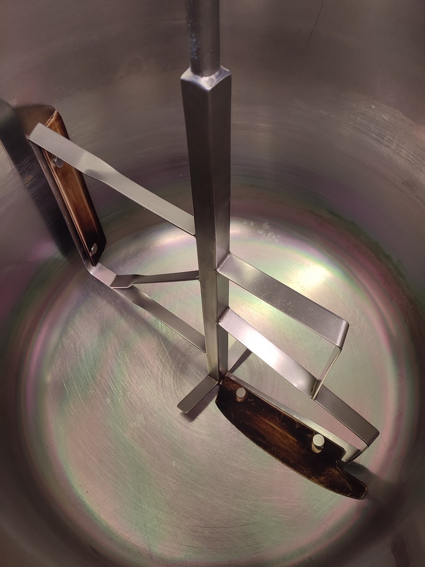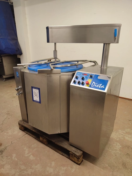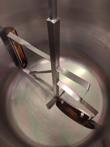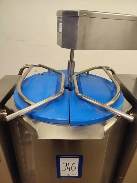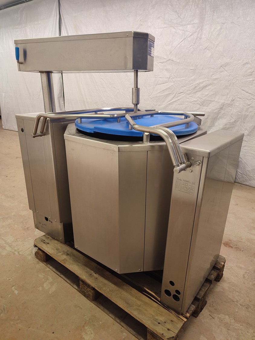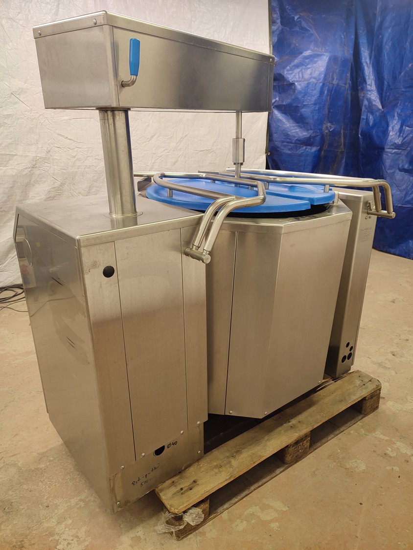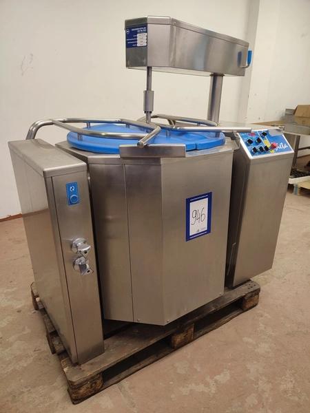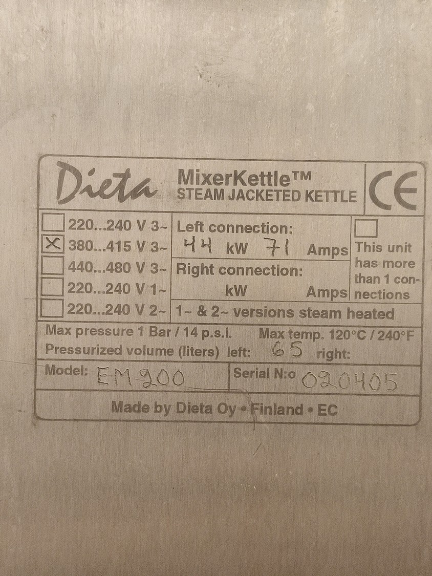 Dieta tiltable steam heated cooking vessel with agitator, model: EM 200, serial number: 020405, 380-415 V, 3 Ph, 44 kW, 71 A, maximum pressure: 1 bar, maximum temperature: 120 °C, volume: 200 liter, dimensions: 1450 mm x 900 mm x 1400 mm.