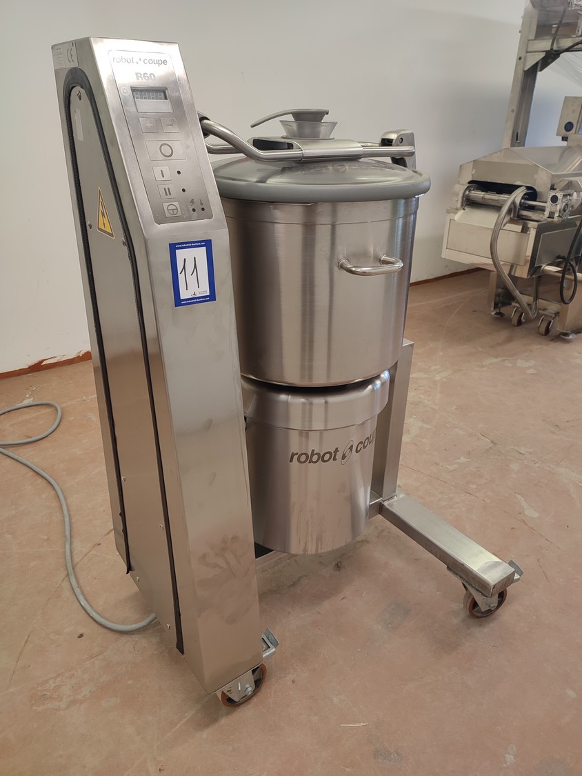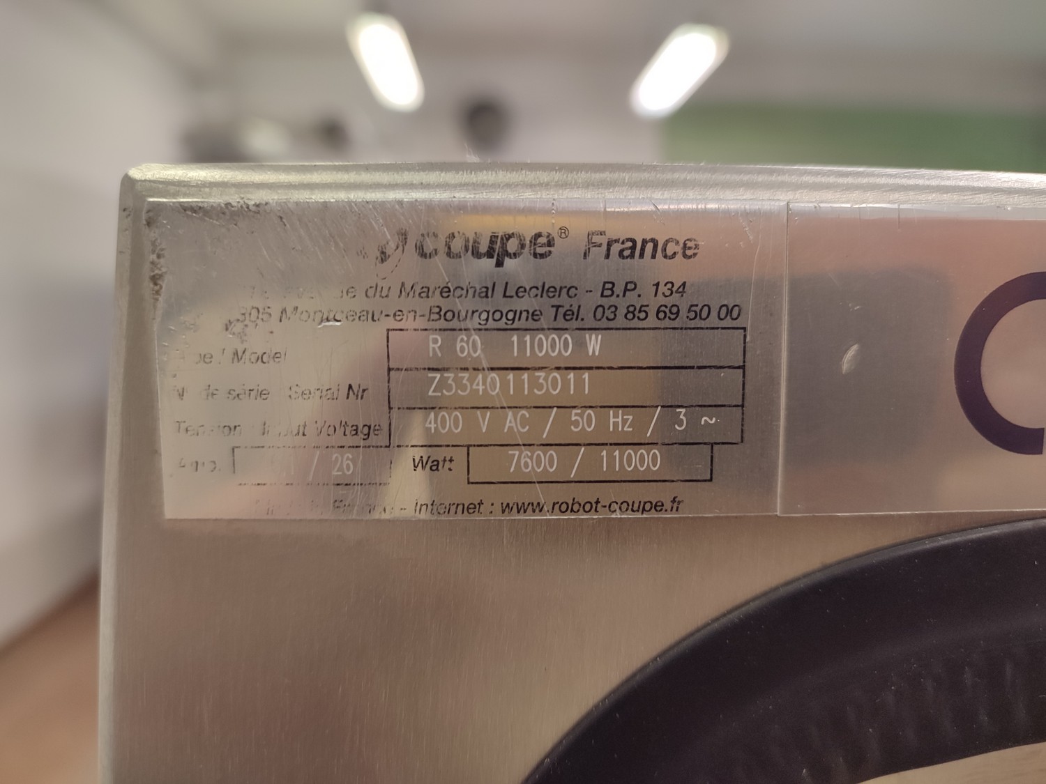 Robot Coupe mobile cutter, model: R 60 11000 W, serial number: Z3340113011, 400 V, 3 Ph, 50 Hz, 26 A, 7600/11000 W, volume: 60 liter, dimensions: 820 mm x 905 mm x 1380 mm.