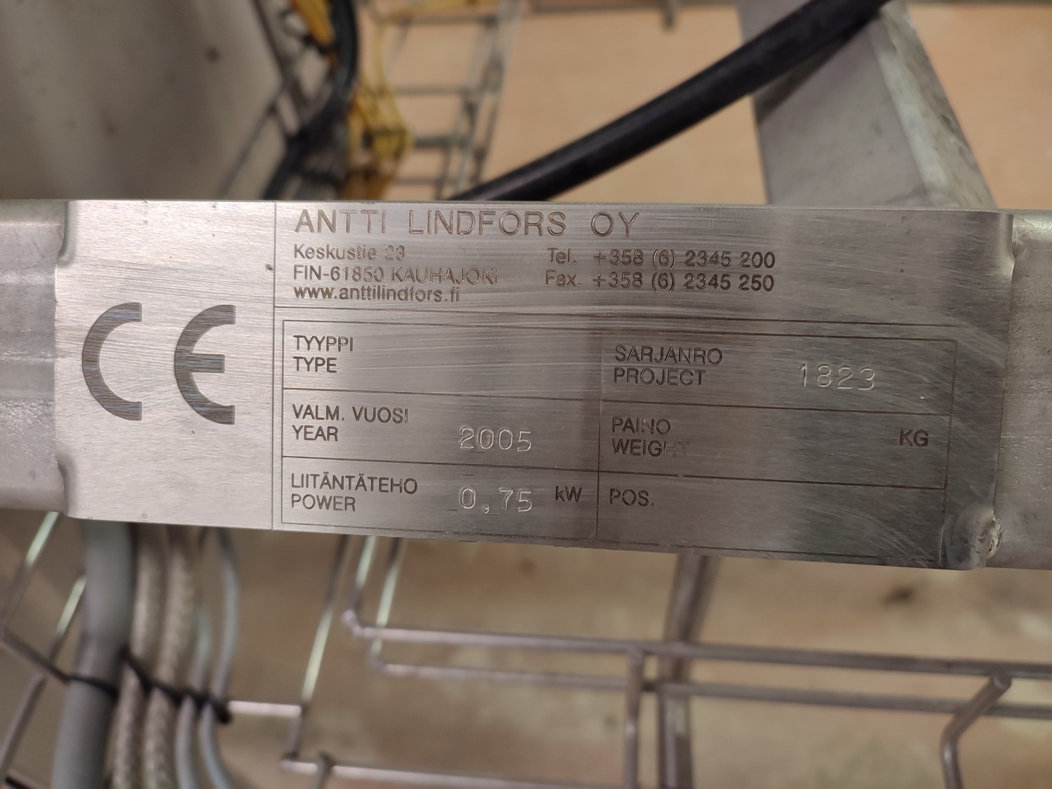 Antti Lindfors Oy tray denester, year of construction: 2005, 0.75 kW, dimensions: 2900 mm x 1300 mm x 2100 mm.