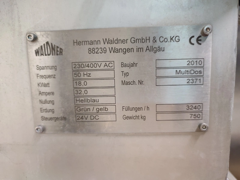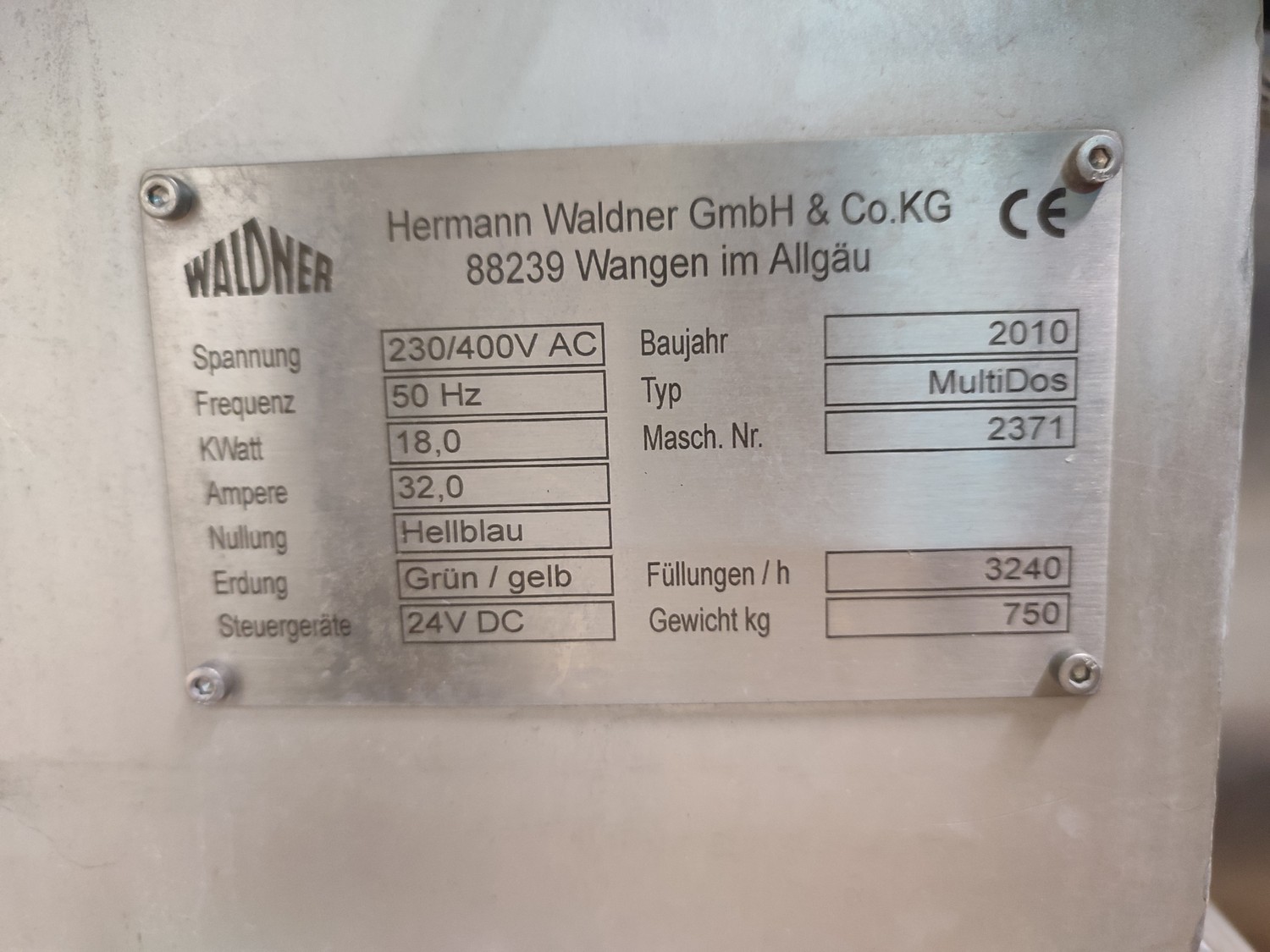 Hermann Waldner GmbH & Co. KG mobile depositor, type: MultiDos, machine number: 2371, year of construction: 2010, 230/400 V, 50 Hz, 32 A, 18 kW, weight: 750 kg, fillings: 3240 per hour, dimensions: 3080 mm x 1420 mm x 2270 mm.