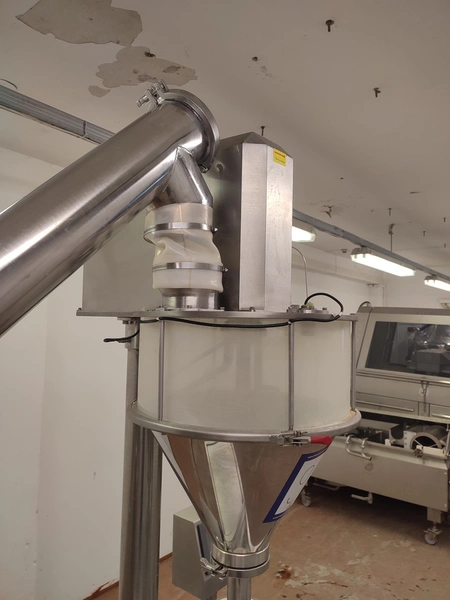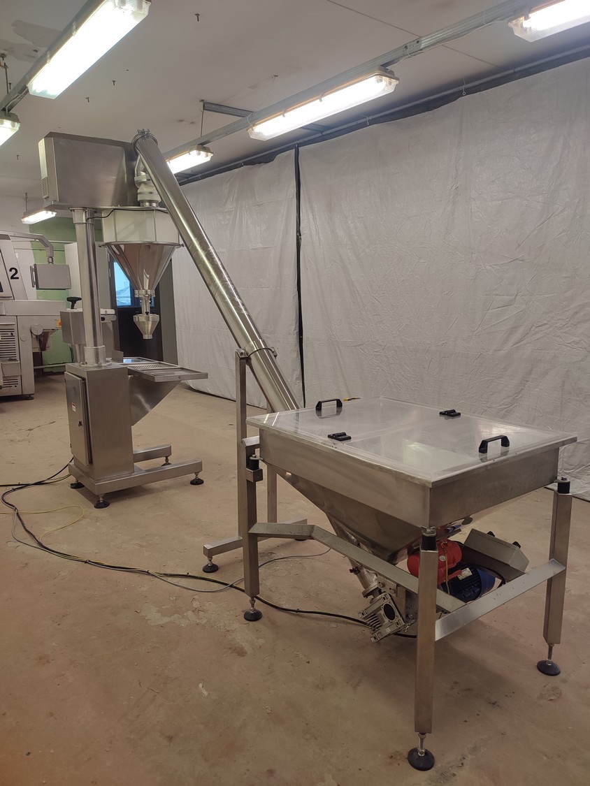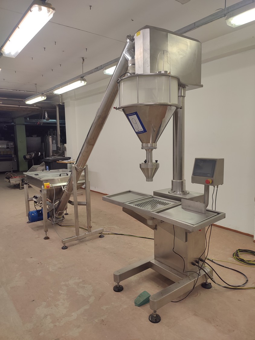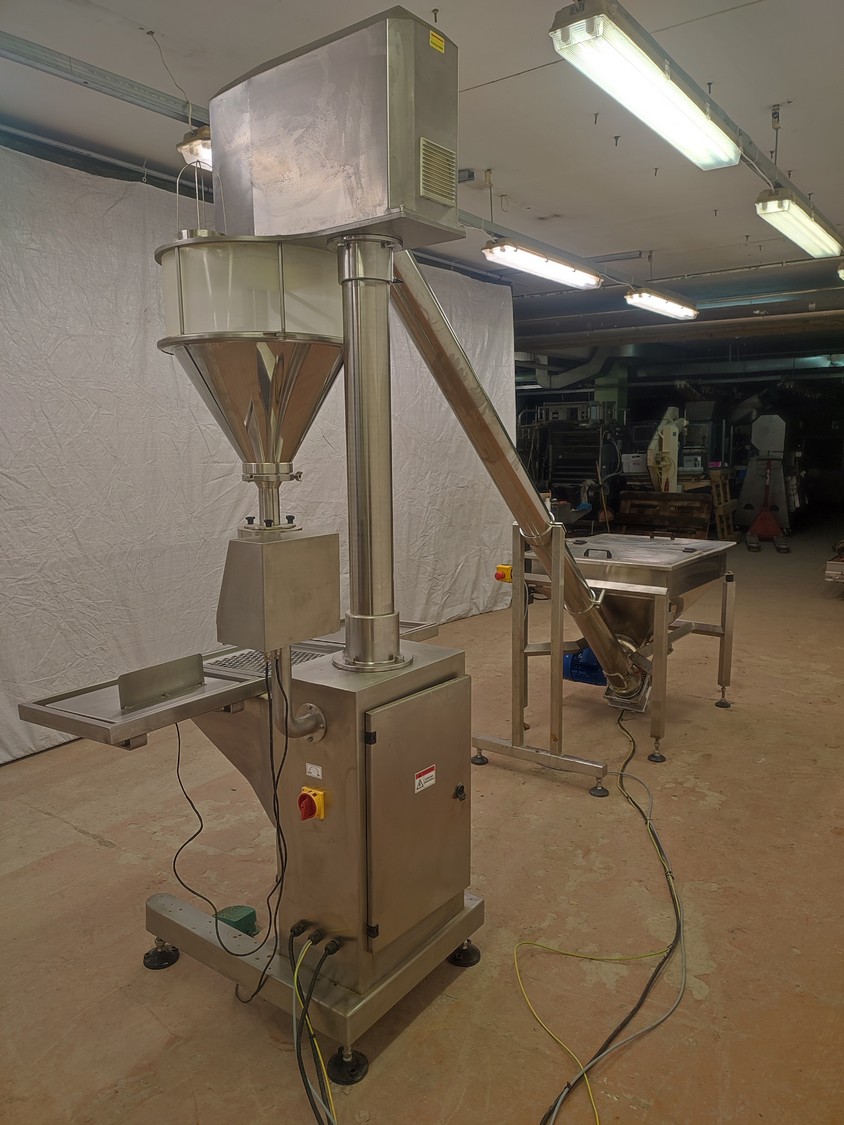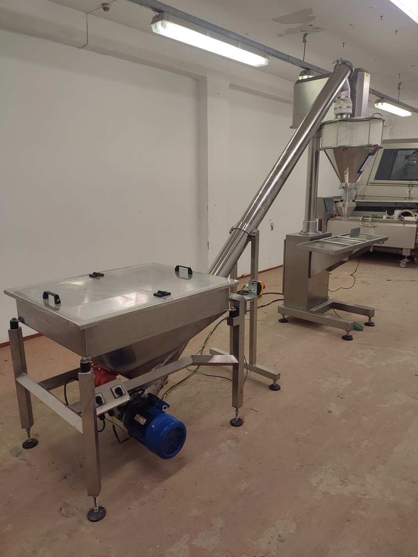 Depositor with checkweigher and vibrating elevating screw, total dimensions: 3640 mm x 810 mm x 2470 mm.