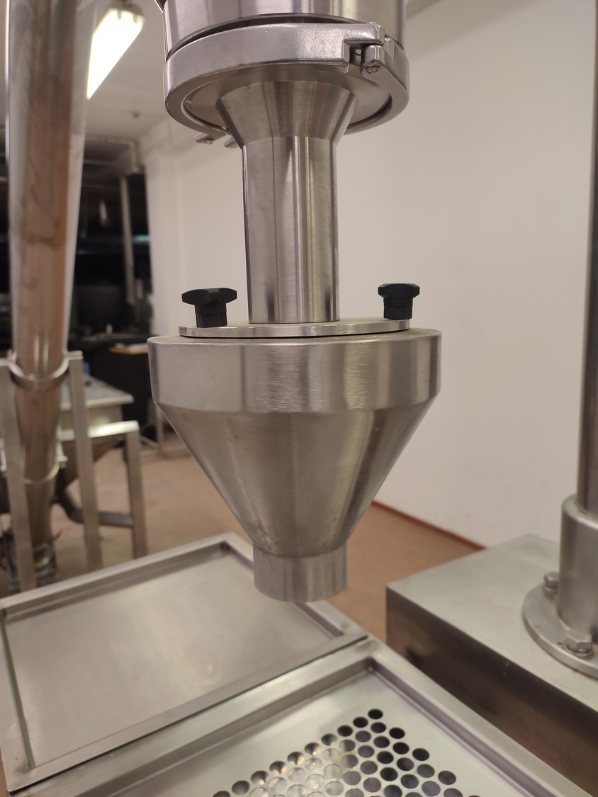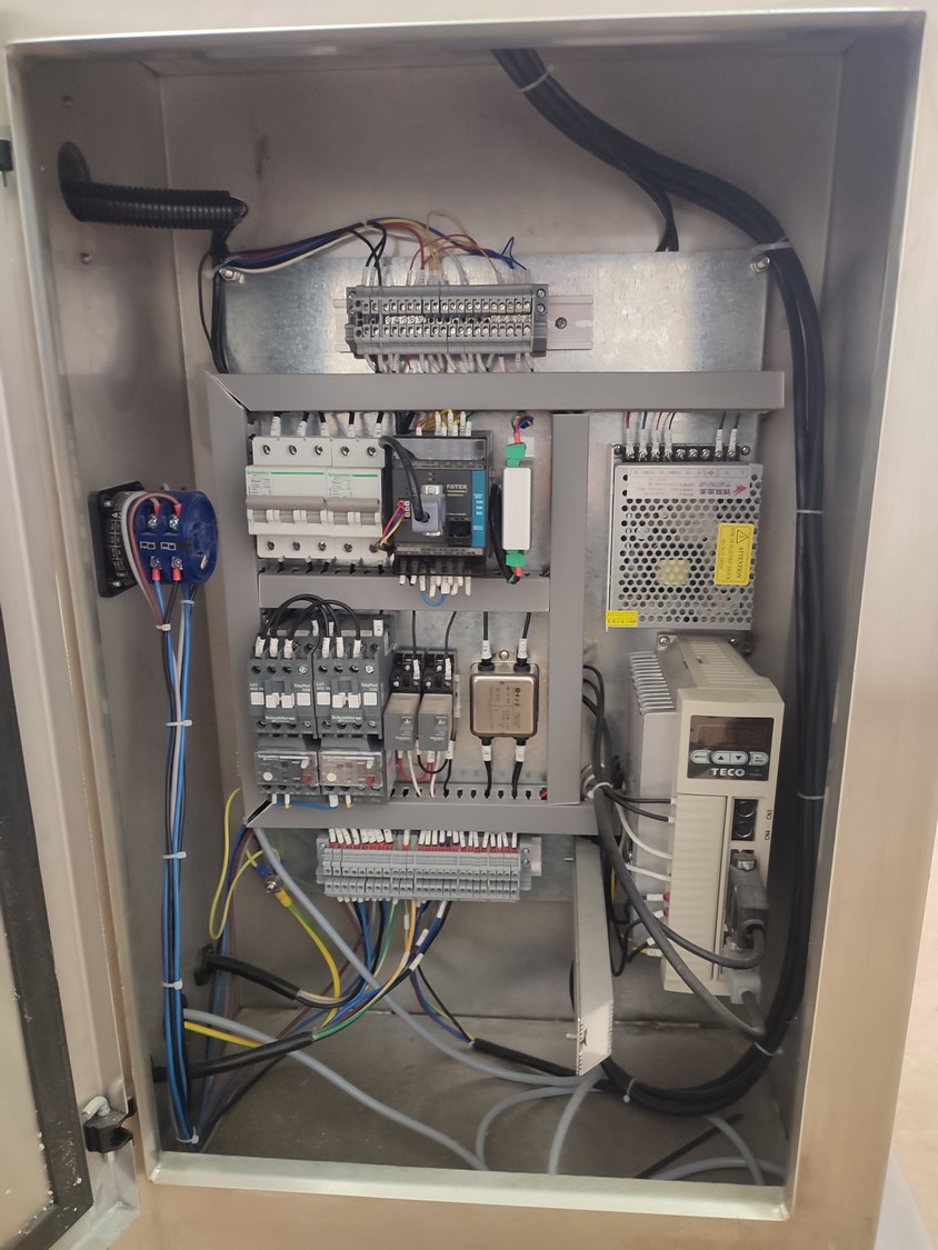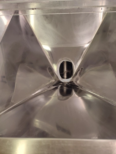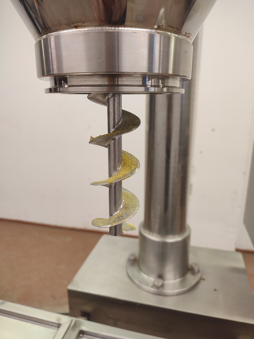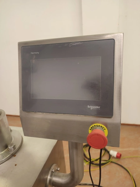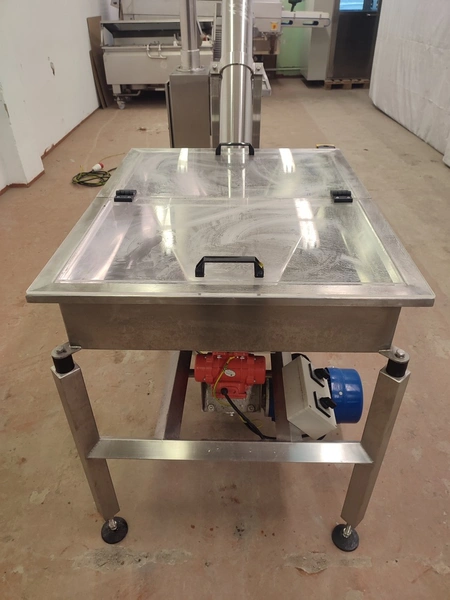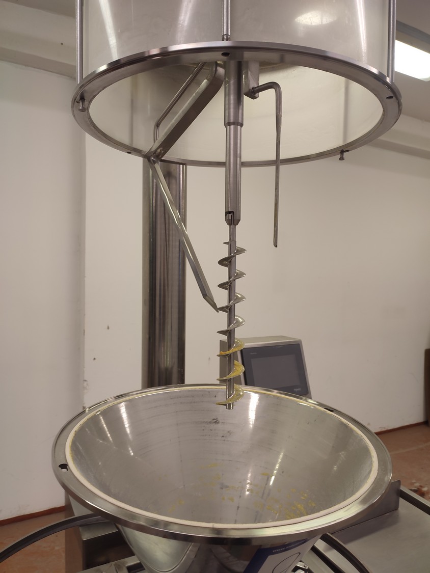 Depositor with checkweigher and vibrating elevating screw, total dimensions: 3640 mm x 810 mm x 2470 mm.