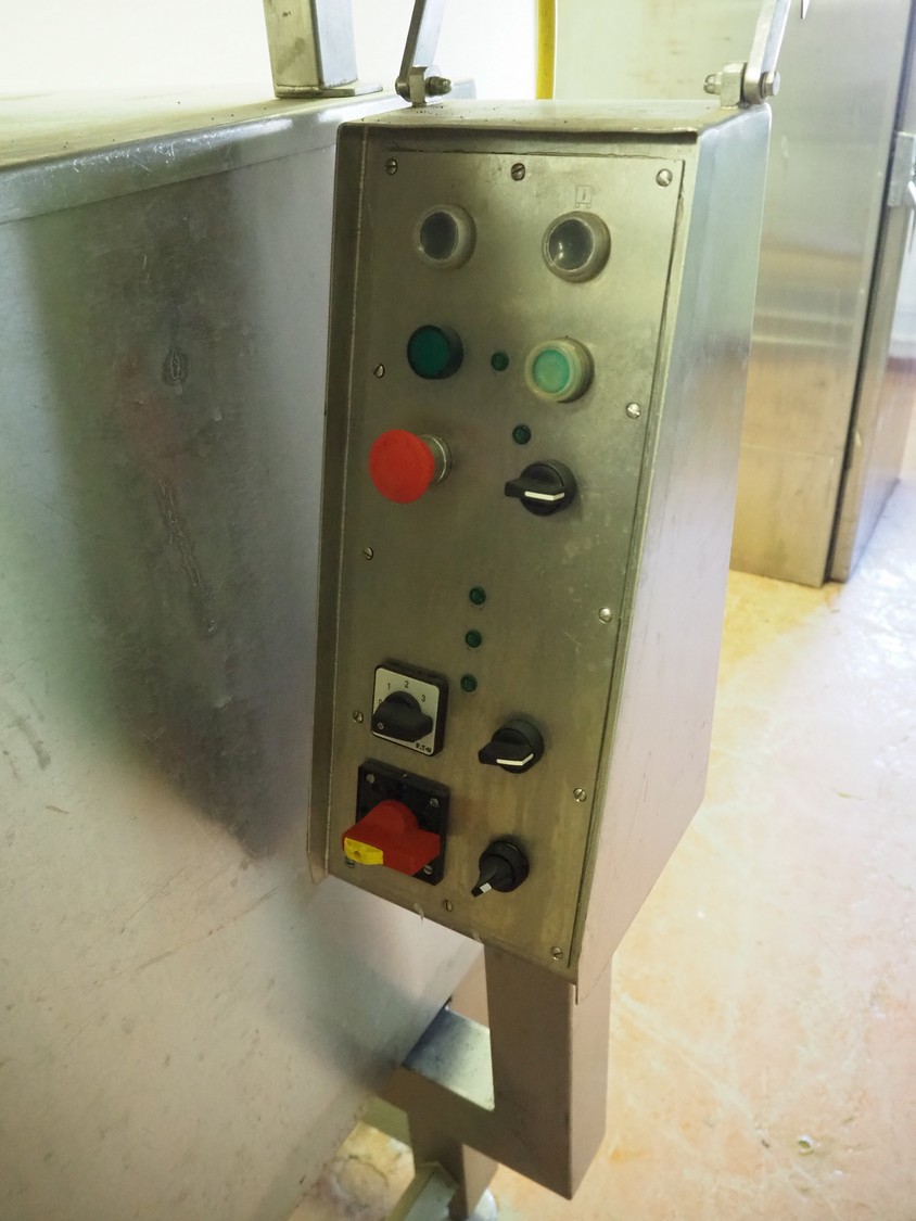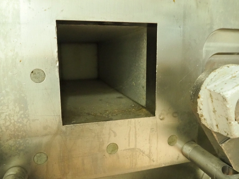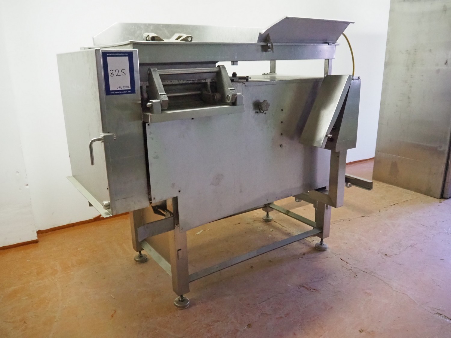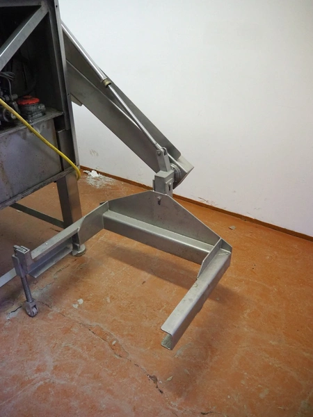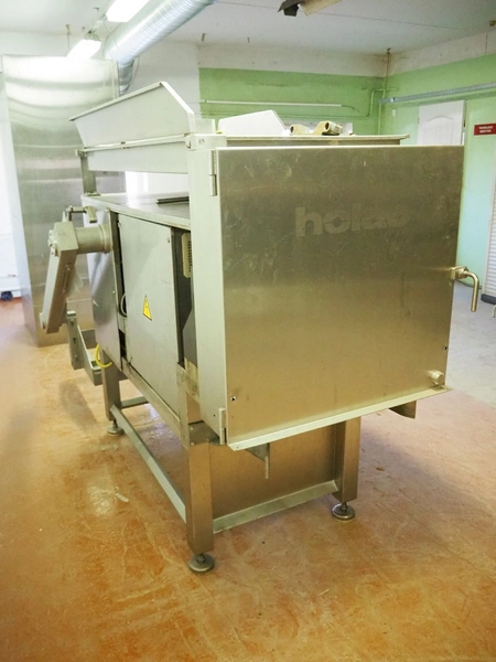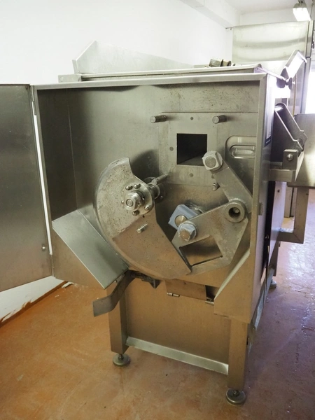 Holac dicer with lifter for 200 liter meat bins, dimensions chamber: 115 mm x 115 mm, total dimensions: 2100 mm x 950 mm x 1750 mm. Missing cover.