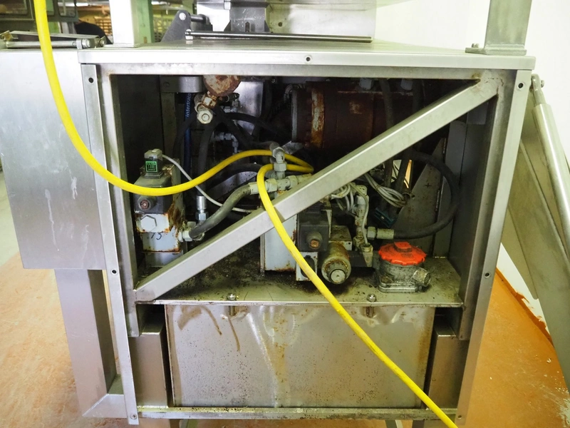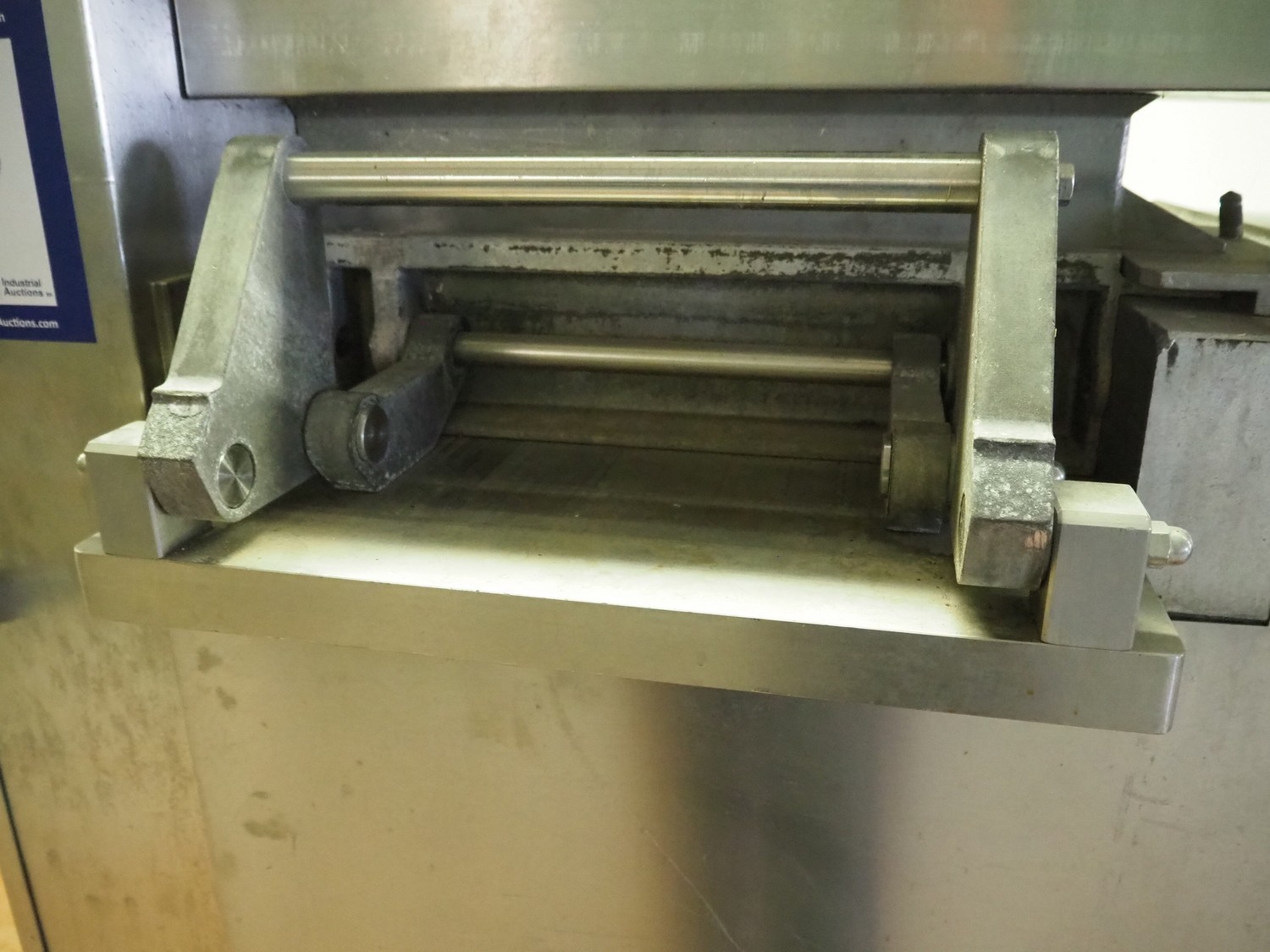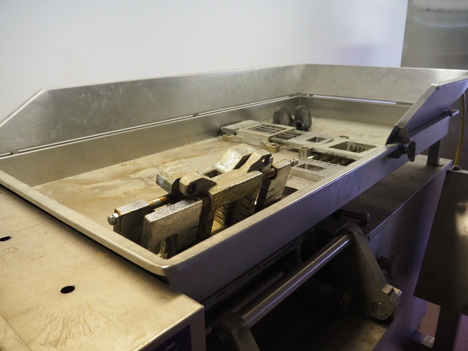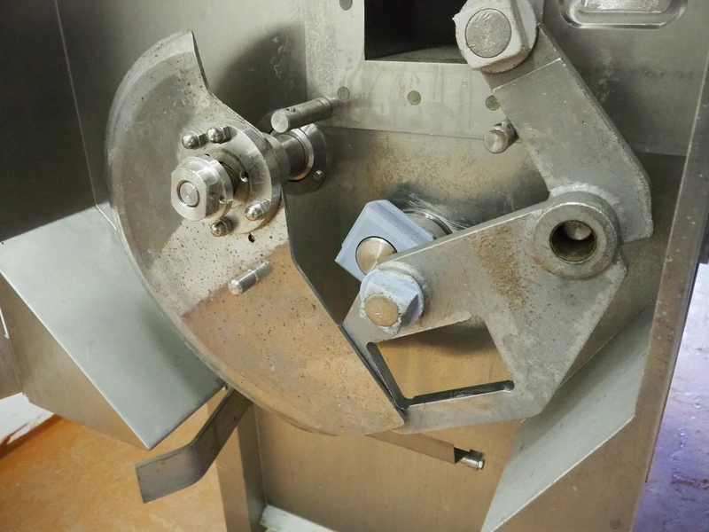 Holac dicer with lifter for 200 liter meat bins, dimensions chamber: 115 mm x 115 mm, total dimensions: 2100 mm x 950 mm x 1750 mm. Missing cover.
