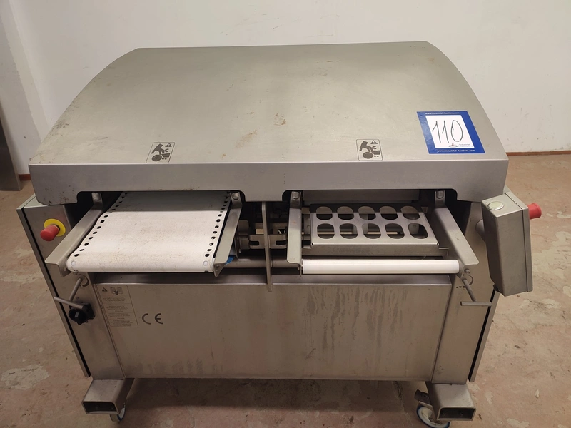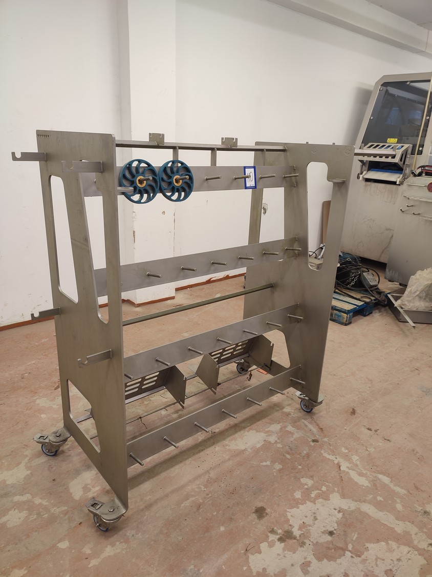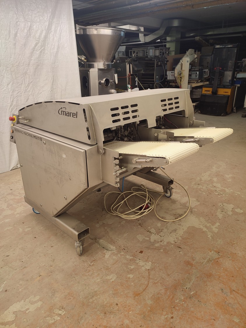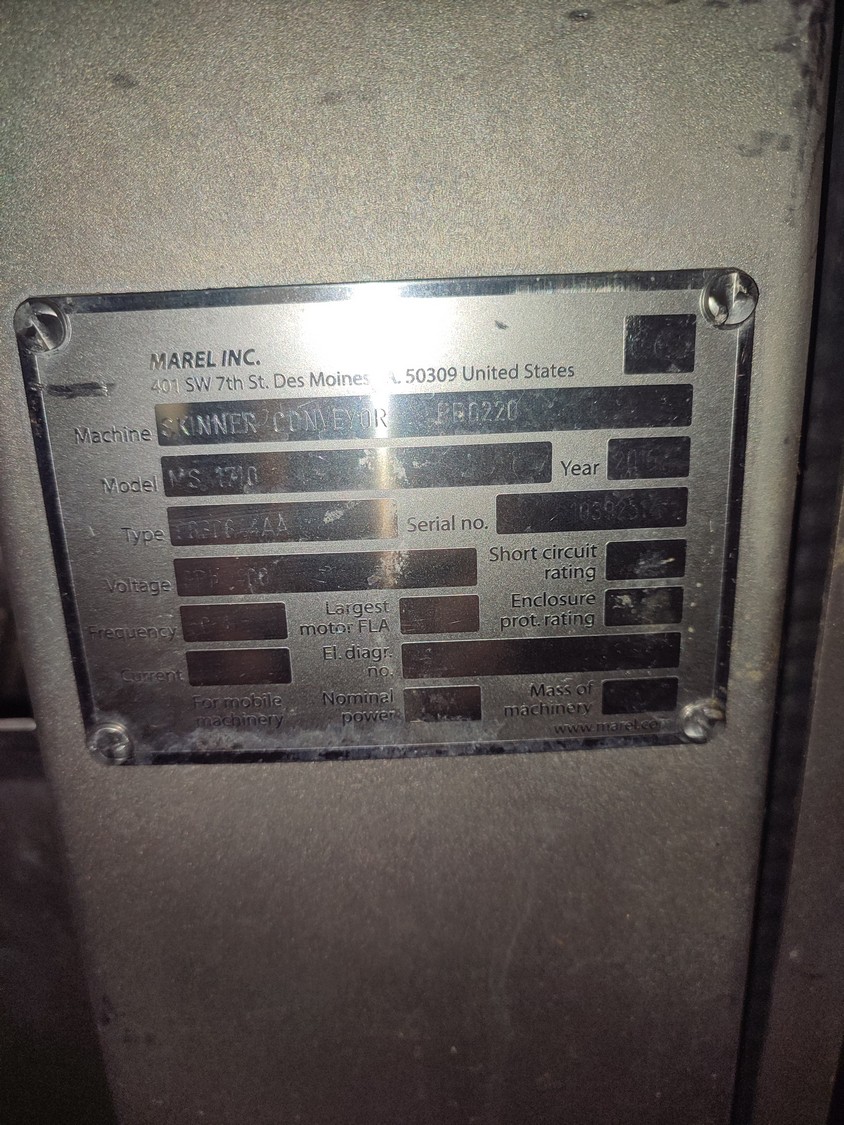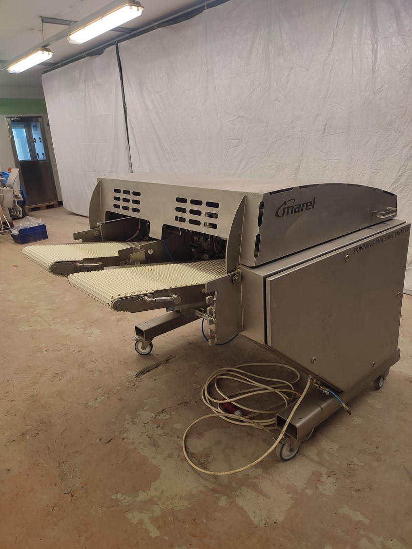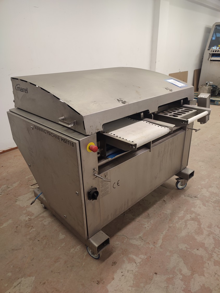 Marel mobile double skinning machine for fish, model: MS1710, type: 9830844AA, machine number: 10392514, year of construction: 2016, 400 V, 3 Ph, 50 Hz, 5 A, plastic belt, belt width: 355 mm, working width: (2x) 365 mm, skinning machine dimensions: 1430 mm x 1740 mm x 1260 mm. Including s/s trolley, dimensions: 1700 mm x 600 mm x 1420 mm. Missing belt.
