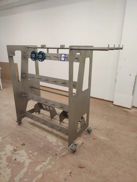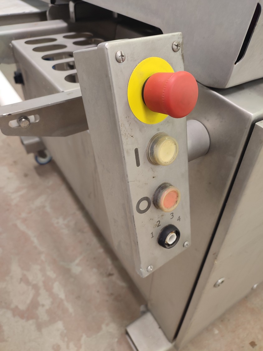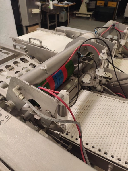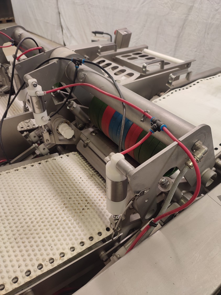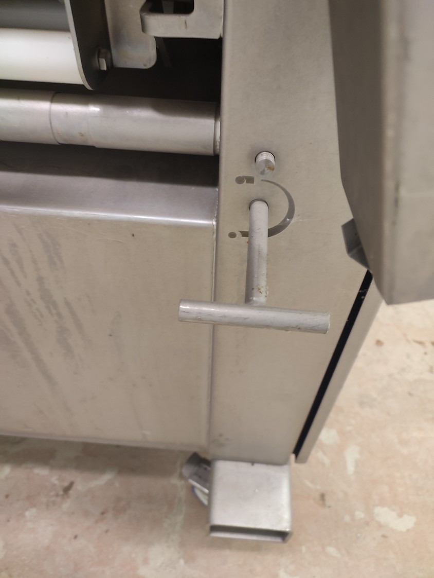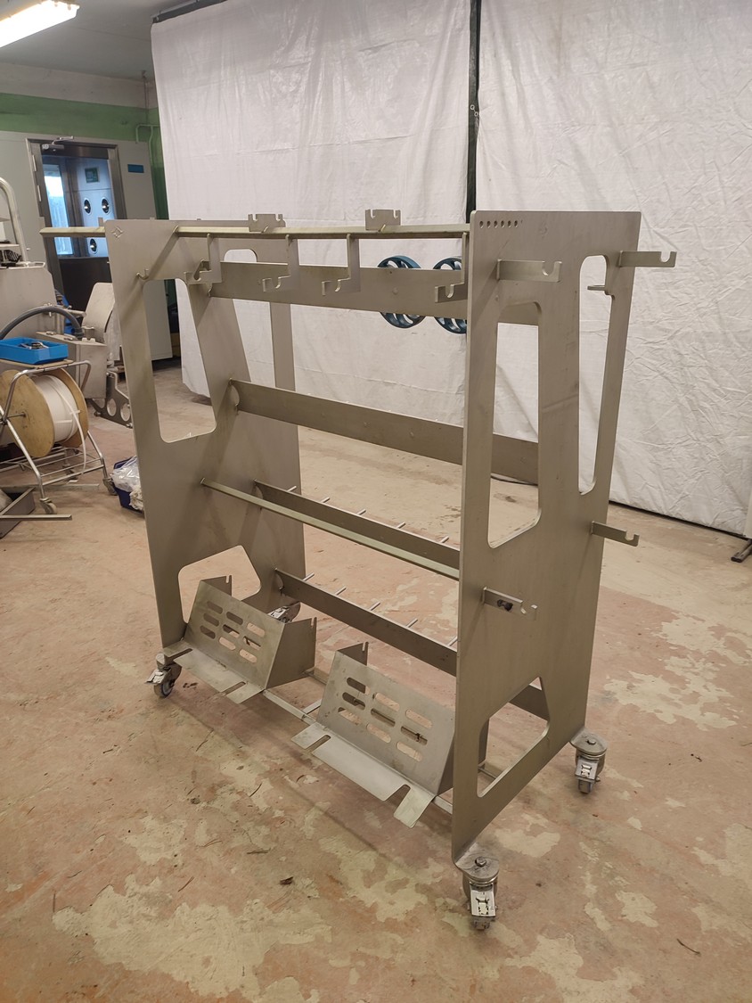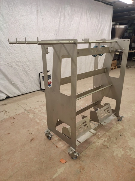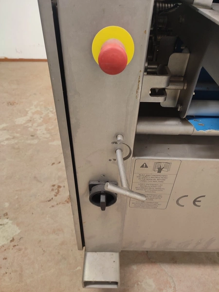 Marel mobile double skinning machine for fish, model: MS1710, type: 9830844AA, machine number: 10392514, year of construction: 2016, 400 V, 3 Ph, 50 Hz, 5 A, plastic belt, belt width: 355 mm, working width: (2x) 365 mm, skinning machine dimensions: 1430 mm x 1740 mm x 1260 mm. Including s/s trolley, dimensions: 1700 mm x 600 mm x 1420 mm. Missing belt.