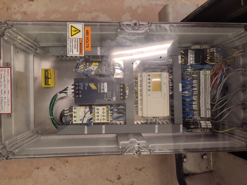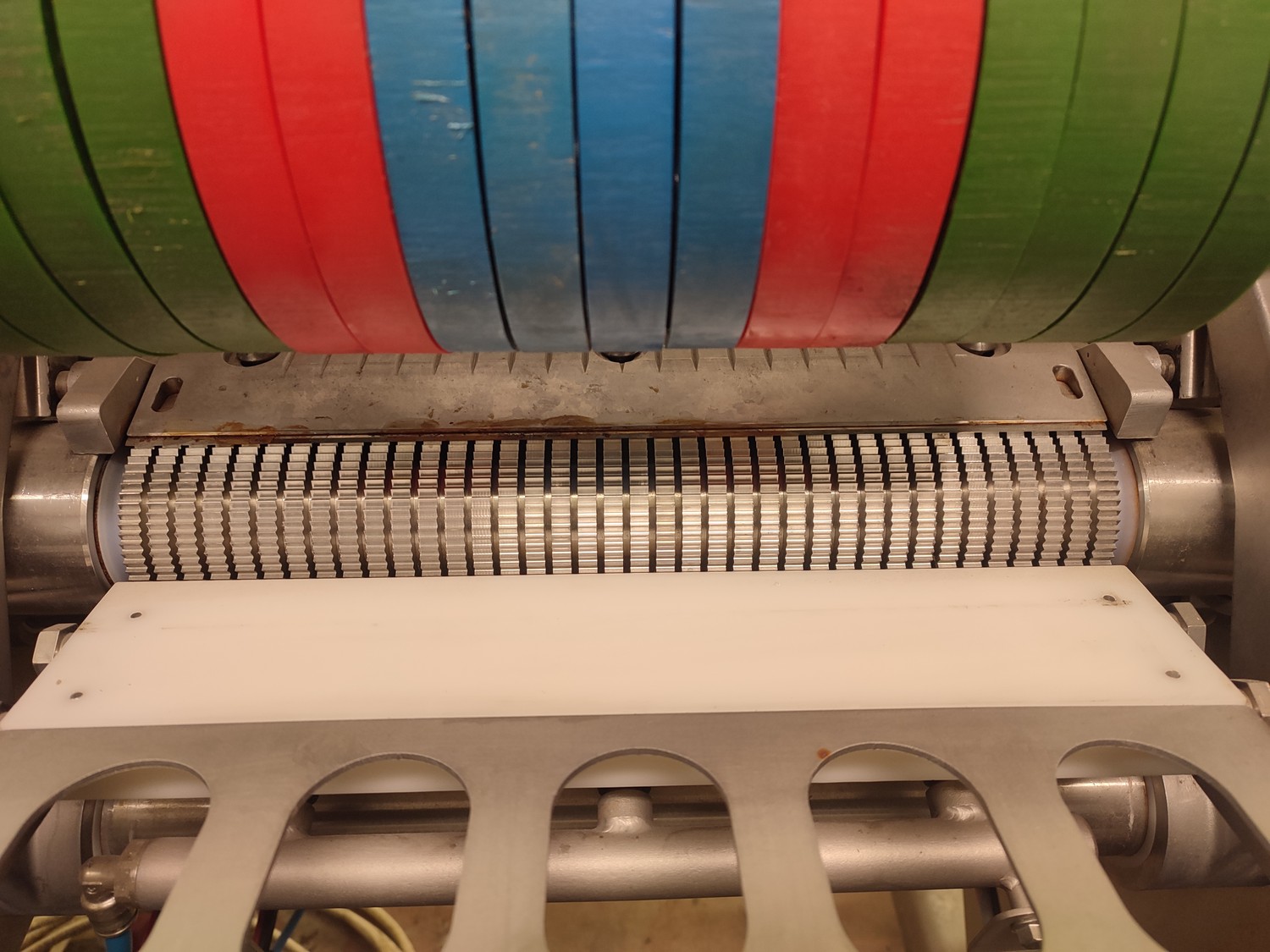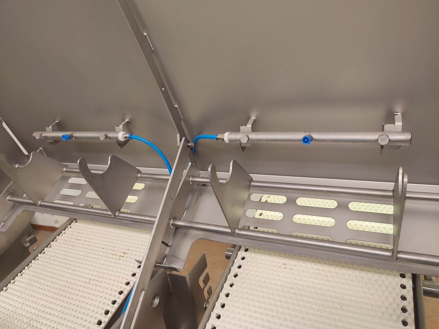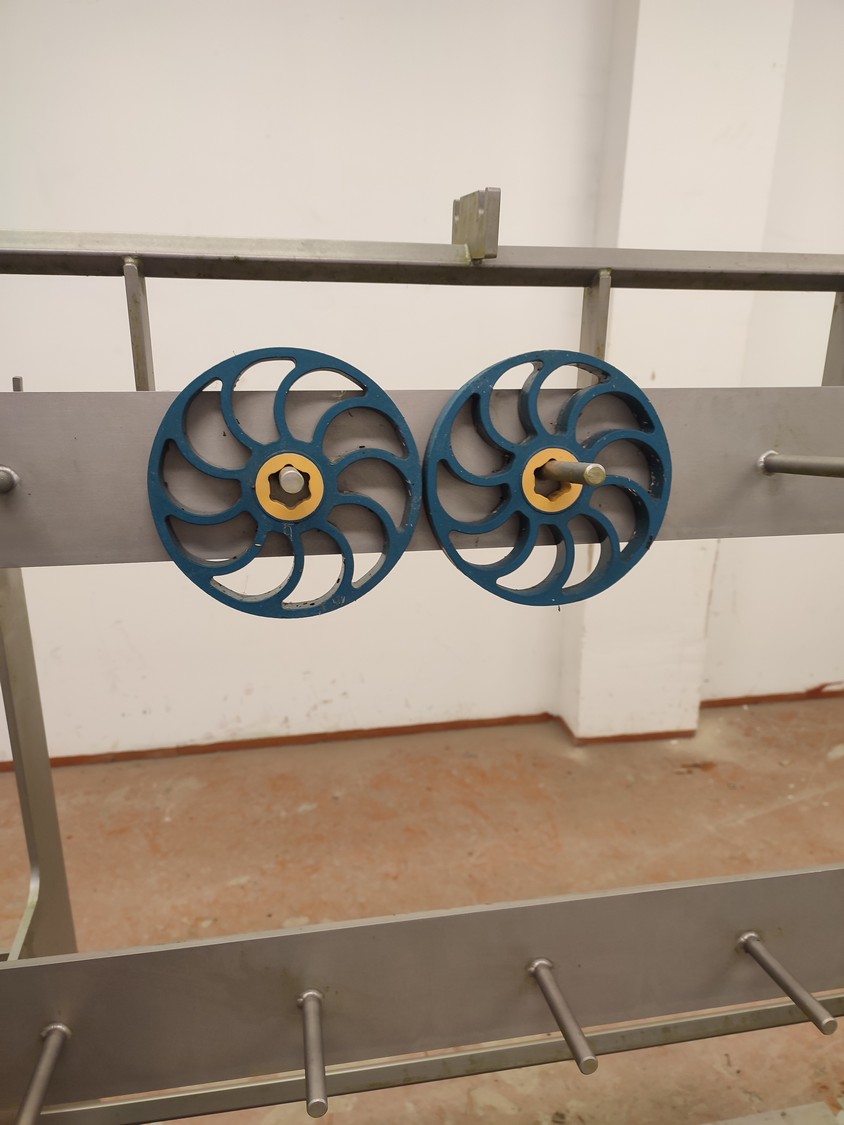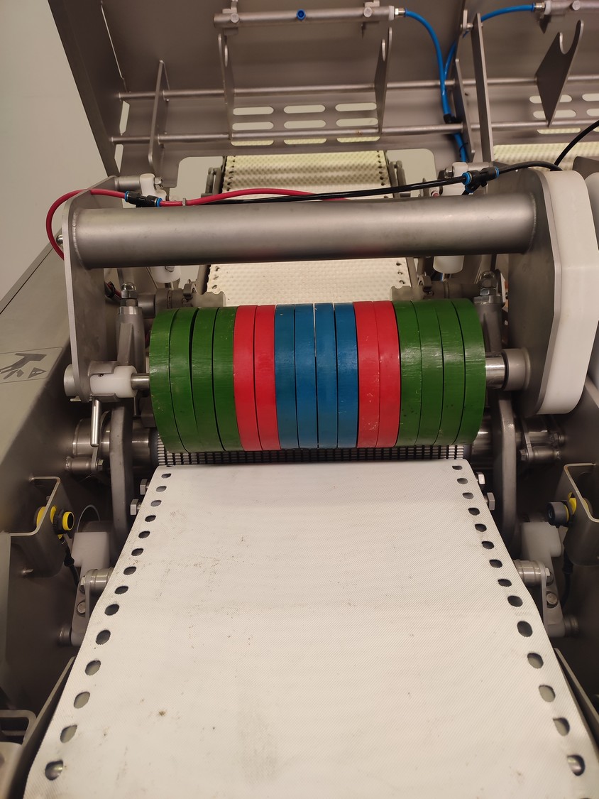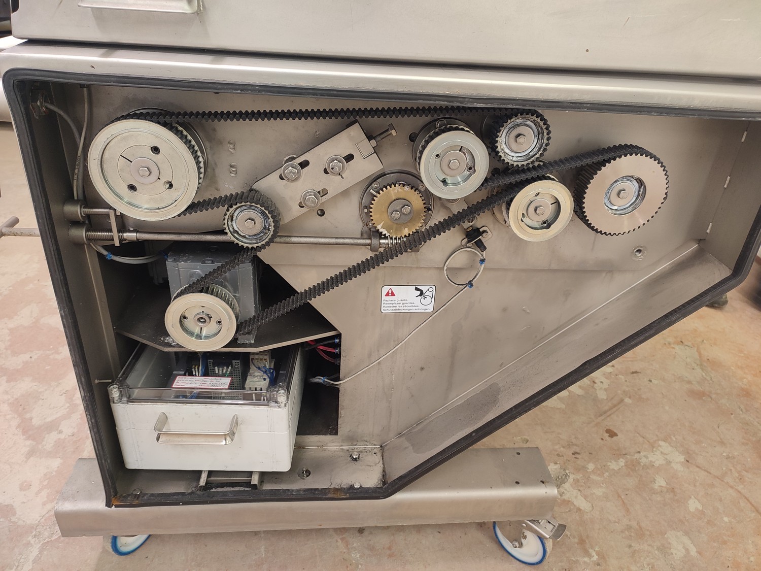 Marel mobile double skinning machine for fish, model: MS1710, type: 9830844AA, machine number: 10392514, year of construction: 2016, 400 V, 3 Ph, 50 Hz, 5 A, plastic belt, belt width: 355 mm, working width: (2x) 365 mm, skinning machine dimensions: 1430 mm x 1740 mm x 1260 mm. Including s/s trolley, dimensions: 1700 mm x 600 mm x 1420 mm. Missing belt.