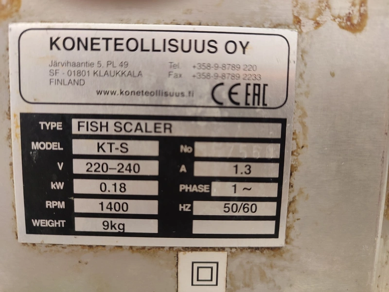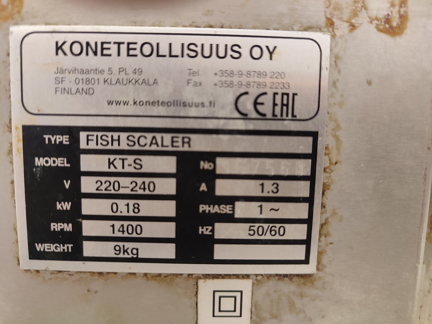 Koneteollisuus OY scaler, type: FISH SCALER, model: KT-S, number: 167560, 220-240 V, 1 Ph, 50/60 Hz, 1.3 A, 0.18 kW, weight: 9 kg, dimensions: 210 mm x 400 mm x 260 mm.