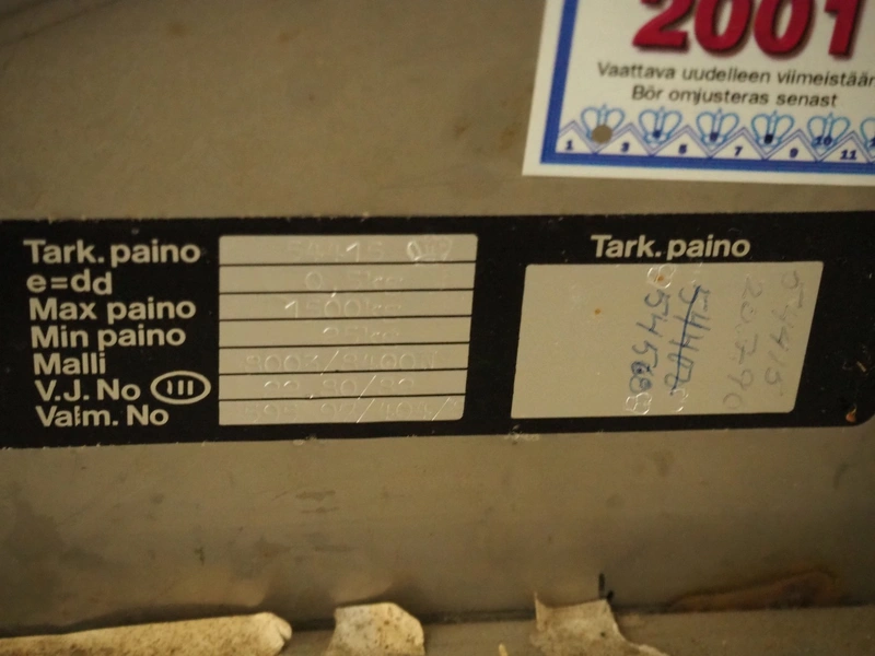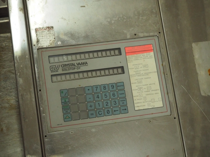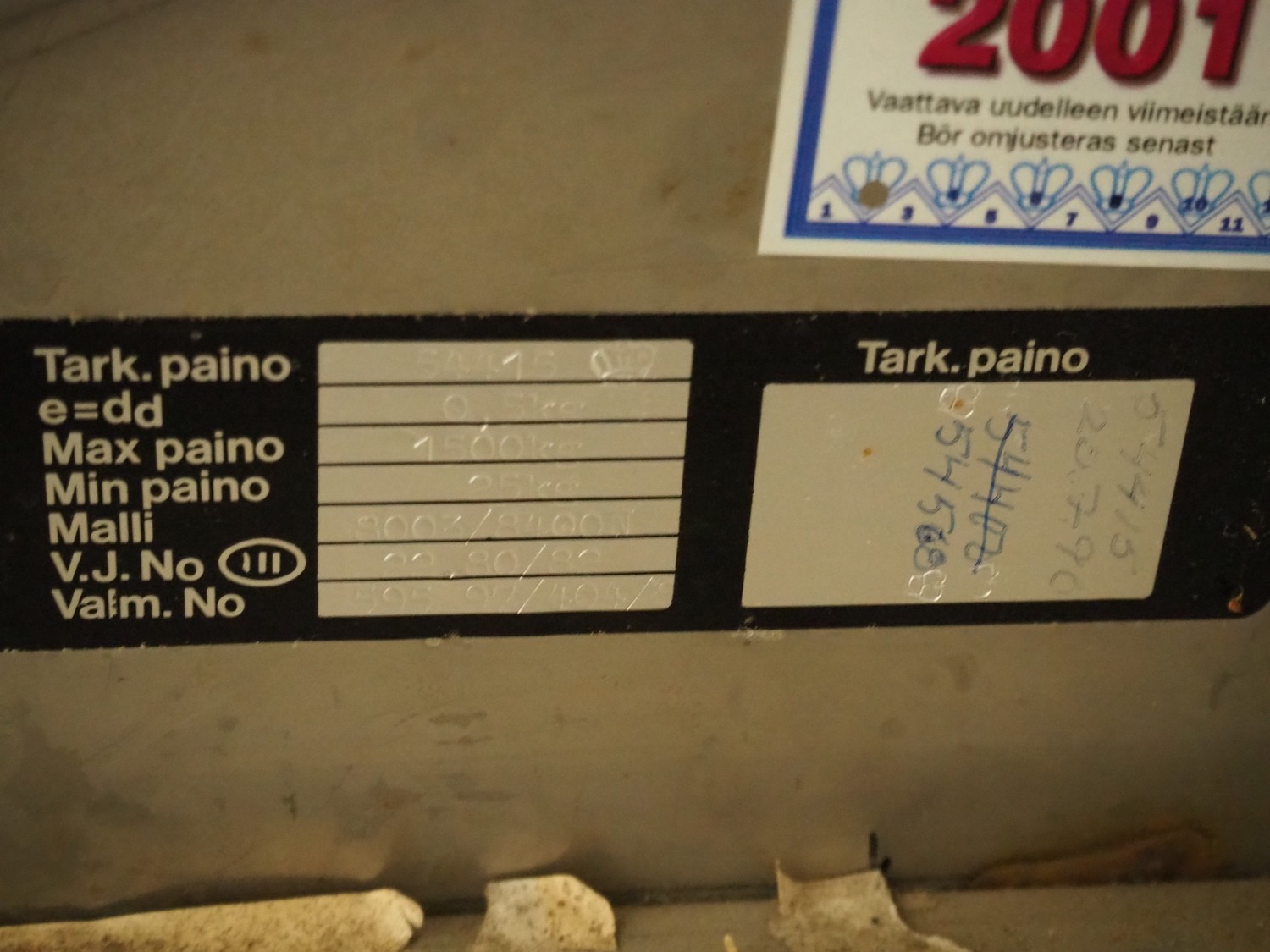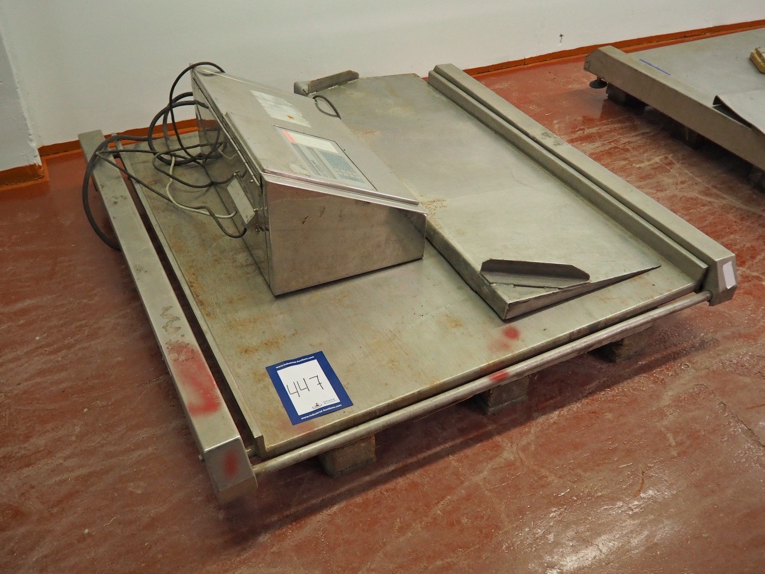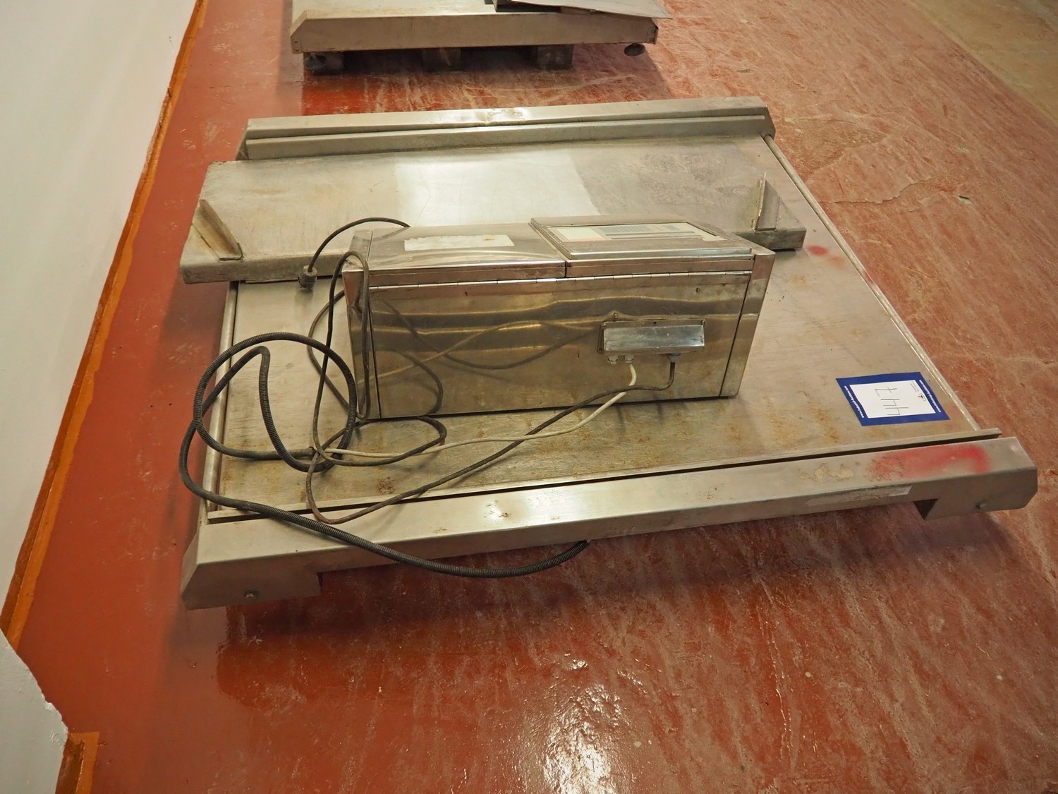 Floor weighing scale with CV Scales indicator, maximum weight: 1500 kg, minimum weight: 25 kg, e= 0.5 kg, dimensions: 1600 mm x 1500 mm x 270 mm.