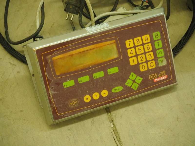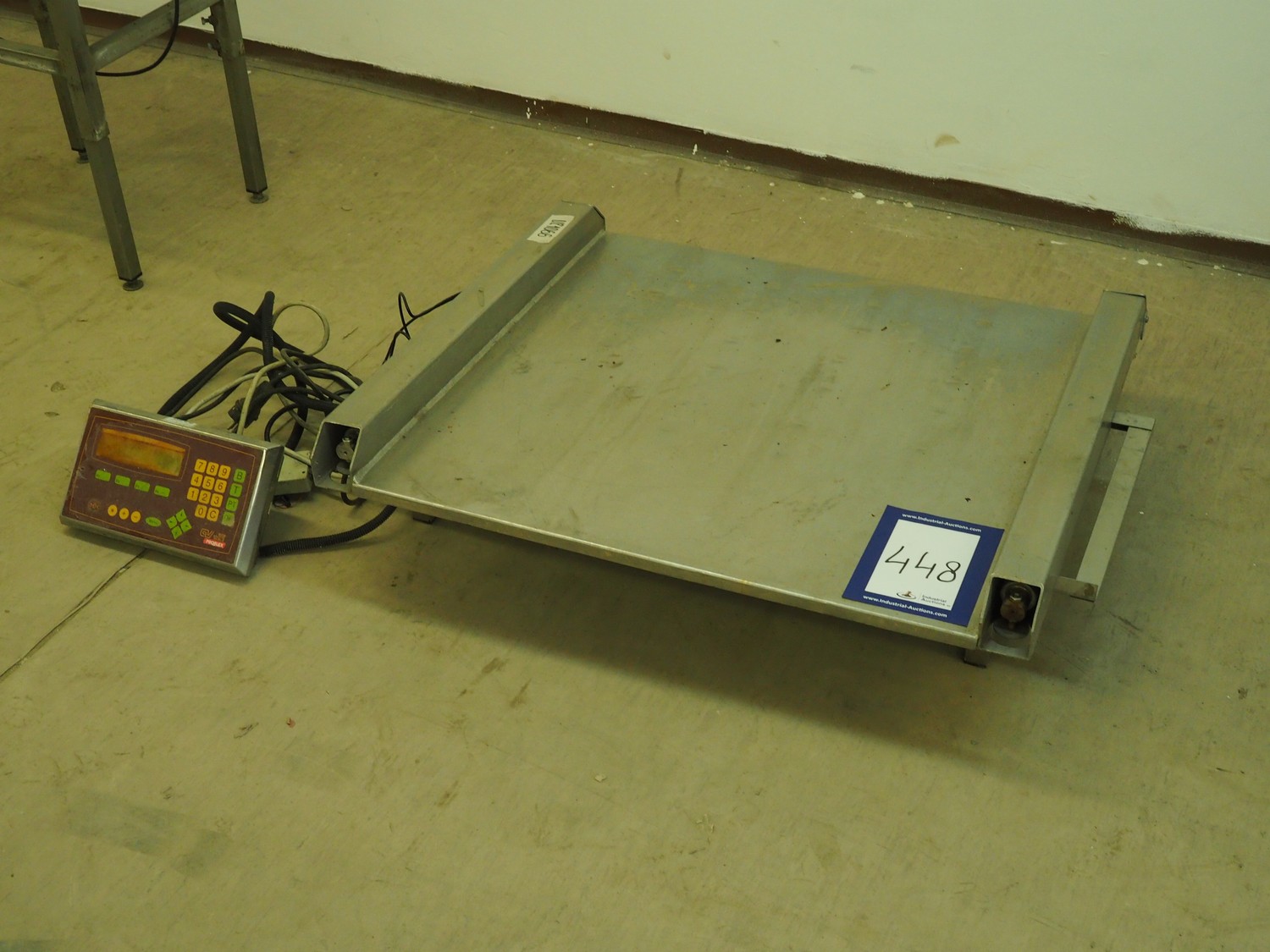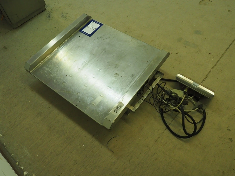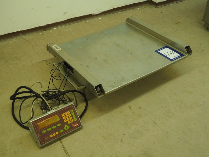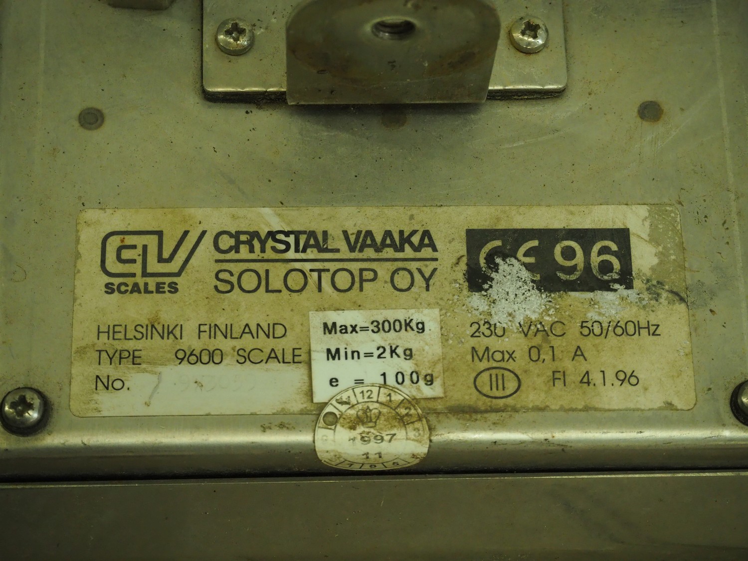 Crystal Vaaka Solotop Oy floor weighing scale with indicator, type indicator: 9600 scale, 230 V, 50/60 Hz, 0.1 A, maximum weight: 300 kg, minimum weight: 2 kg, e= 100 gram, dimensions scale: 760 mm x 670 mm x 990 mm.
