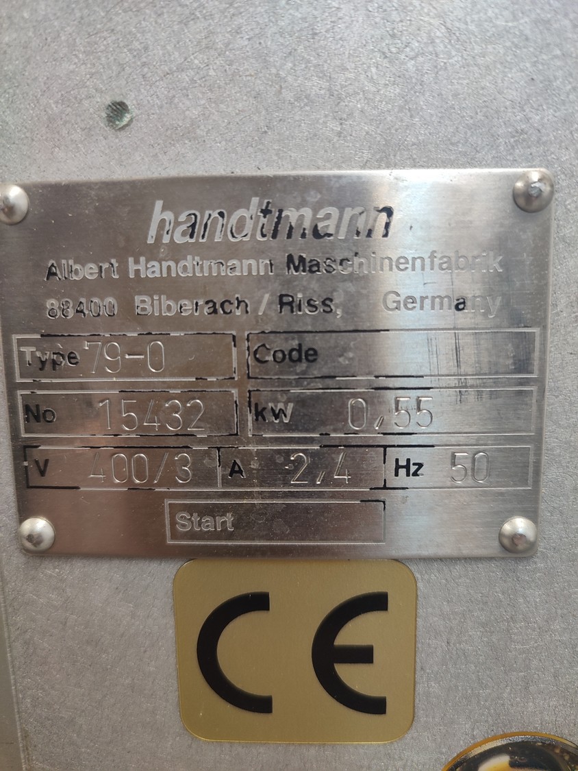 Handtmann meat ball forming device, type: 79-0, number: 15432, 400 V, 3 Ph, 50 Hz, 2.4 A, 0.55 kW, dimensions: 760 mm x 1130 mm x 1255 mm.