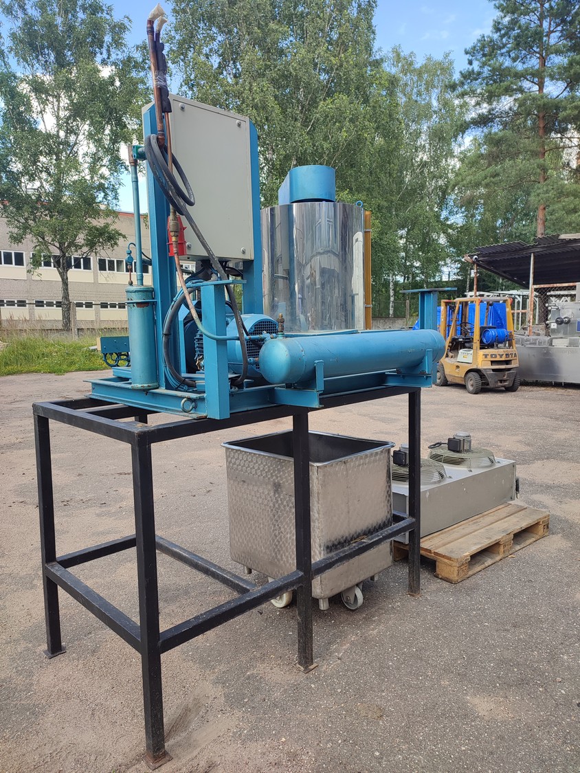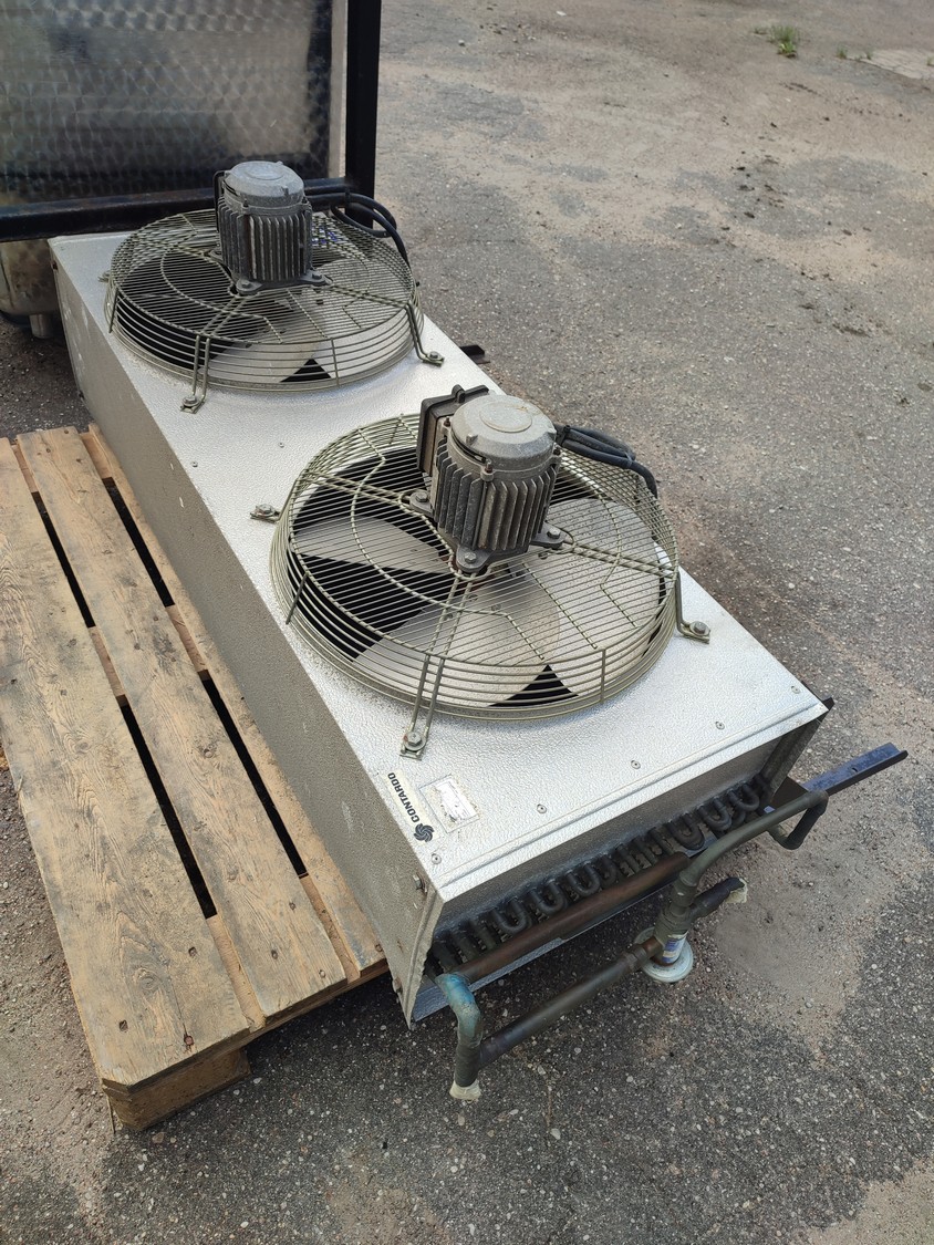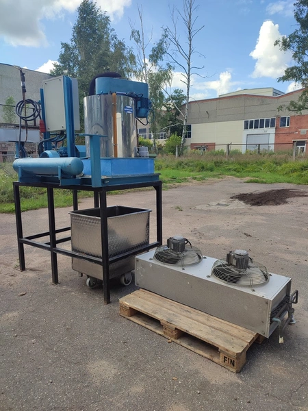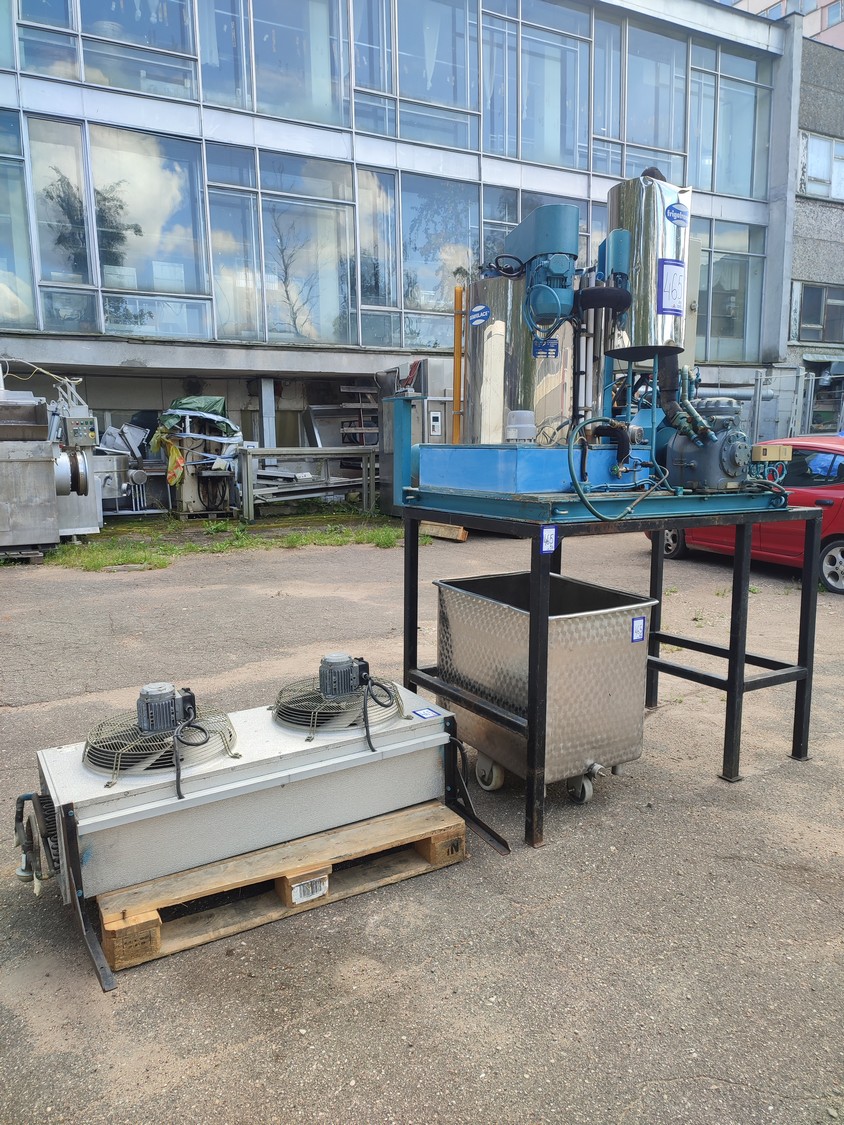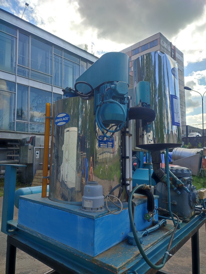 Geneglace ice machine on steel frame, type: F 90, number: 87520, year of construction: 10.05.88, refrigerant: R 22, ice machine total dimensions: 1660 mm x 1300 mm x 25700 mm. Including Contardo evaporator, 2 fans, evaporator dimensions: 1500 mm x 1000 mm x 700 mm.