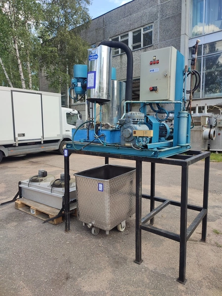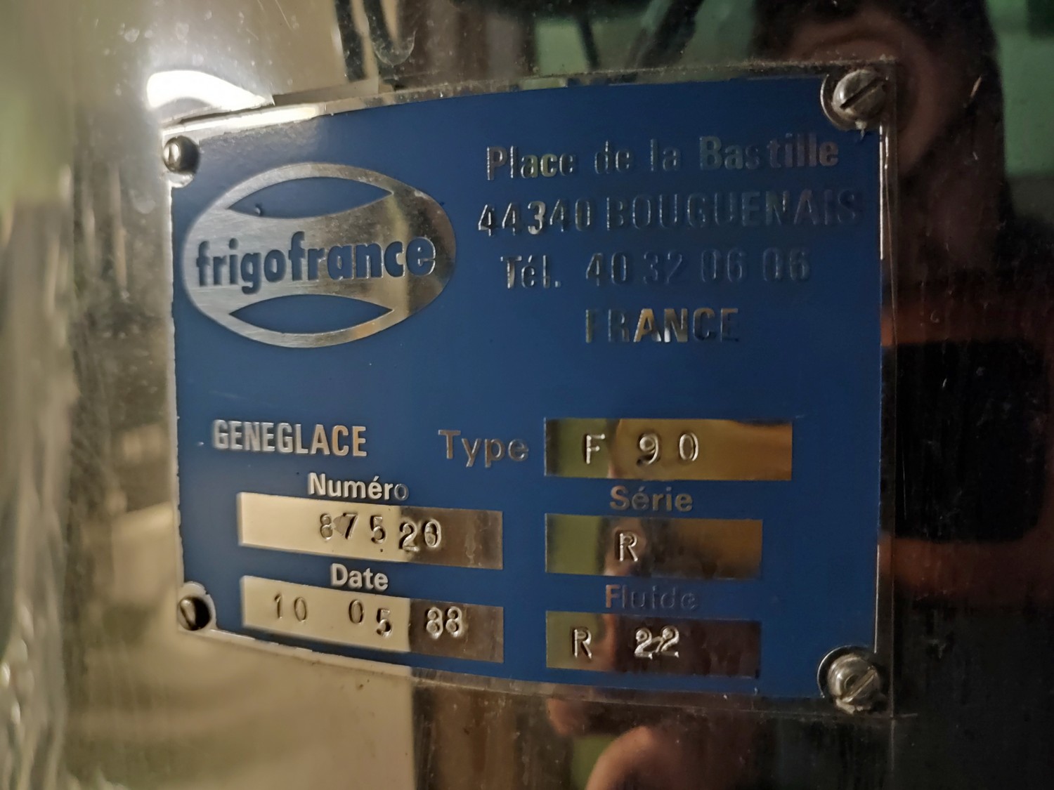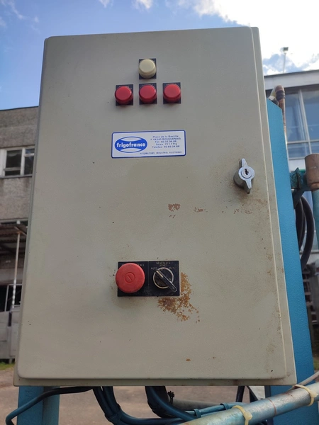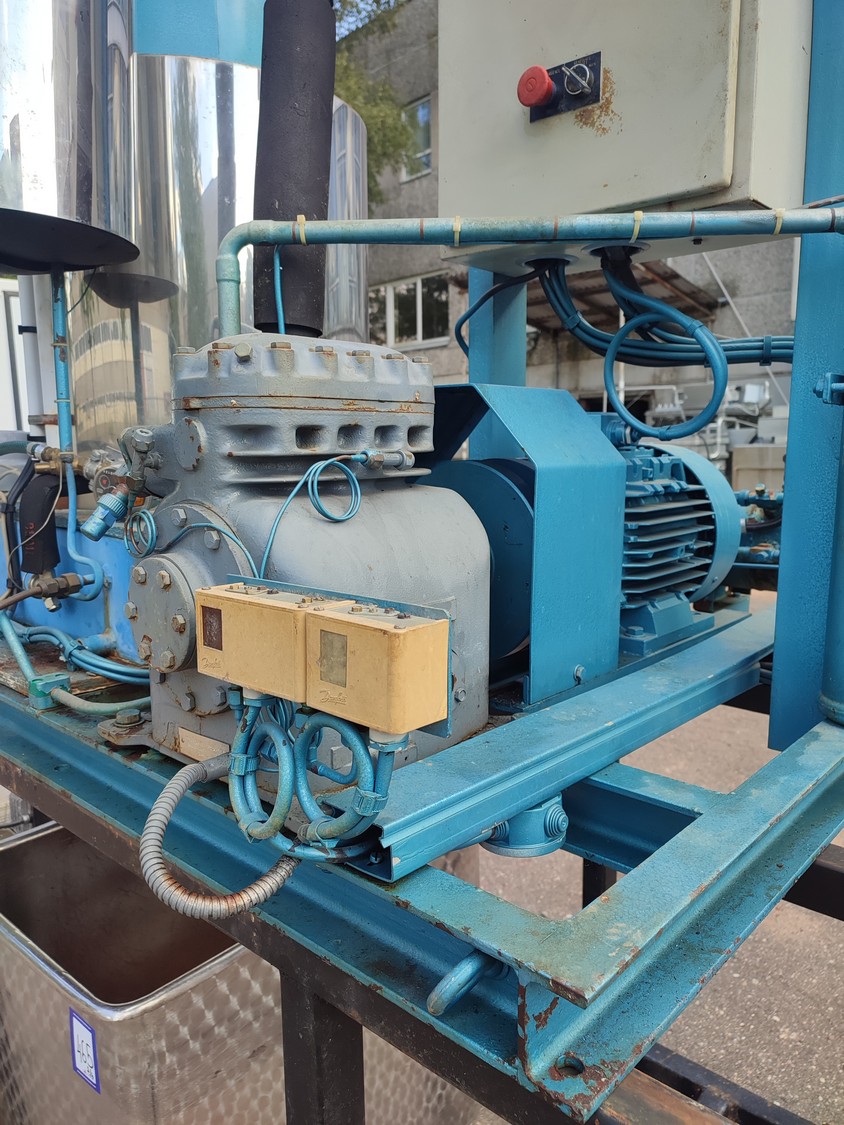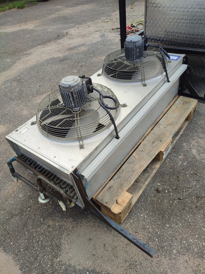 Geneglace ice machine on steel frame, type: F 90, number: 87520, year of construction: 10.05.88, refrigerant: R 22, ice machine total dimensions: 1660 mm x 1300 mm x 25700 mm. Including Contardo evaporator, 2 fans, evaporator dimensions: 1500 mm x 1000 mm x 700 mm.