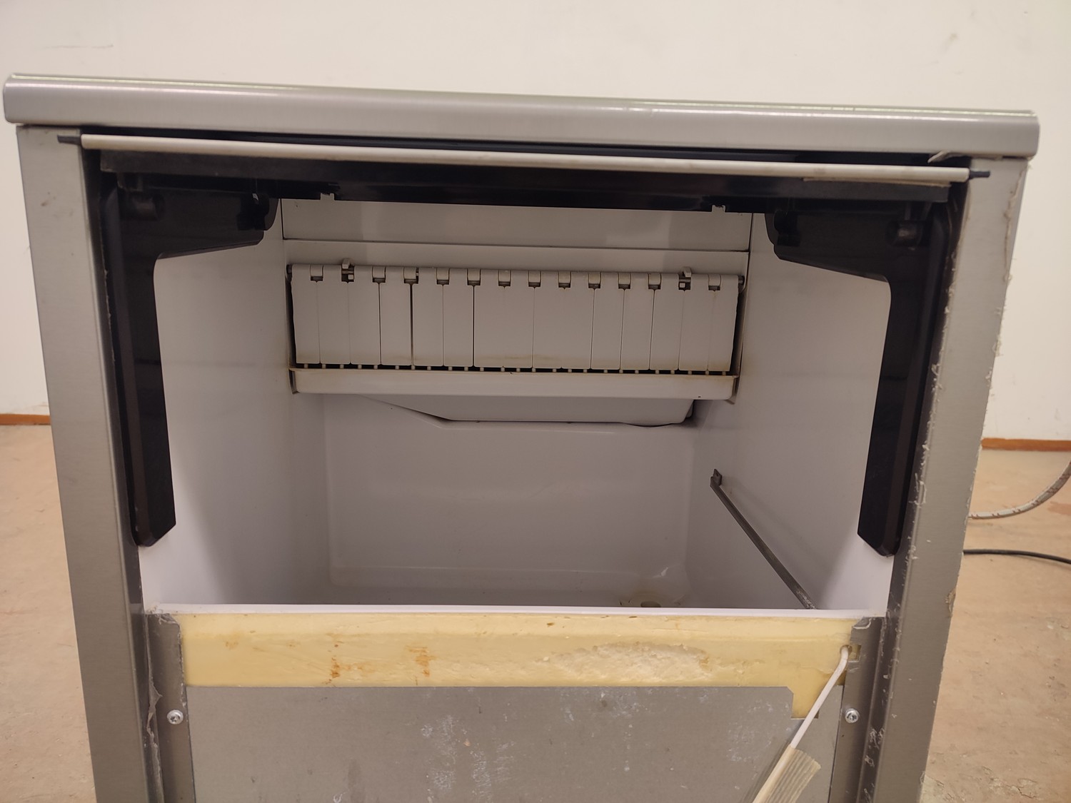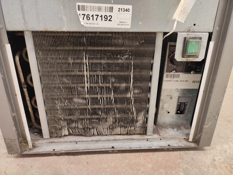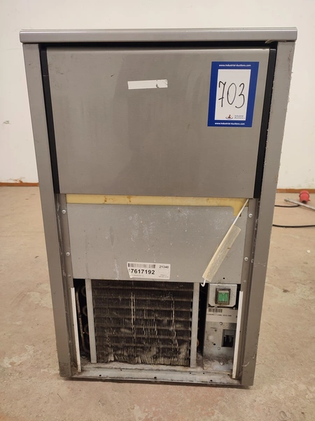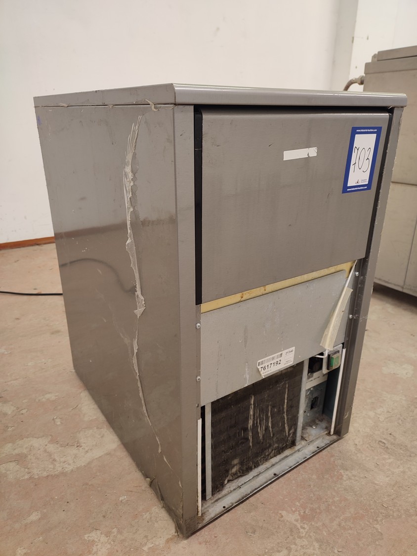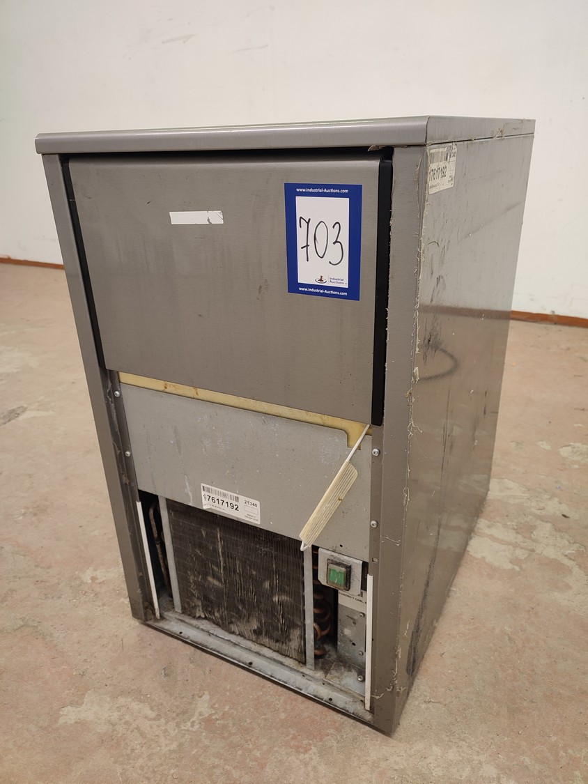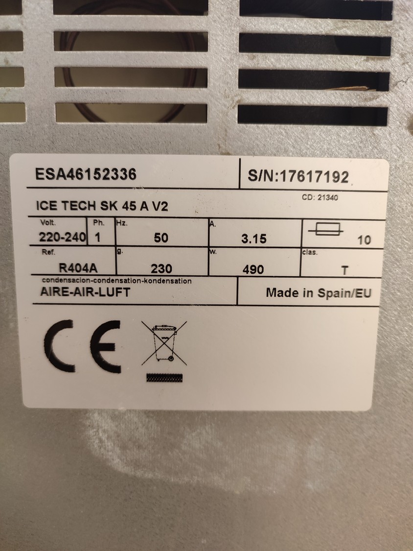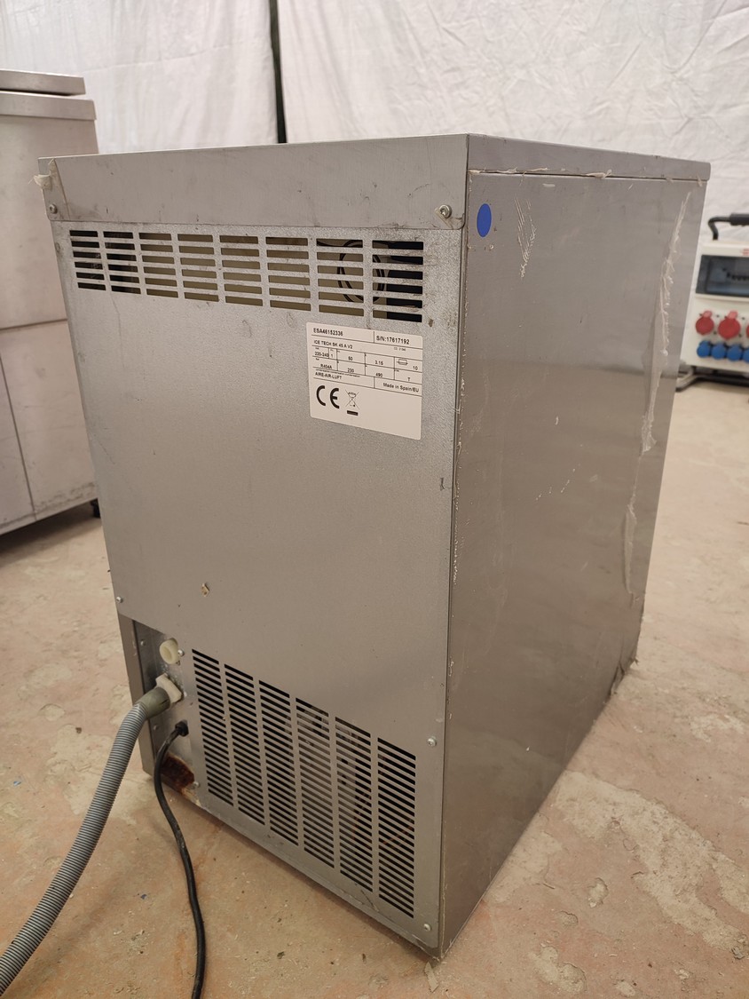 Ice Tech ice machine with ice bunker, model: SK 45 A V2, serial number: 17617192, 220-240 V, 50 Hz, 3.15 A, 490 W, refrigerant: R404A/230 g, dimensions: 435 mm x 600 mm x 715 mm. Missing cover.