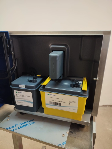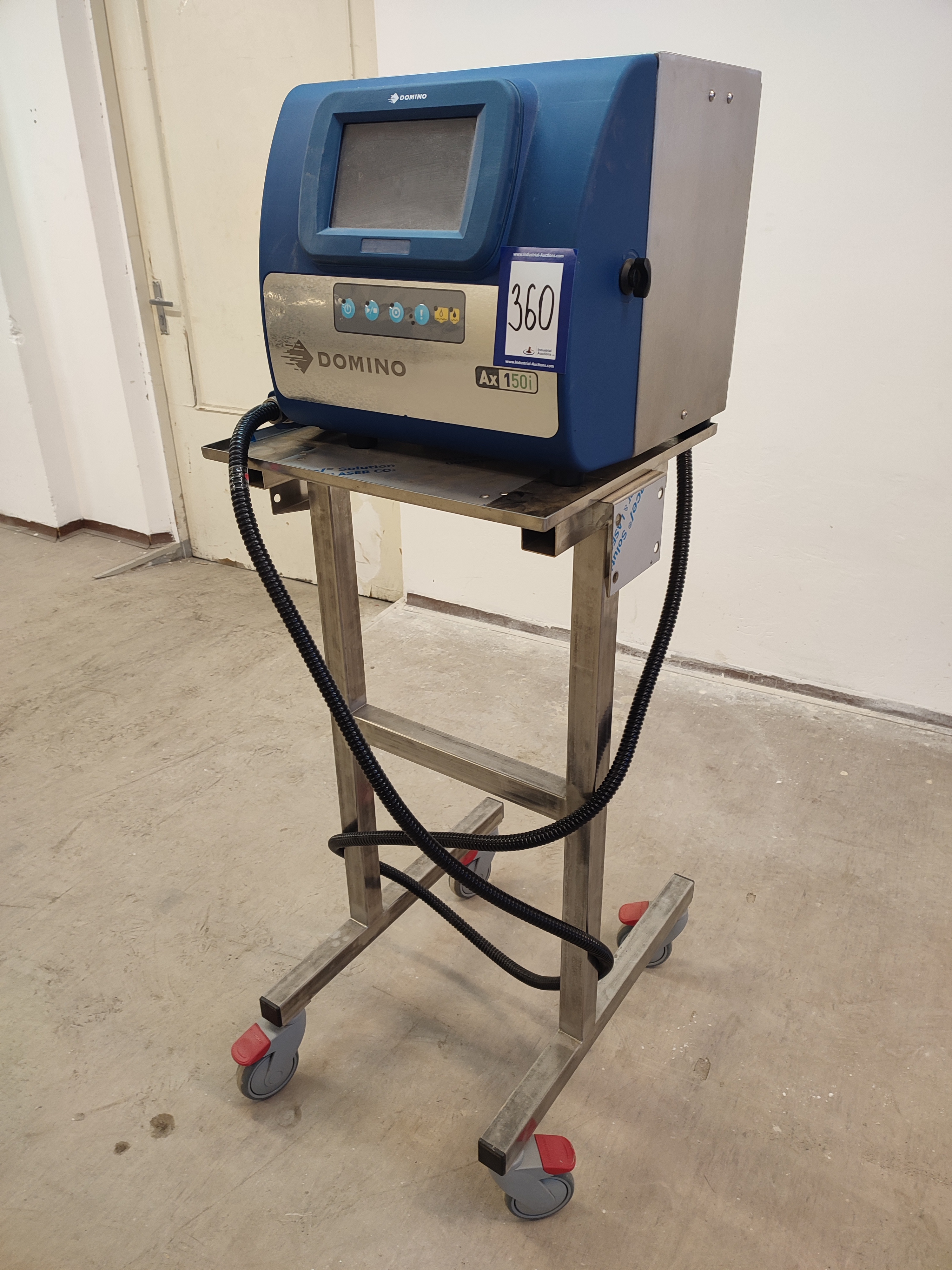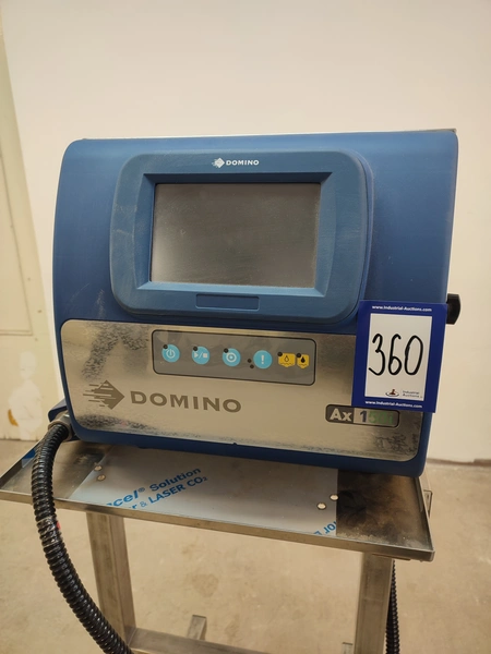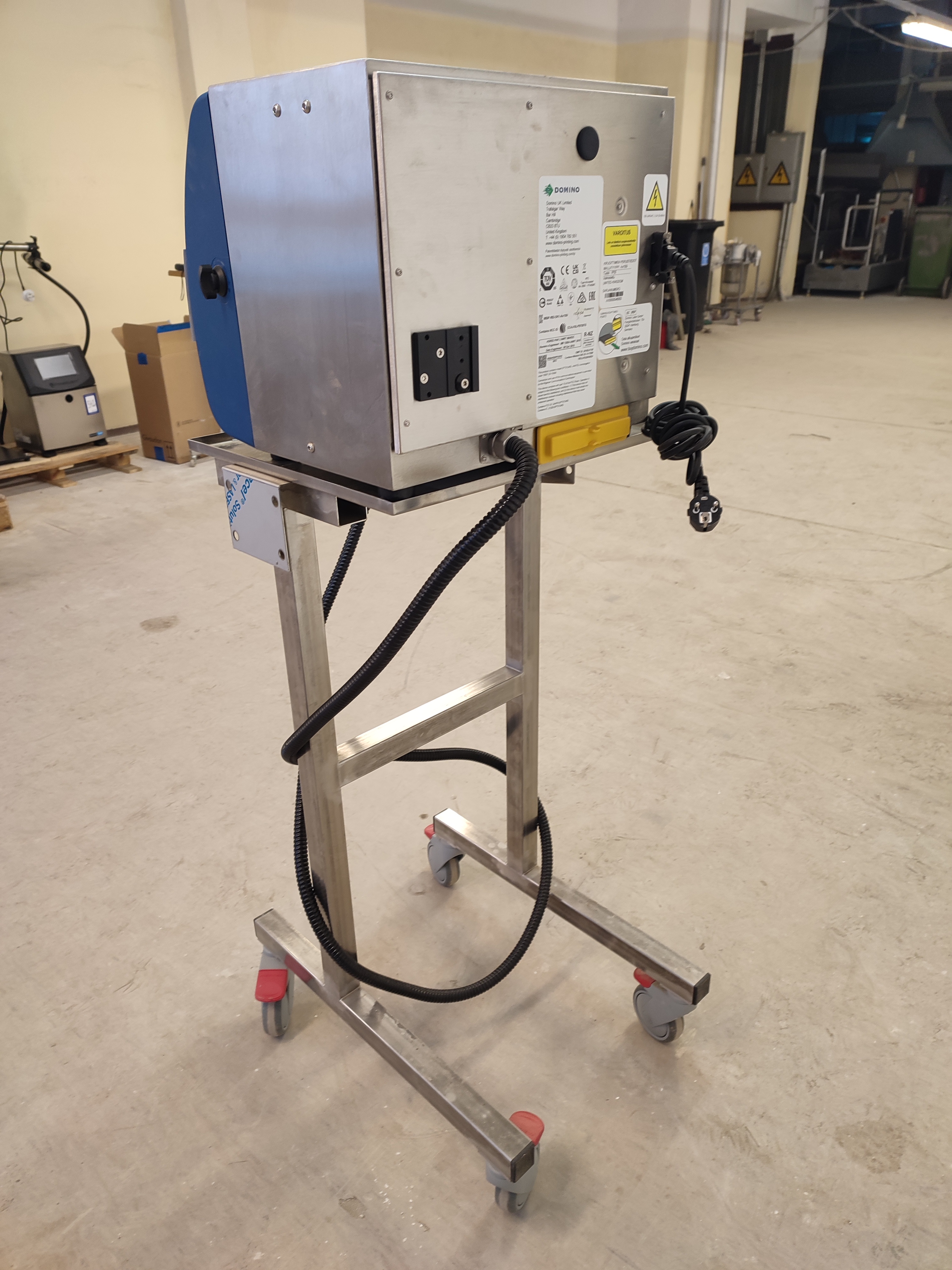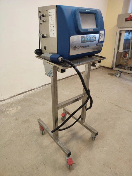 Domino mobile inkjet printer, model: Ax150i, serial number: AX0000046002, 100-240 V, 50-60 Hz, 3.5 A, dimensions: 500 mm x 610 mm x 1370 mm.