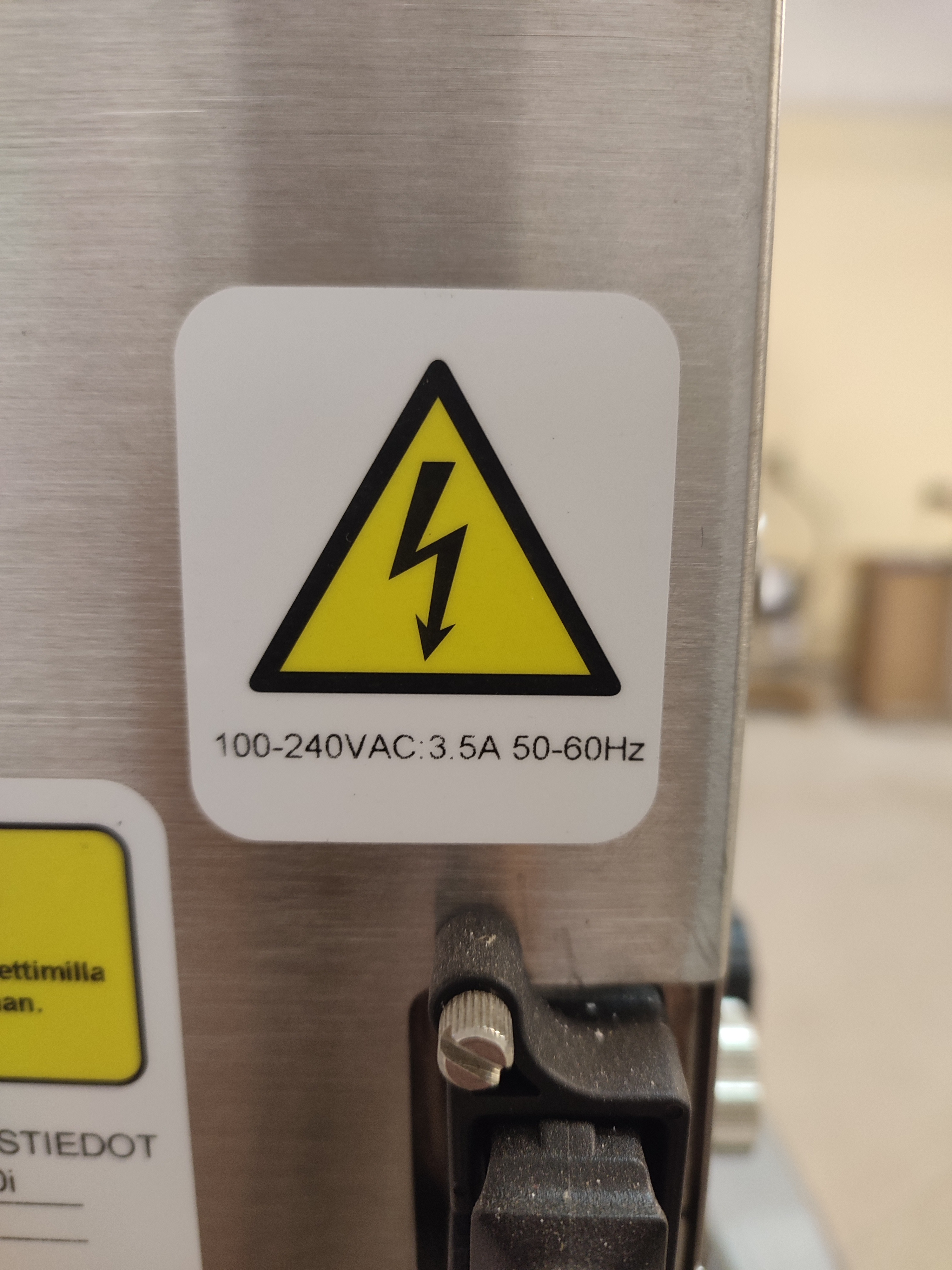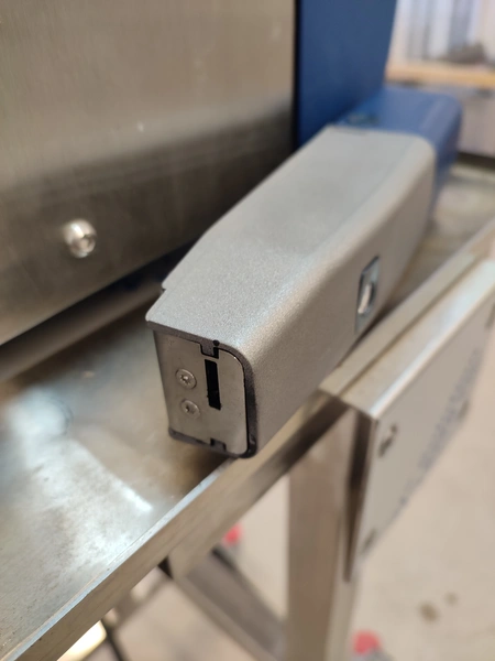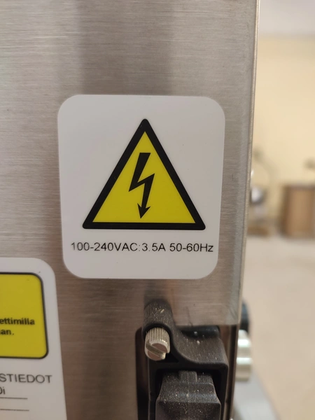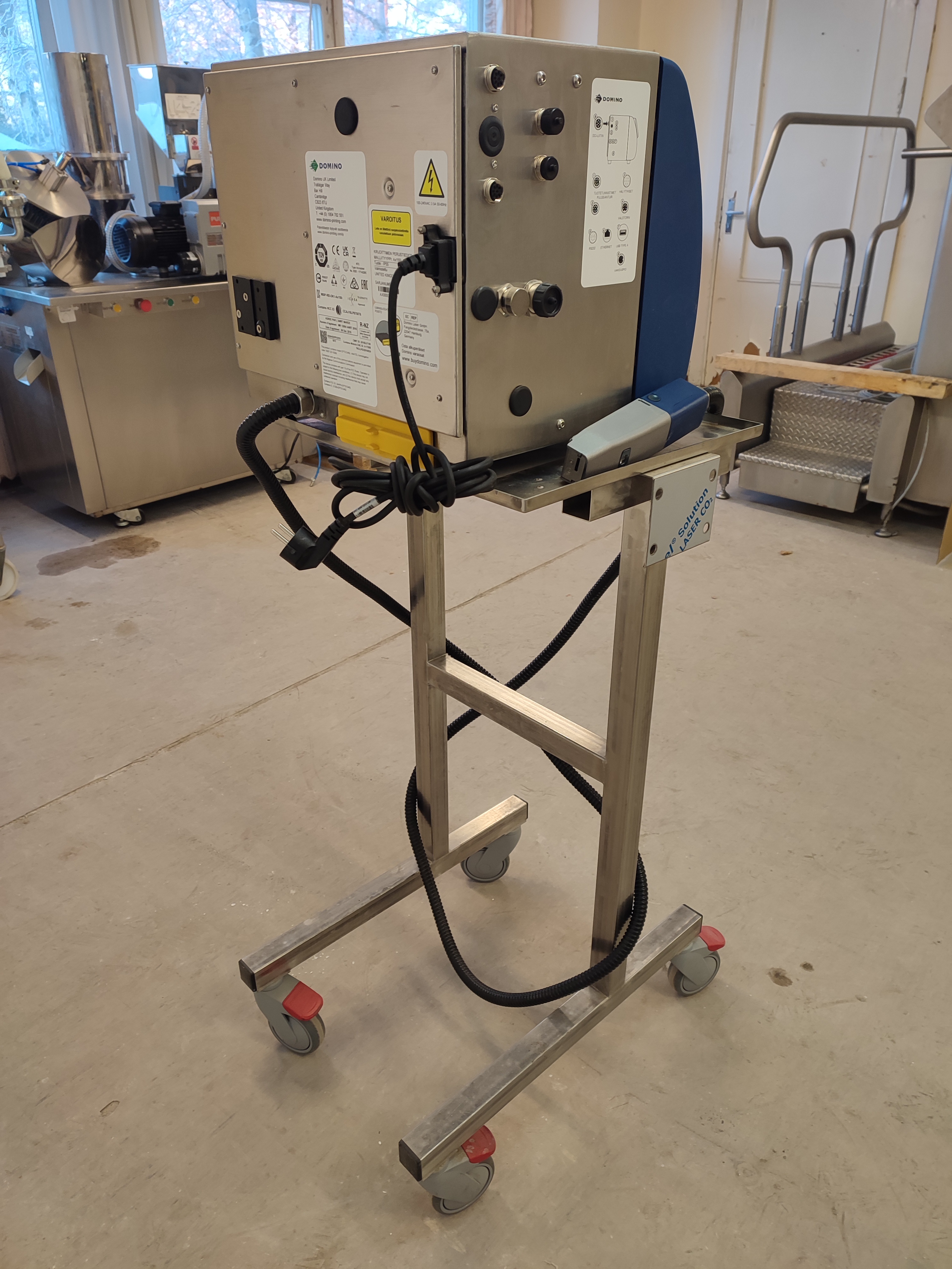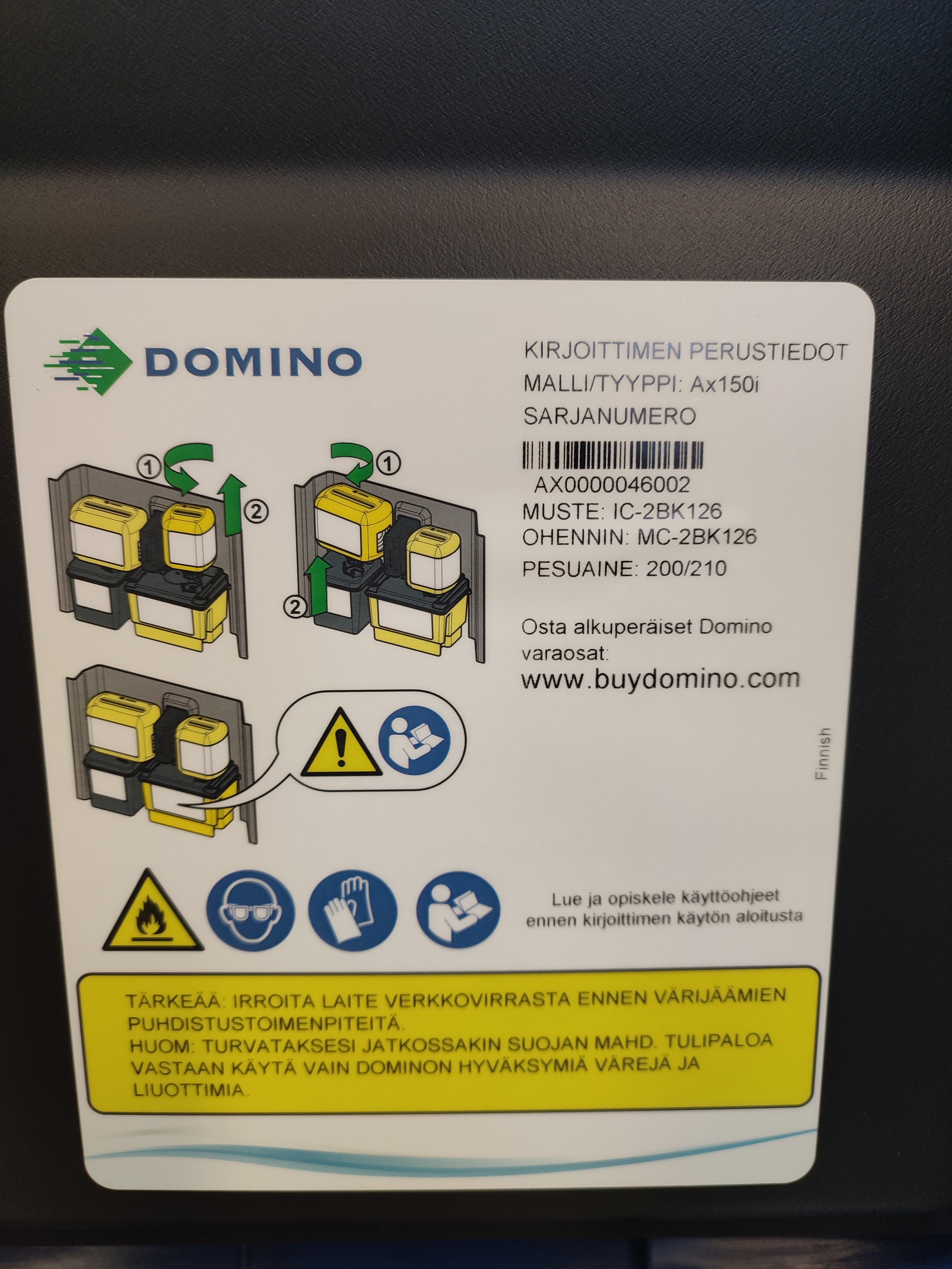 Domino mobile inkjet printer, model: Ax150i, serial number: AX0000046002, 100-240 V, 50-60 Hz, 3.5 A, dimensions: 500 mm x 610 mm x 1370 mm.