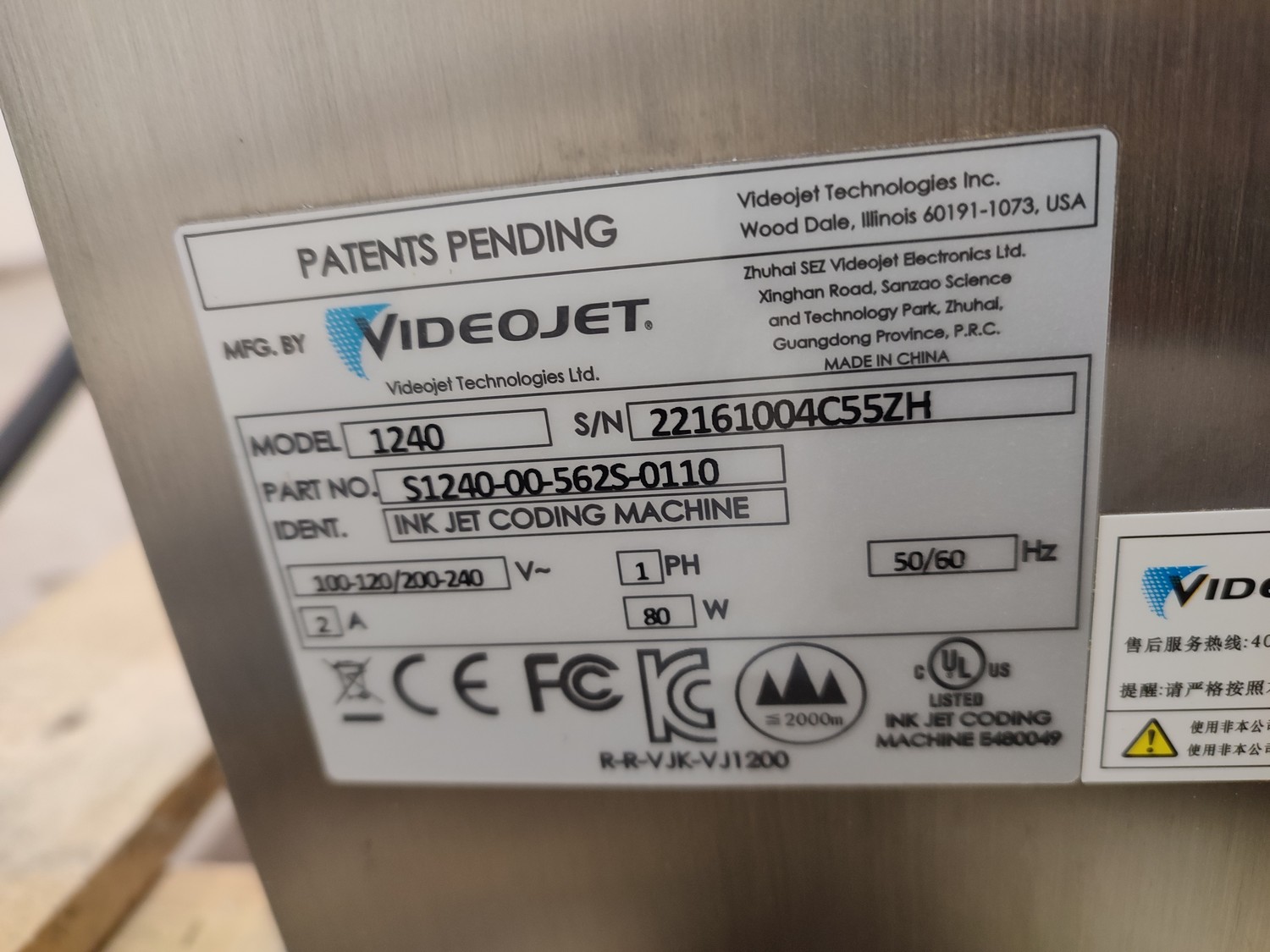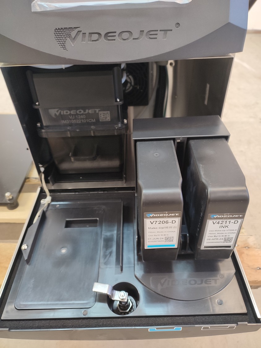 Videojet inkjet printer, model: 1240, serial number: 22161004C55ZH, 100-120/200-240 V, 50/60 Hz, 1 Ph, 2 A, 80 W, dimensions: 800 mm x 600 mm x 1660 mm.