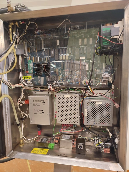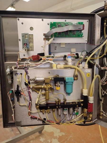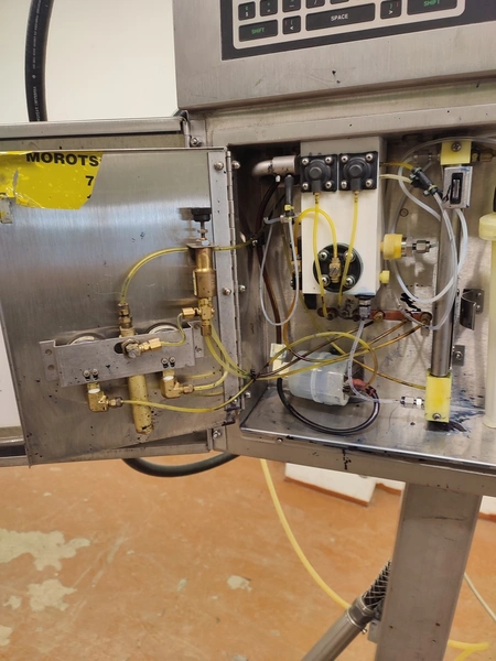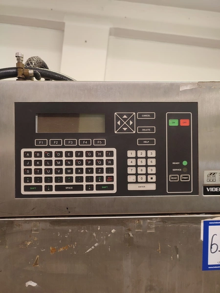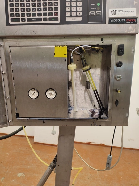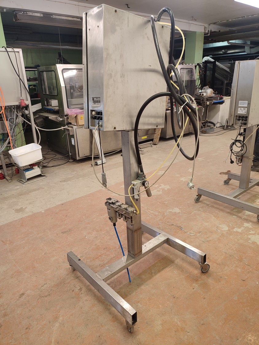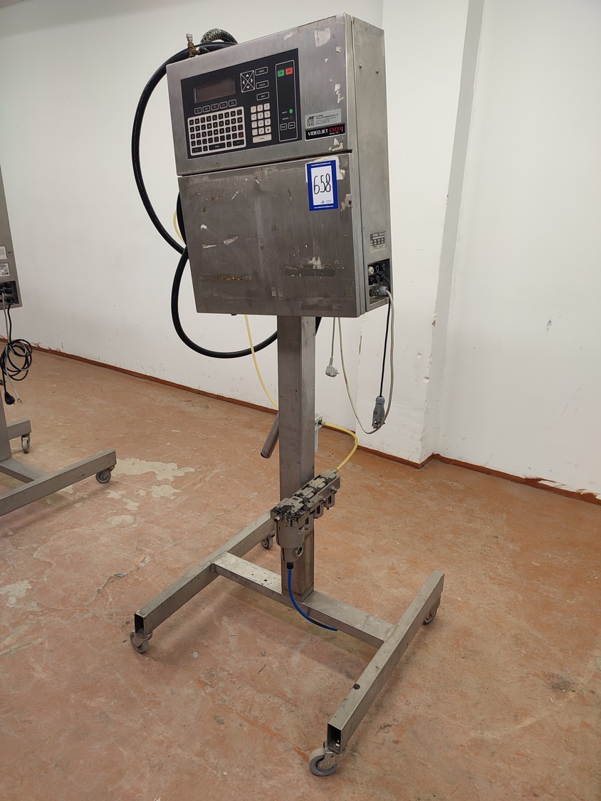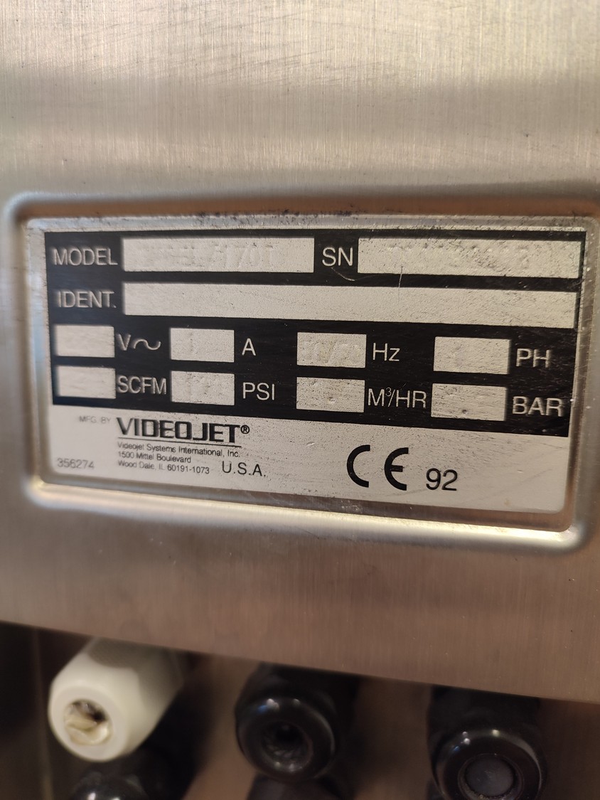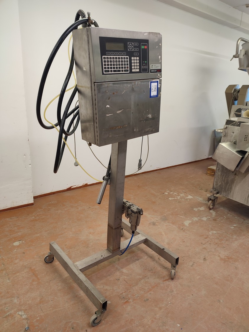 Videojet mobile inkjet printer, model: EXCEL/170i, serial number: I94A32302, 220 V, 1 Ph, 50/60 Hz, 1 A, dimensions: 750 mm x 750 mm x 1790 mm.