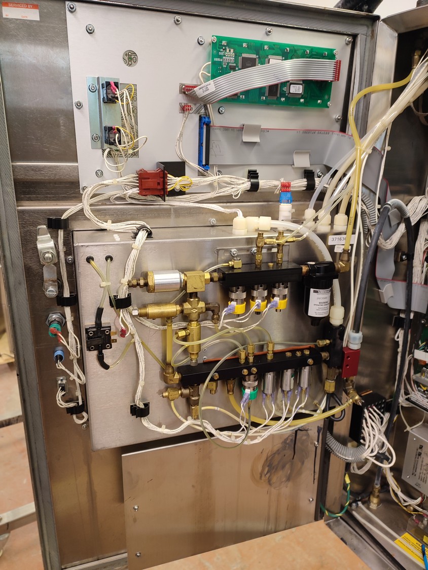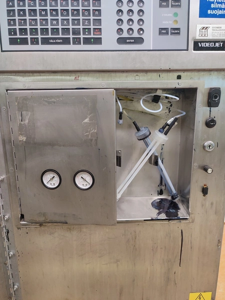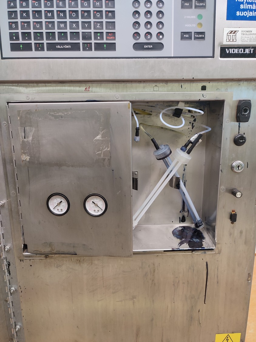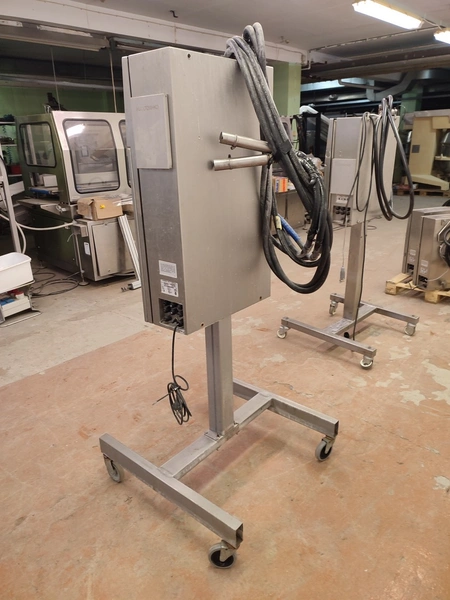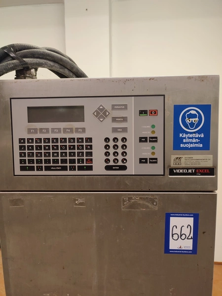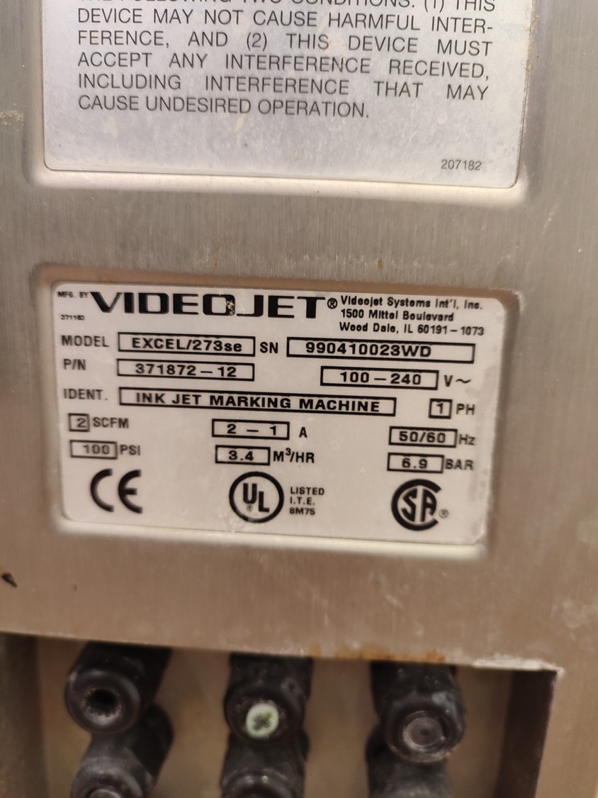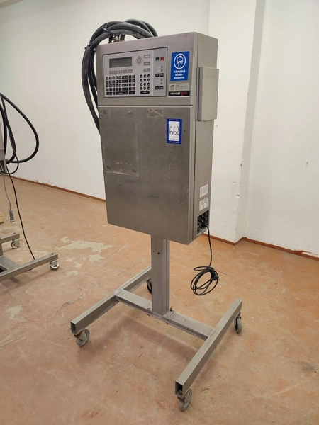 Videojet mobile inkjet printer, model: EXCEL/273se, serial number: 990410023WD, 100-240 V, 1 Ph, 50/60 Hz, 2-1 A, dimensions: 750 mm x 750 mm x 1750 mm.