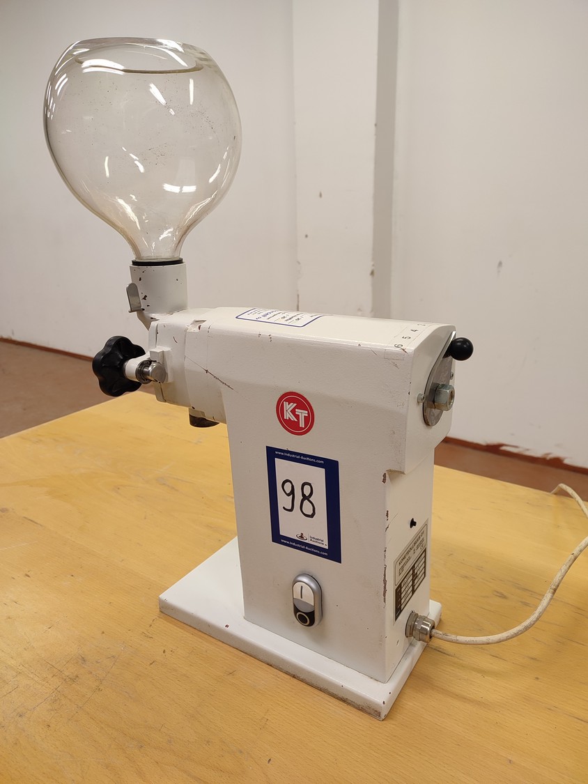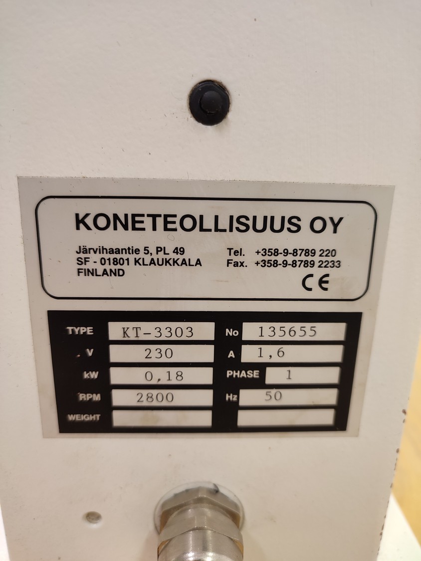 Koneteollisuus Oy laboratory mill, type: KT-3303, number: 135655, 230 V, 1.6 A, 0.18 kW, 1 Ph, 50 Hz, 2800 rpm, dimensions: 360 mm x 180 mm x 570 mm.