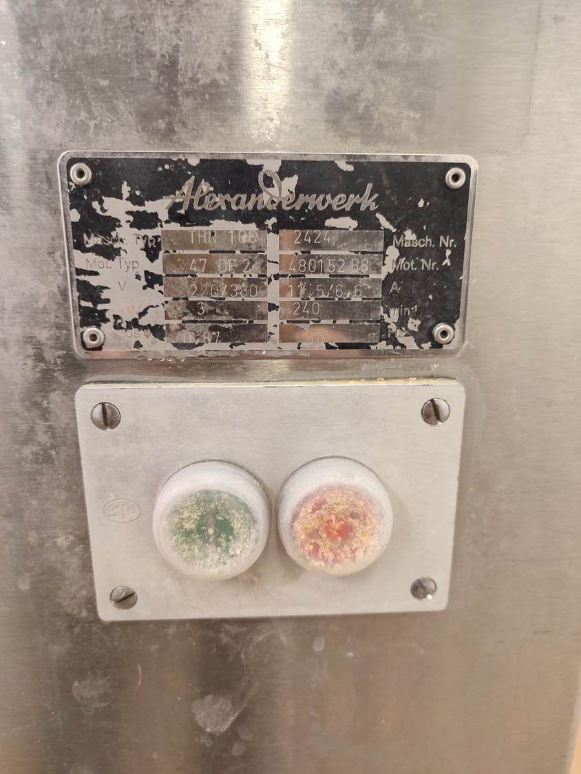 Alexanderwerk grinder, type: THN 106, machine number: 2424, 220/380 V, 50 Hz, 11.5/6.6 A, 3 kW, diameter plate: 106 mm, total dimensions: 570 mm x 1020 mm x 1035 mm.