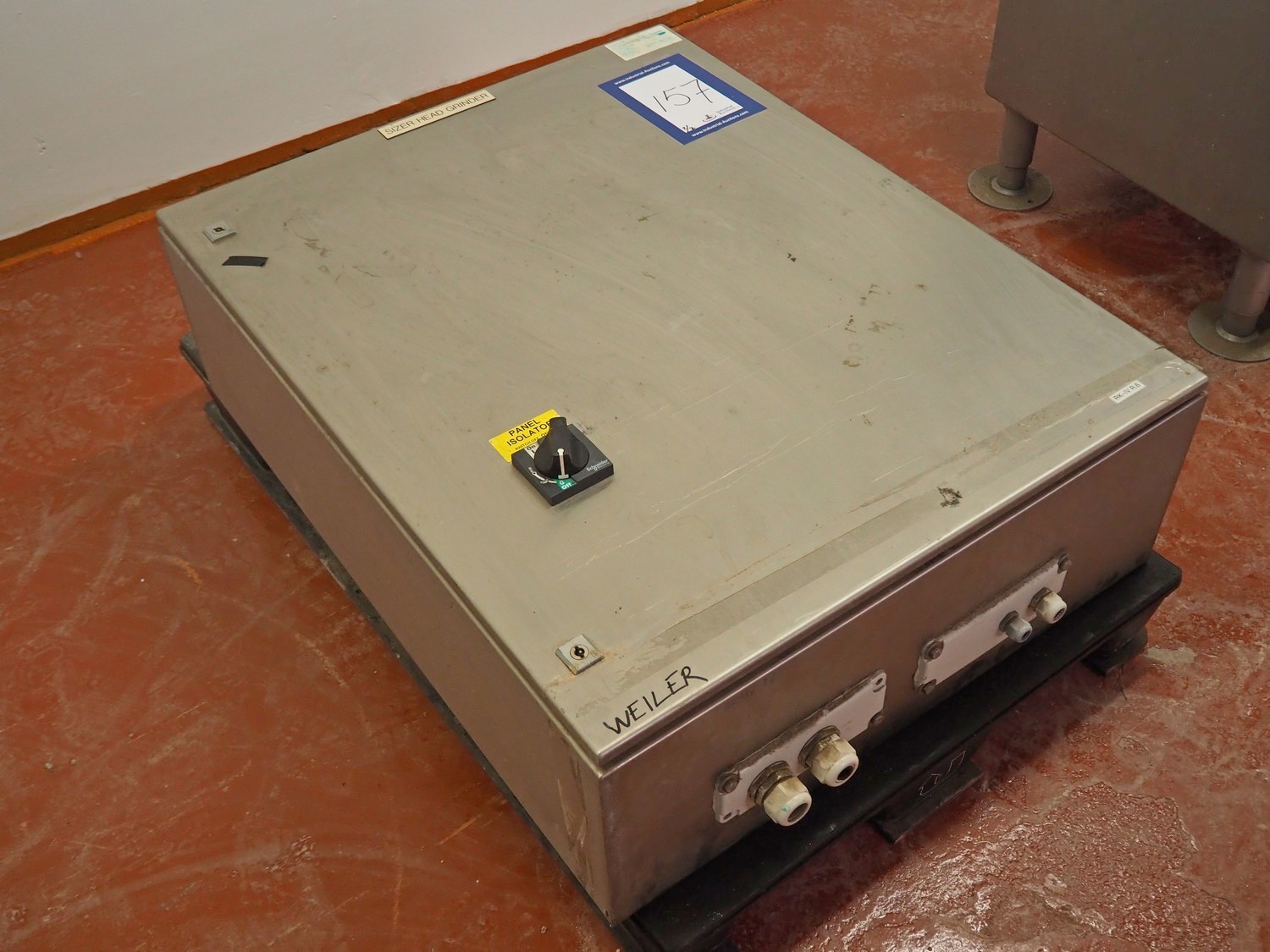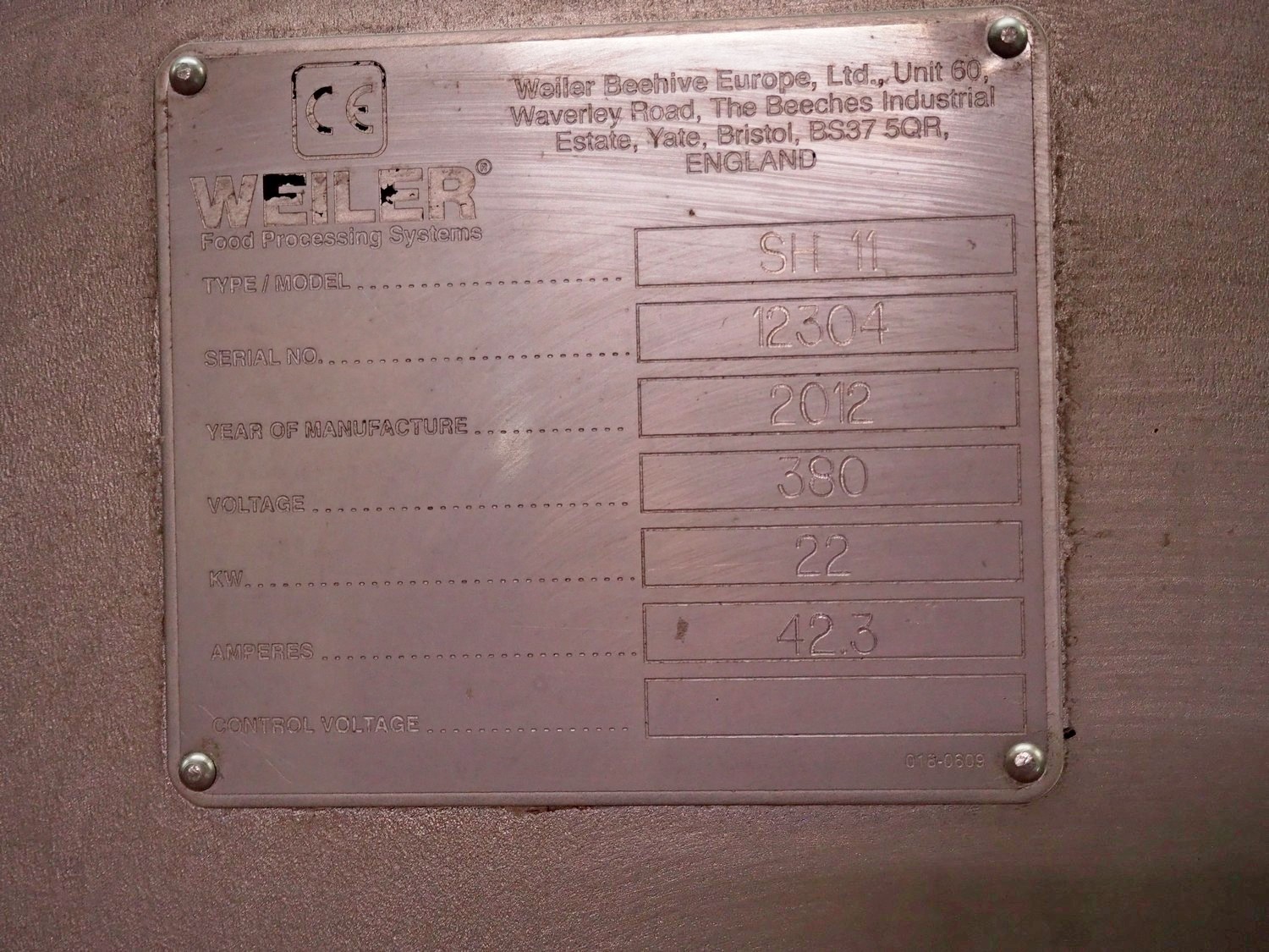 Weiler Beehive Europe, Ltd grinder, type: SH 11, serial number: 12304, year of construction: 2012, 280 V, 22 kW, 42.3 A, plate diameter: 280 mm, dimensions grinder: 920 mm x 1000 mm x 1500 mm, dimensions switch cabinet: 800 mm x 310 mm x 1000 mm. Incomplete.