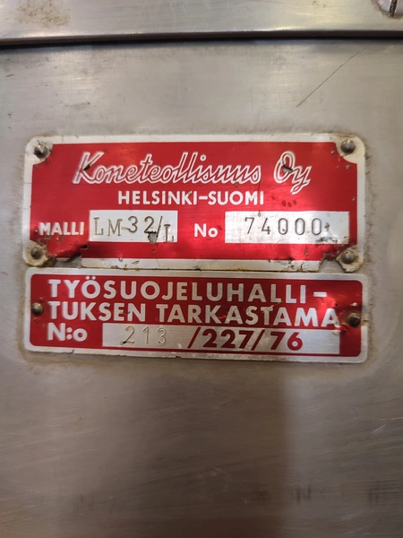 Koneteollisuus OY grinder, model: LM-32/L, number: 74000, diameter plate: 100 mm, total dimensions: 800 mm x 500 mm x 1000 mm.