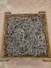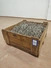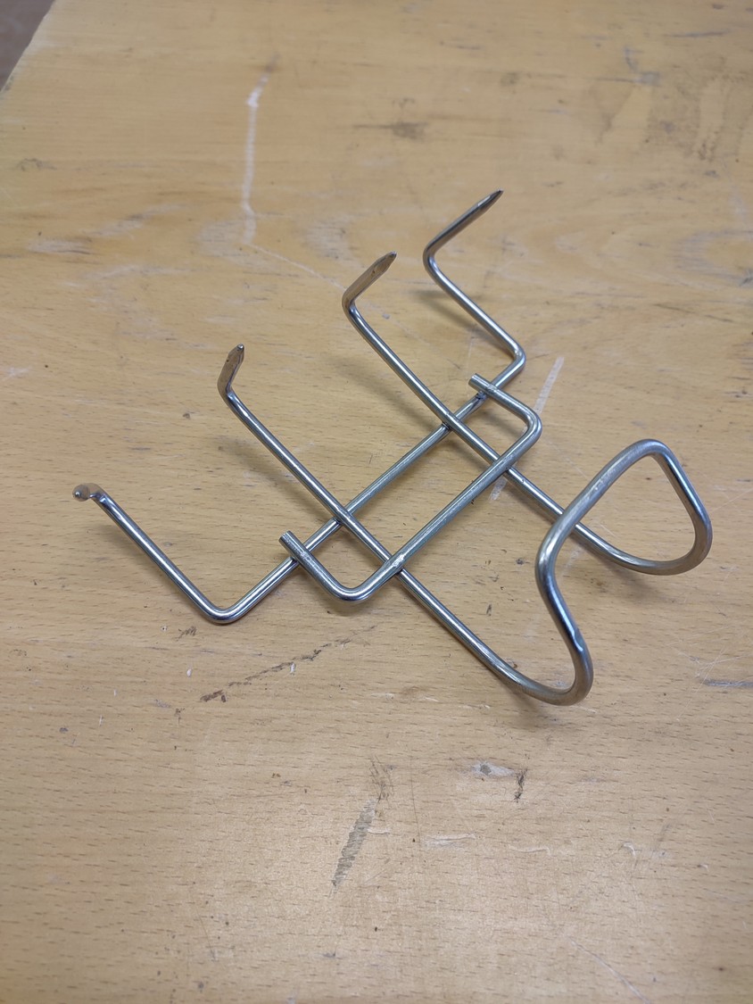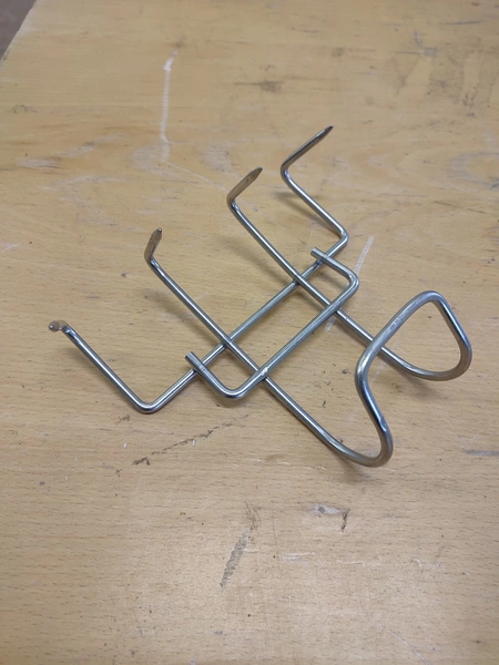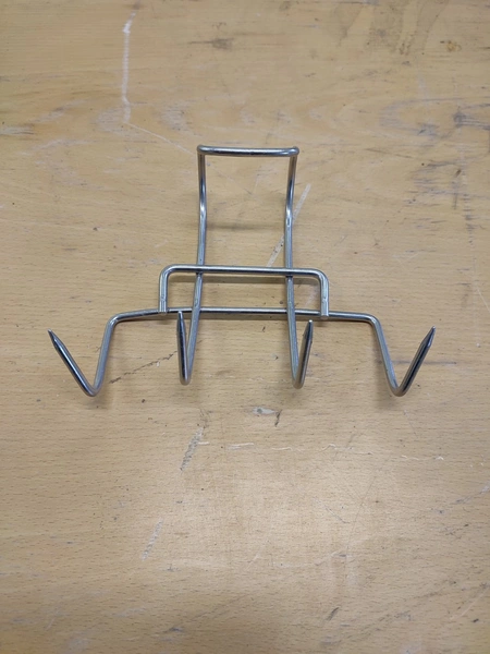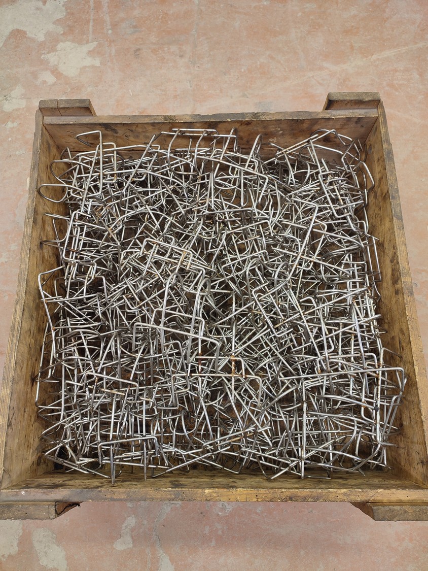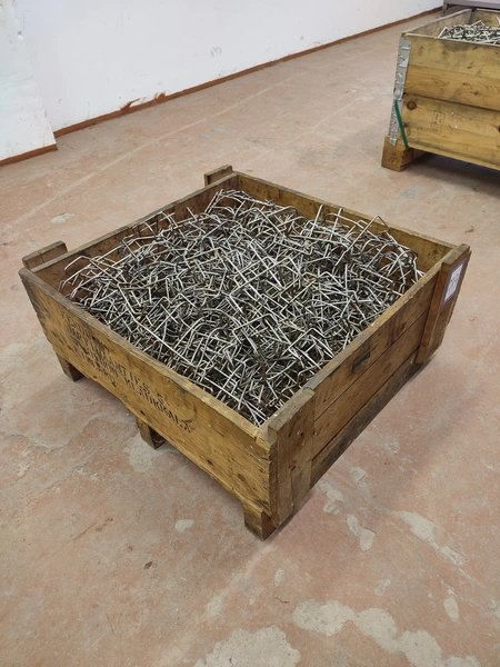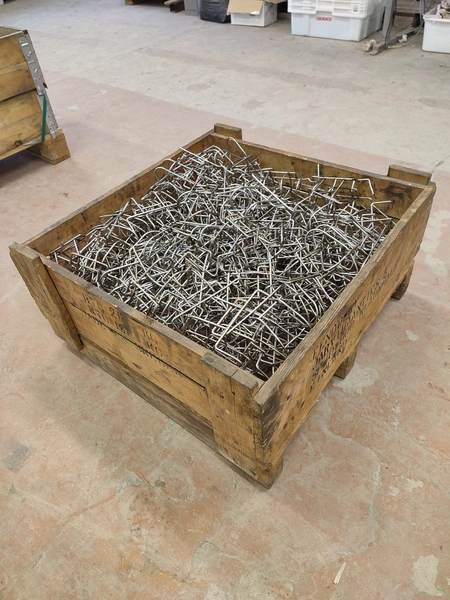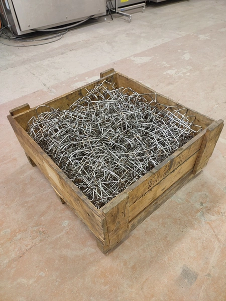 Wooden pallet box with large amount s/s meat hooks, approximately 180 pieces, 4 hooks per hanger, peg length: 40 mm, dimensions each hook: 160 mm x 40 mm x 150 mm, dimensions pallet box: 710 mm x 750 mm x 400 mm.