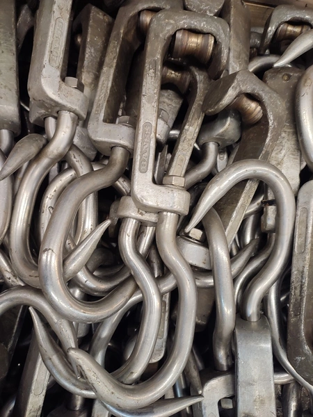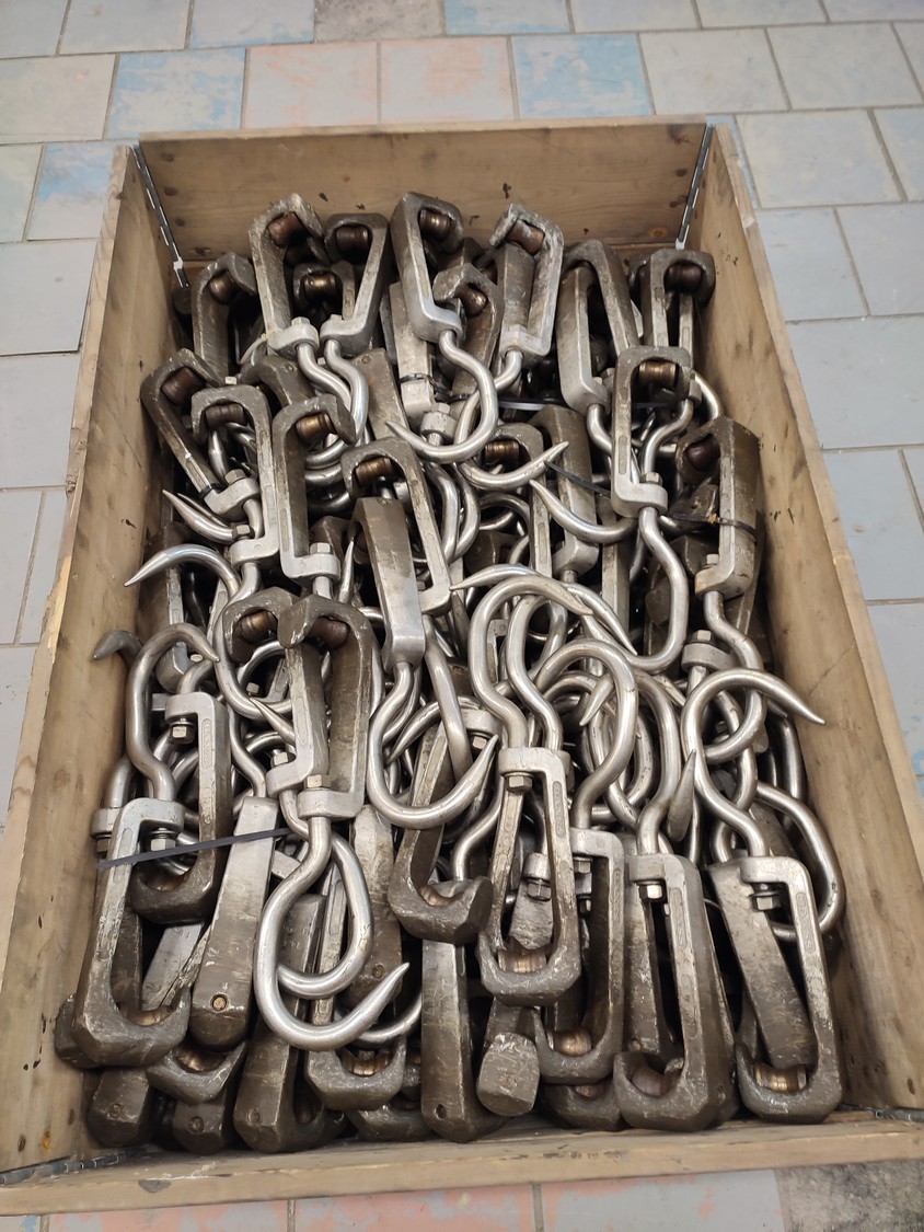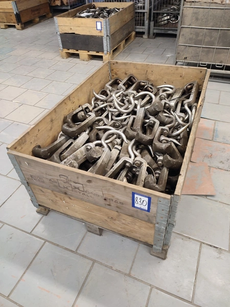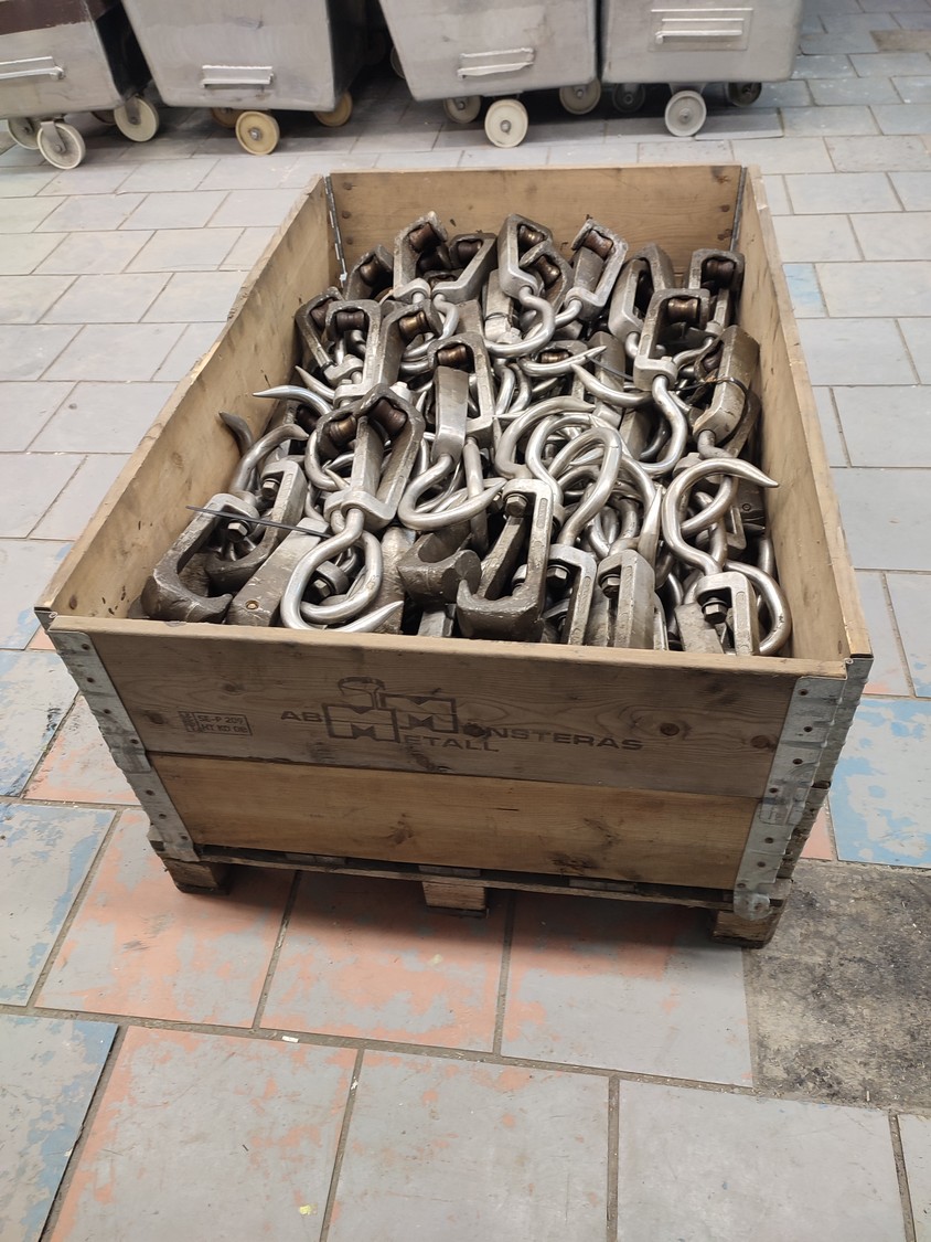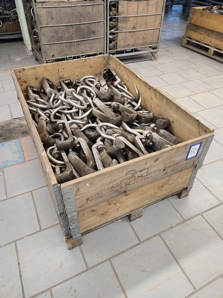 Wooden pallet box with 164 meat hooks, dimensions hooks: 440 mm x 145 mm x 50 mm, dimensions pallet box: 800 mm x 1200 mm x 540 mm.