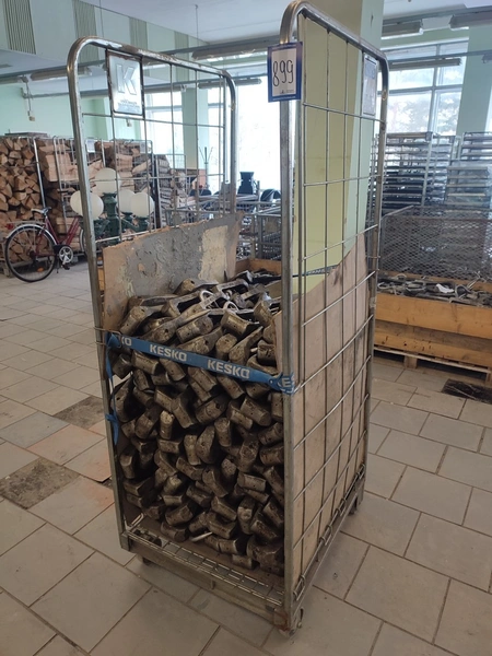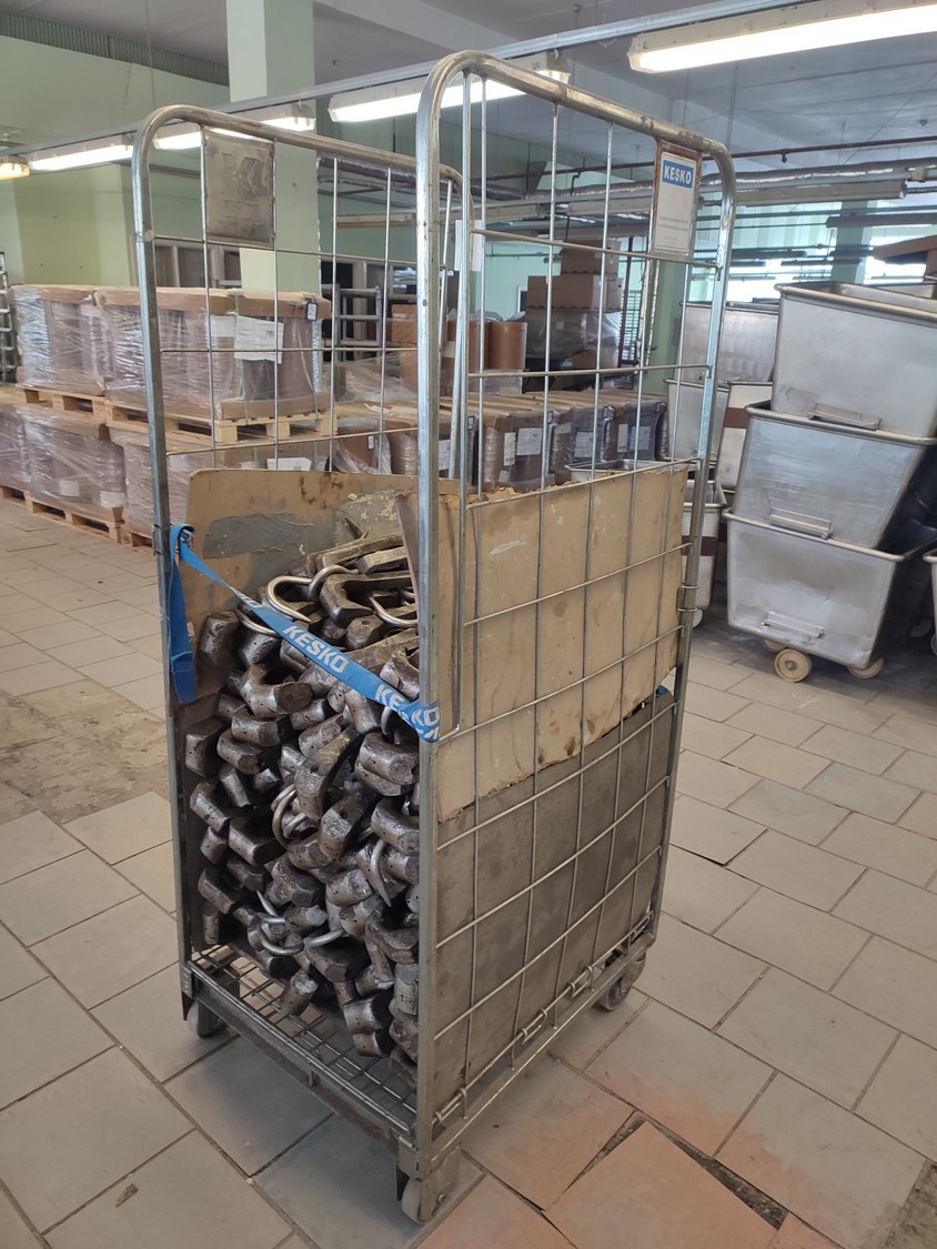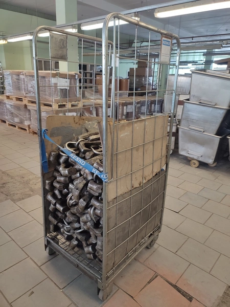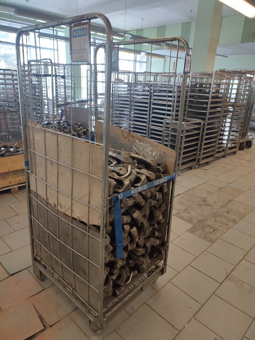 Steel container trolleys with 320 meat hooks, dimensions hooks: 360 mm x 115 mm x 50 mm, dimensions trolleys: 680 mm x 800 mm x 1755 mm.